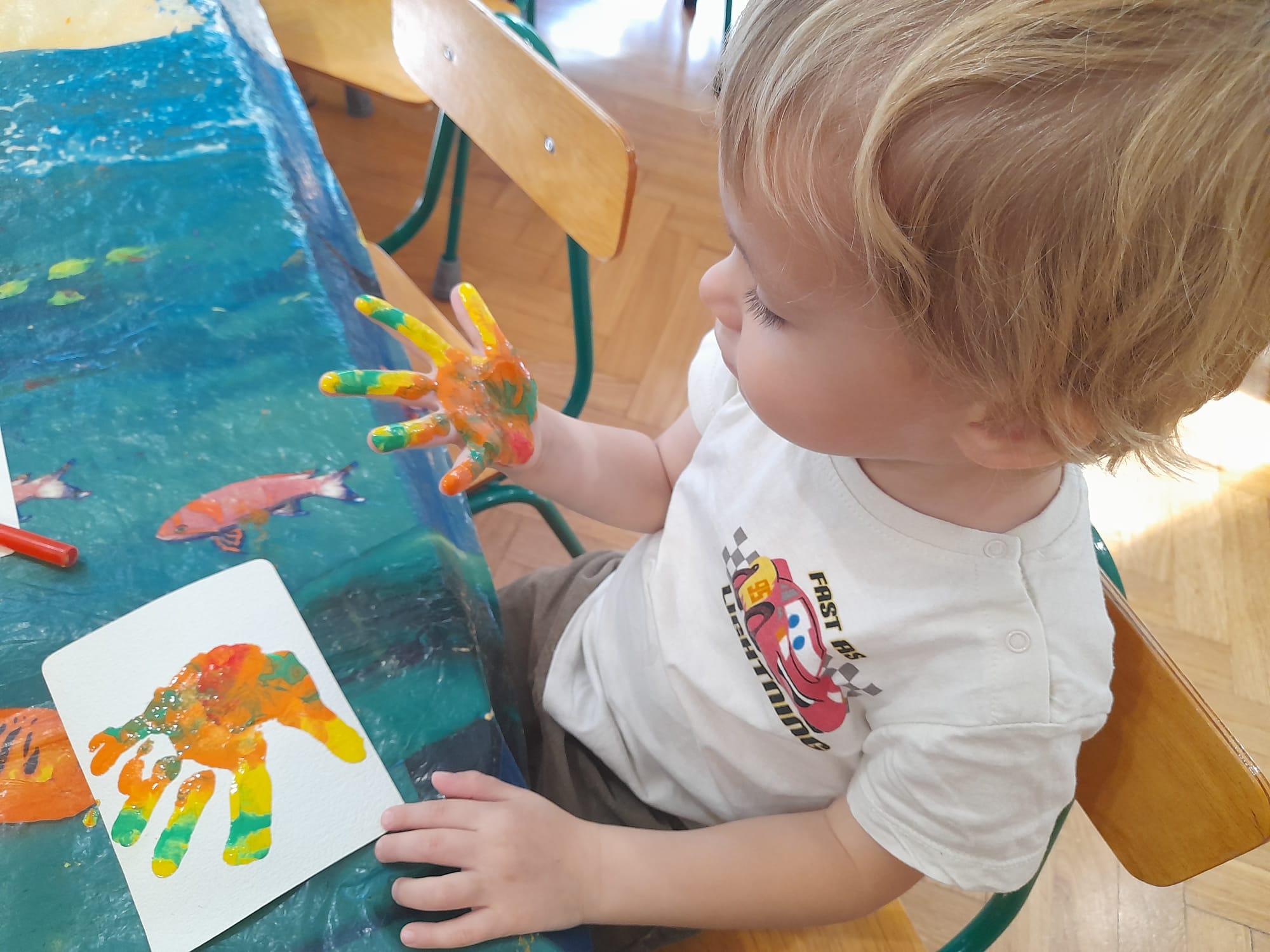 Kilka dni temu nasze przedszkolaki zamieniły się w małych artystów. Rączki poszły w ruch – a dokładnie w kolorową farbę. Na papierze pojawiły się barwne odciski dłoni. Maluchy z zaciekawieniem obserwowały, jak kolory łączą się np. z niebieskiego i żółtego robi się….zielony. Były okrzyki radości, zdziwione miny i oczywiście kilka farbkowych pieczątek na noskach.