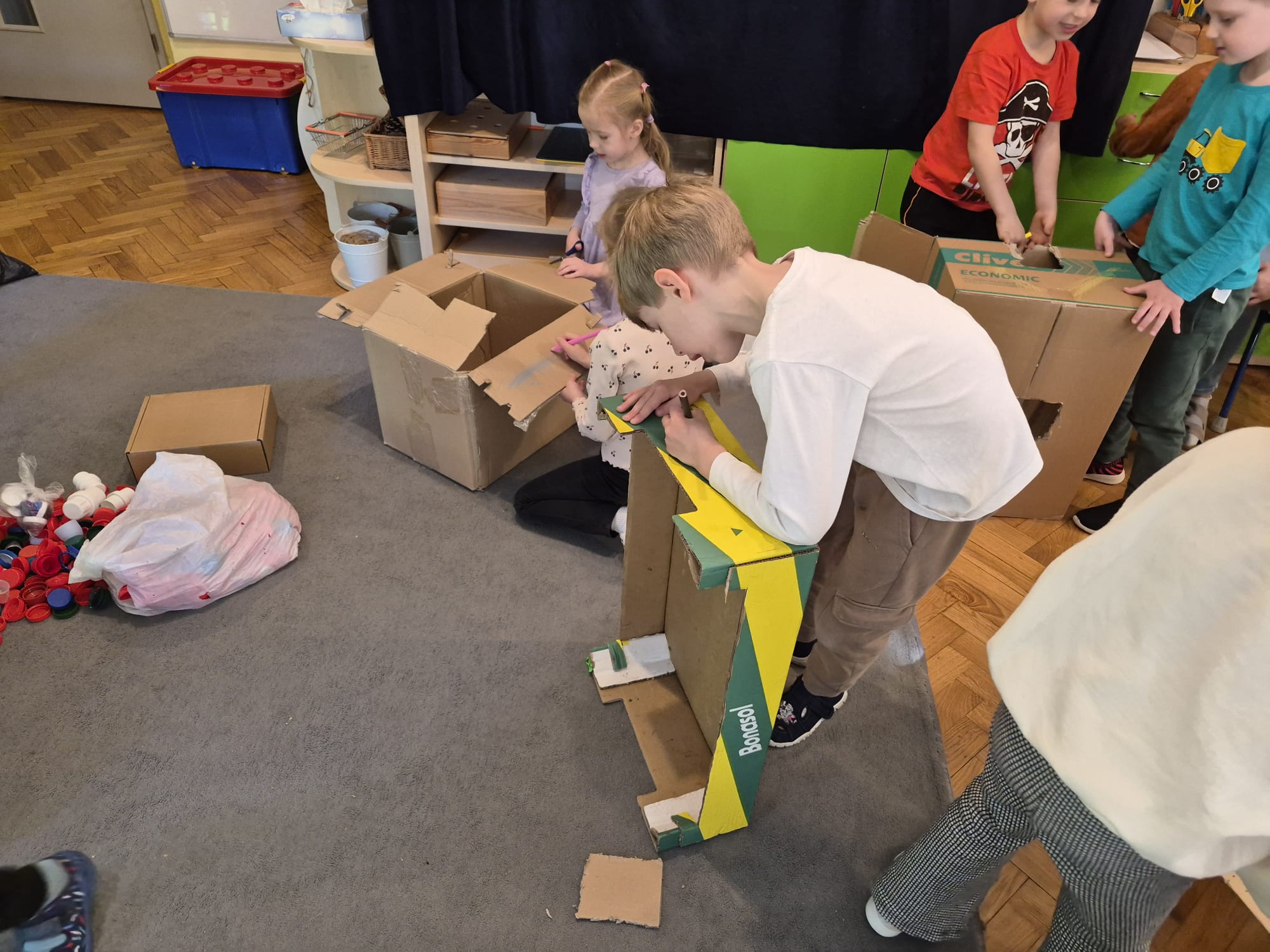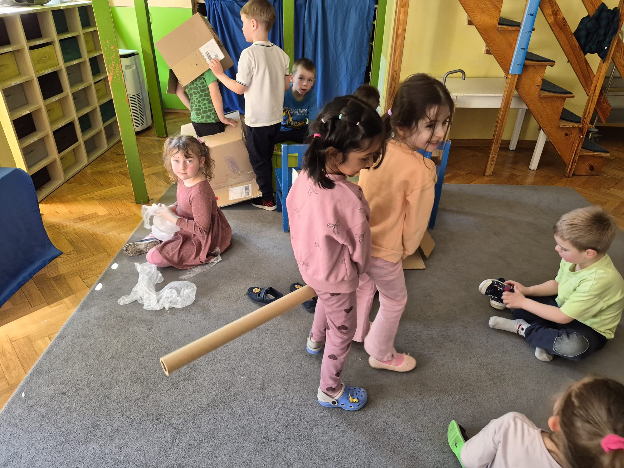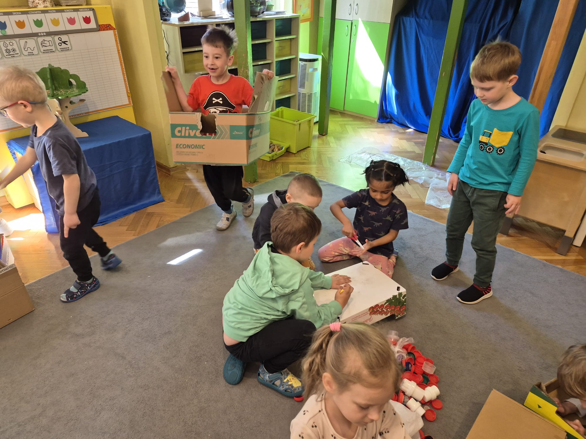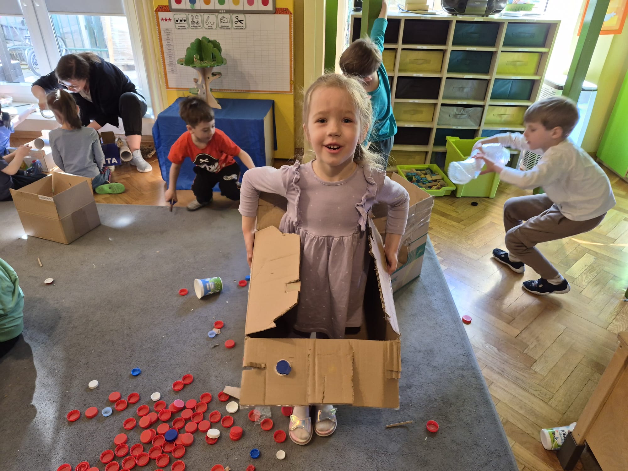 W piątek 24 kwietnia najstarsze Przedszkolaki zakończyły tydzień pt.”Dbamy o naszą Planetę Ziemię”. Te 5 dni dzieci i nauczyciele zapamiętają na długo nie tylko ze względu na ważne tematy poruszane na zajęciach ekologicznych, ale głównie przez „wulkan kreatywności”, który wybuchł w tym okresie w grupie!:) A zaczęło się wszystko w poniedziałek 20.04.,gdy Pani Ewa -po zajęciach ekologicznych -ogłosiła „Tydzień Bez Gotowych Zabawek” i razem z innymi Paniami przykryła zasłonami wszystkie szafy z pojemnikami pełnymi plastikowych zestawów do zabawy, zostawiając tylko drewniane klocki oraz dostęp do kolorowanek, kredek, nożyczek i kleju, a wystawiła na dywan : wielkie pudełka kartonowe, butelki i wiaderka plastikowe, duże rolki po wykładzinach lub dywanikach, pojemniczki po jogurtach i śmietanie, wysypała różnokolorowe nakrętki oraz rozwinęła folię bąbelkową. Po początkowych okrzykach: O nie! Śmieci! Czym my się teraz będziemy bawić? powoli zaczęły pojawiać na twarzach dzieci uśmiechy i po przedstawieniu przez nauczycieli możliwości wykorzystania tych surowców wtórnych i deklaracji pomocy przy łączeniach materiałów lub przecinaniu czegoś ,ukazała się oczom wszystkim Potęga Wyobraźni Dziecięcej !!! Samochody, rakiety, samoloty, łóżeczka dziecięce, pizza pepperoni, komin, konik, buda dla pieska, myjnia i zjeżdżalnia dla samochodów, sukienka z folii bąbelkowej , a w kolejnych dniach gra w kręgle jogurtowe, skoki przez przeszkody ,mur chiński, zbroja rycerska, robot, różne gry i zabawy zręcznościowe itd. Jako, że surowce wtórne grały główną rolę w tym tygodniu, nie mogło zabraknąć zajęć i zabaw ruchowych związanych z recyklingiem i segregacją śmieci, pojemniki na śmieci wystąpiły również jako aktorzy w teatrzyku pt.”Który kosz jest najważniejszy?”:) W Dniu Ziemi 22 kwietnia Starszaki wzięły udział w ogólnopolskiej akcji „Sprzątanie Świata” oraz cały tydzień śpiewały pięknie -ilustrując ruchem tekst- Hymn Ekoprzedszkolaków z „Zaczarowanego Ziarenka” czyli „Cały świat jest w naszych rękach”. W piątek 24 kwietnia wykonały jeszcze rano śliczne wielokolorowe zakładki do książek z hasłami ekologicznymi , które każde z dzieci uznało za najważniejsze wg. niego , by ratować Naszą Planetę, a po południu odbył się ekologiczny seans filmowy, na którym to m.in. zwierzątka leśne poprosiły dzieci ,by razem z dorosłymi zatroszczyły się o los Ziemi po prostu zachowując proste zasady ekologiczne na co dzień! Pozostaje mieć nadzieję, że ten trochę szalony , ale jakże ważny dydaktycznie tydzień, pozostawi w głowach i sercach dorosłych oraz dzieci trwałą potrzebę troski o los Naszej Planety- dla dobra przecież nas wszystkich , a rozbudzona wyobraźnia i chęć tworzenia nowych rzeczy zaprocentuje sukcesami w dalszej edukacji Przedszkolaków, a potem Szkolniaków:)