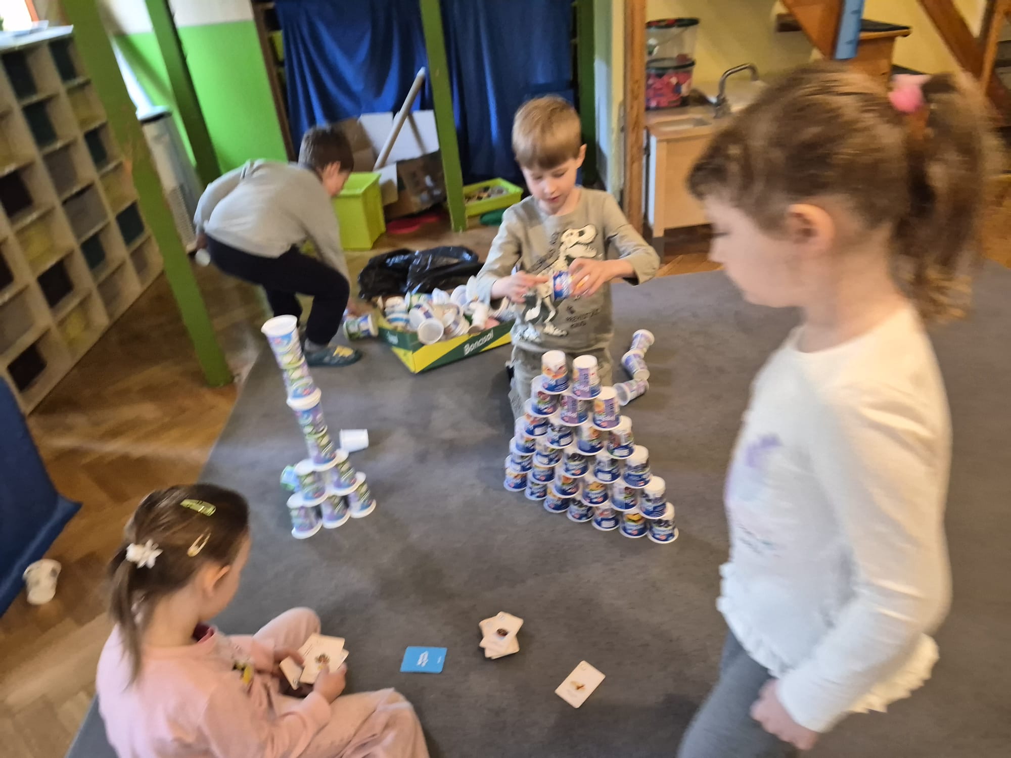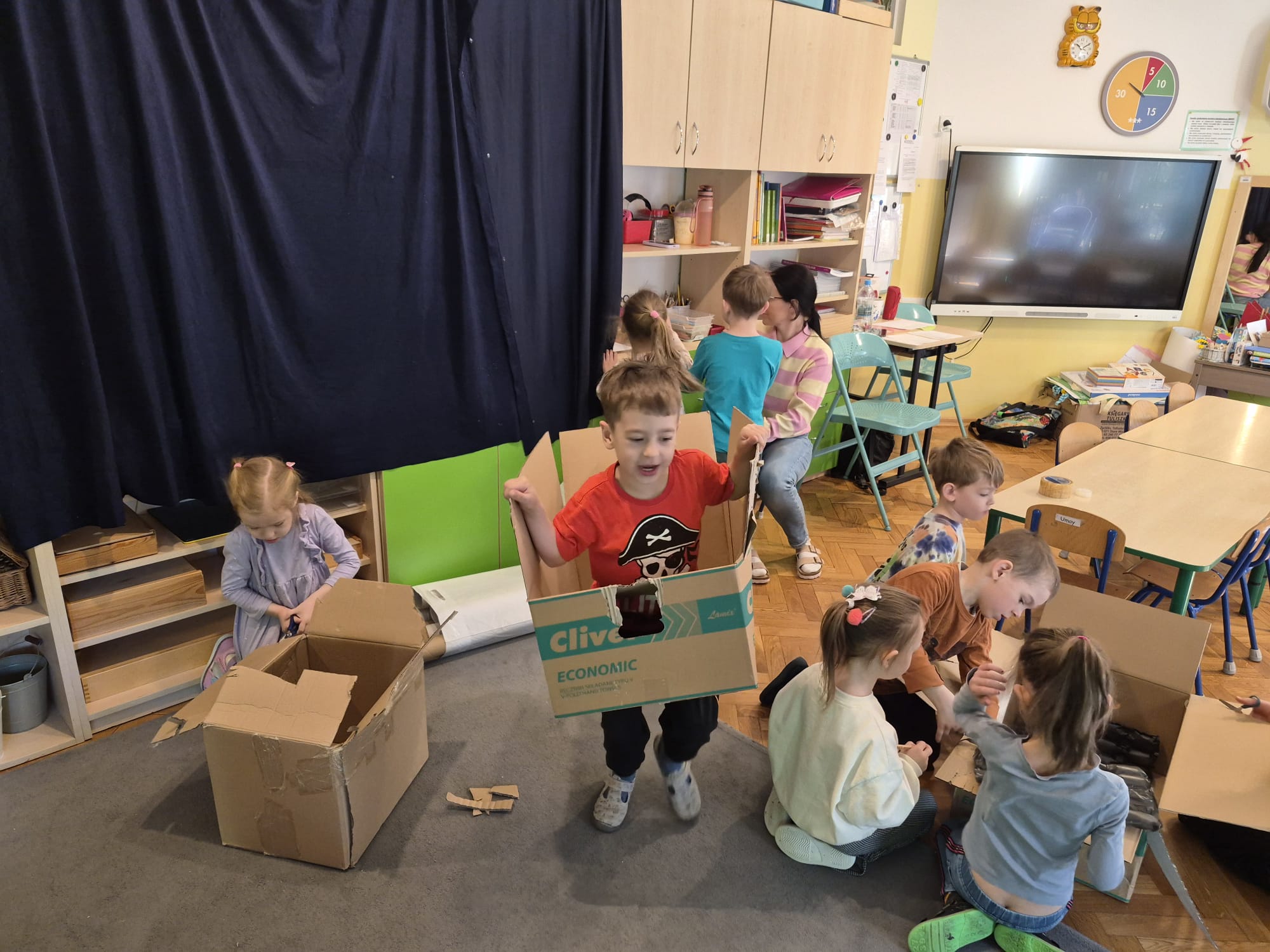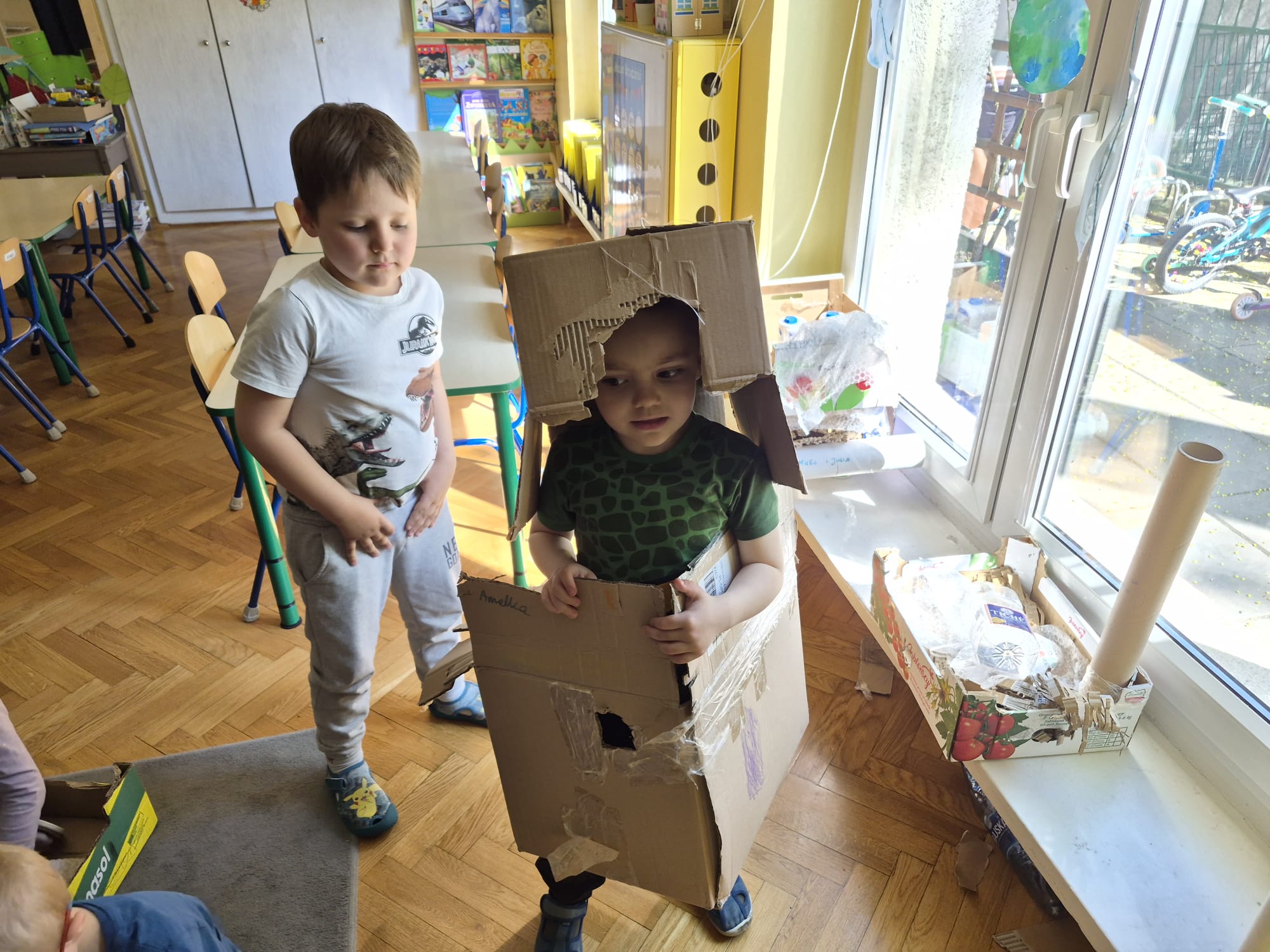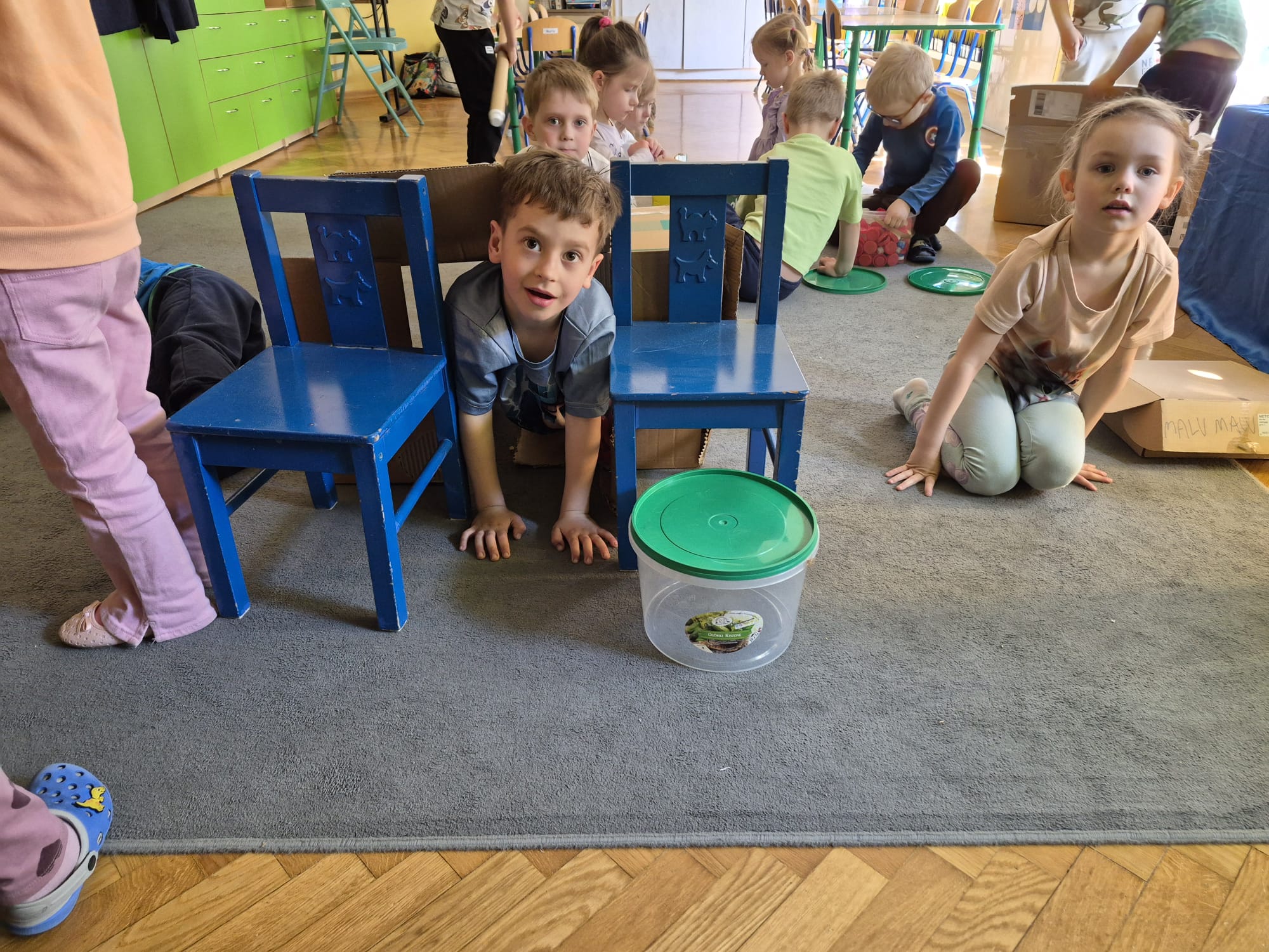 W piątek 24 kwietnia najstarsze Przedszkolaki zakończyły tydzień pt.”Dbamy o naszą Planetę Ziemię”. Te 5 dni dzieci i nauczyciele zapamiętają na długo nie tylko ze względu na ważne tematy poruszane na zajęciach ekologicznych, ale głównie przez „wulkan kreatywności”, który wybuchł w tym okresie w grupie!:) A zaczęło się wszystko w poniedziałek 20.04.,gdy Pani Ewa -po zajęciach ekologicznych -ogłosiła „Tydzień Bez Gotowych Zabawek” i razem z innymi Paniami przykryła zasłonami wszystkie szafy z pojemnikami pełnymi plastikowych zestawów do zabawy, zostawiając tylko drewniane klocki oraz dostęp do kolorowanek, kredek, nożyczek i kleju, a wystawiła na dywan : wielkie pudełka kartonowe, butelki i wiaderka plastikowe, duże rolki po wykładzinach lub dywanikach, pojemniczki po jogurtach i śmietanie, wysypała różnokolorowe nakrętki oraz rozwinęła folię bąbelkową. Po początkowych okrzykach: O nie! Śmieci! Czym my się teraz będziemy bawić? powoli zaczęły pojawiać na twarzach dzieci uśmiechy i po przedstawieniu przez nauczycieli możliwości wykorzystania tych surowców wtórnych i deklaracji pomocy przy łączeniach materiałów lub przecinaniu czegoś ,ukazała się oczom wszystkim Potęga Wyobraźni Dziecięcej !!! Samochody, rakiety, samoloty, łóżeczka dziecięce, pizza pepperoni, komin, konik, buda dla pieska, myjnia i zjeżdżalnia dla samochodów, sukienka z folii bąbelkowej , a w kolejnych dniach gra w kręgle jogurtowe, skoki przez przeszkody ,mur chiński, zbroja rycerska, robot, różne gry i zabawy zręcznościowe itd. Jako, że surowce wtórne grały główną rolę w tym tygodniu, nie mogło zabraknąć zajęć i zabaw ruchowych związanych z recyklingiem i segregacją śmieci, pojemniki na śmieci wystąpiły również jako aktorzy w teatrzyku pt.”Który kosz jest najważniejszy?”:) W Dniu Ziemi 22 kwietnia Starszaki wzięły udział w ogólnopolskiej akcji „Sprzątanie Świata” oraz cały tydzień śpiewały pięknie -ilustrując ruchem tekst- Hymn Ekoprzedszkolaków z „Zaczarowanego Ziarenka” czyli „Cały świat jest w naszych rękach”. W piątek 24 kwietnia wykonały jeszcze rano śliczne wielokolorowe zakładki do książek z hasłami ekologicznymi , które każde z dzieci uznało za najważniejsze wg. niego , by ratować Naszą Planetę, a po południu odbył się ekologiczny seans filmowy, na którym to m.in. zwierzątka leśne poprosiły dzieci ,by razem z dorosłymi zatroszczyły się o los Ziemi po prostu zachowując proste zasady ekologiczne na co dzień! Pozostaje mieć nadzieję, że ten trochę szalony , ale jakże ważny dydaktycznie tydzień, pozostawi w głowach i sercach dorosłych oraz dzieci trwałą potrzebę troski o los Naszej Planety- dla dobra przecież nas wszystkich , a rozbudzona wyobraźnia i chęć tworzenia nowych rzeczy zaprocentuje sukcesami w dalszej edukacji Przedszkolaków, a potem Szkolniaków:)