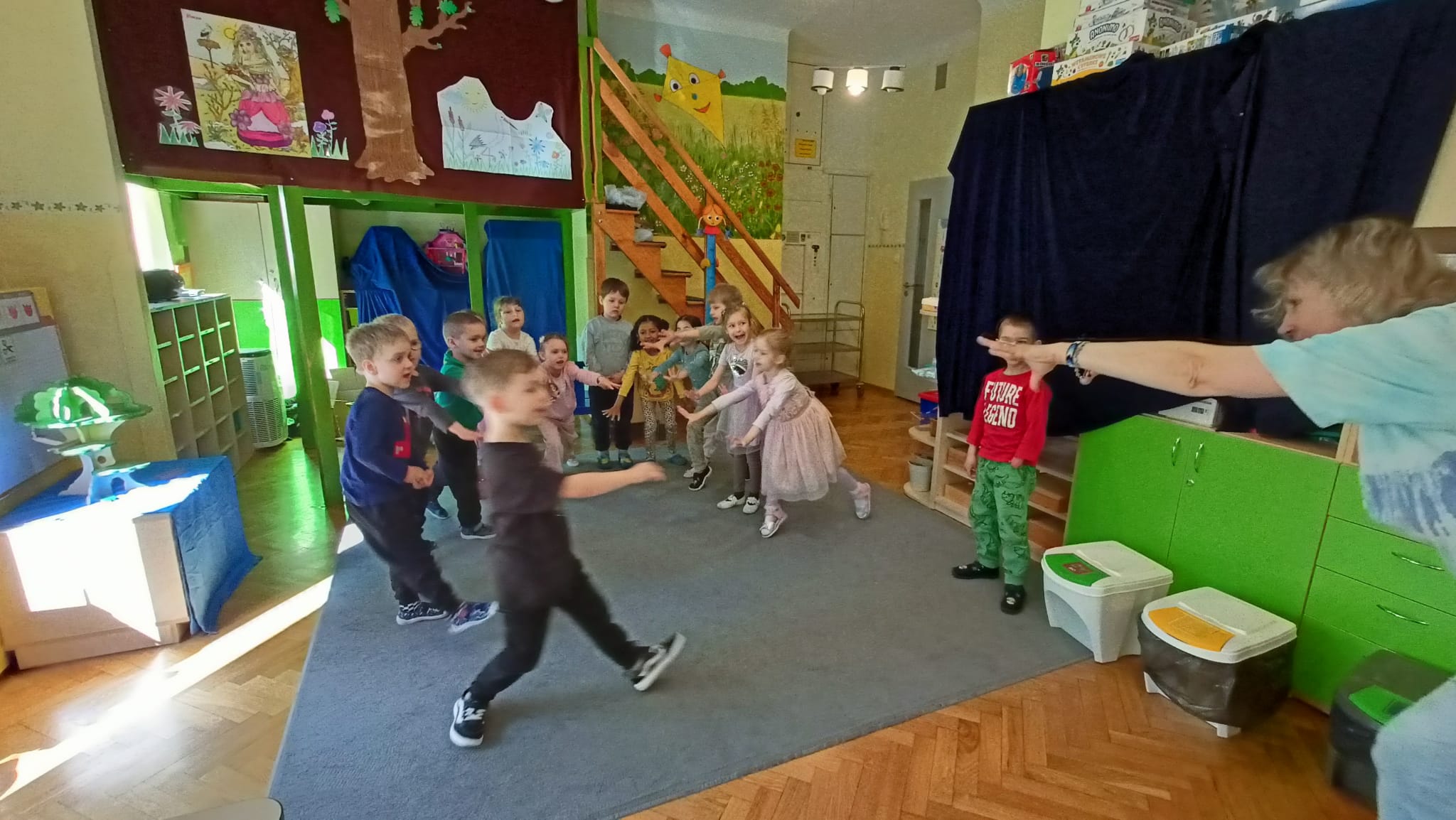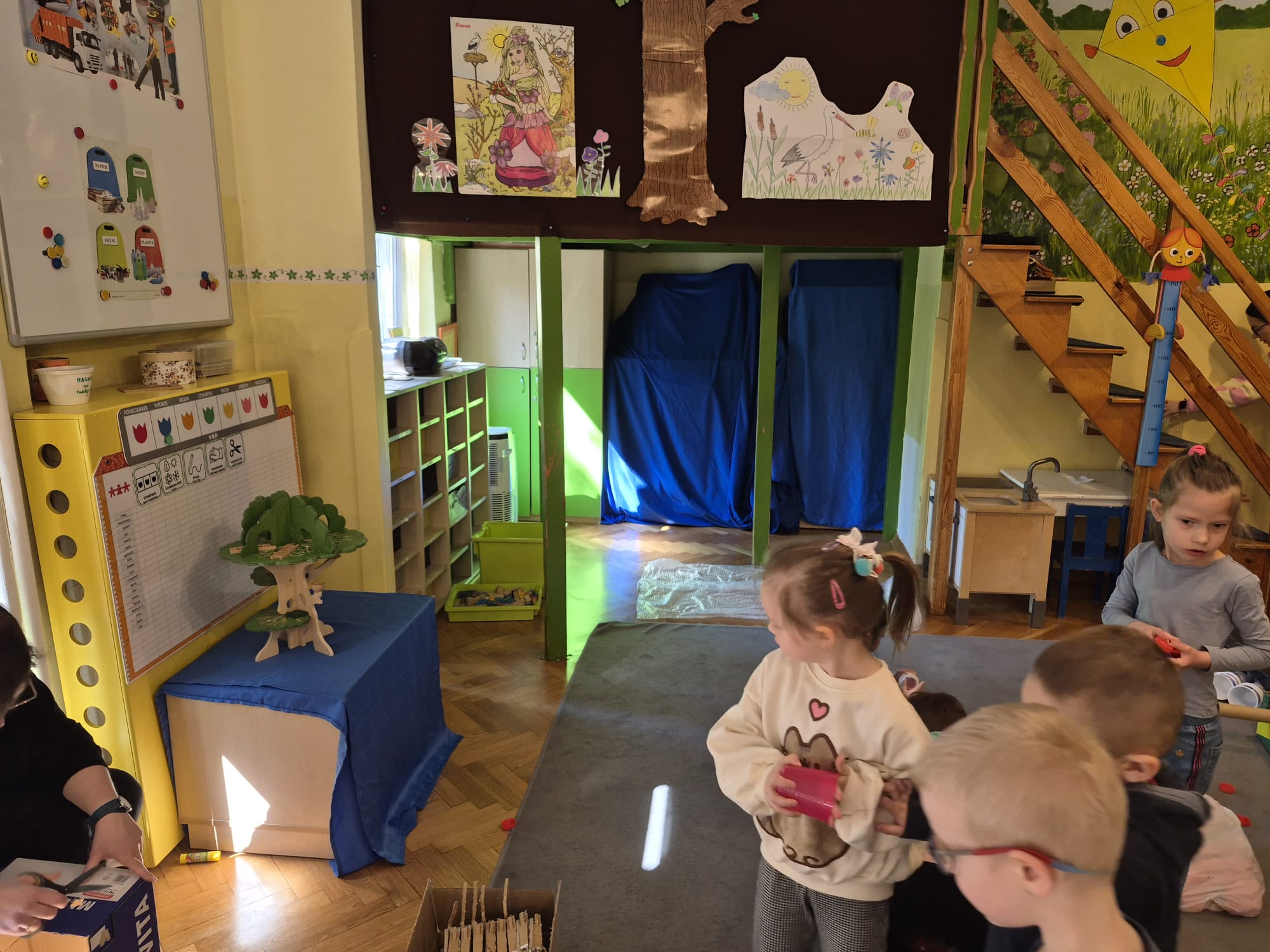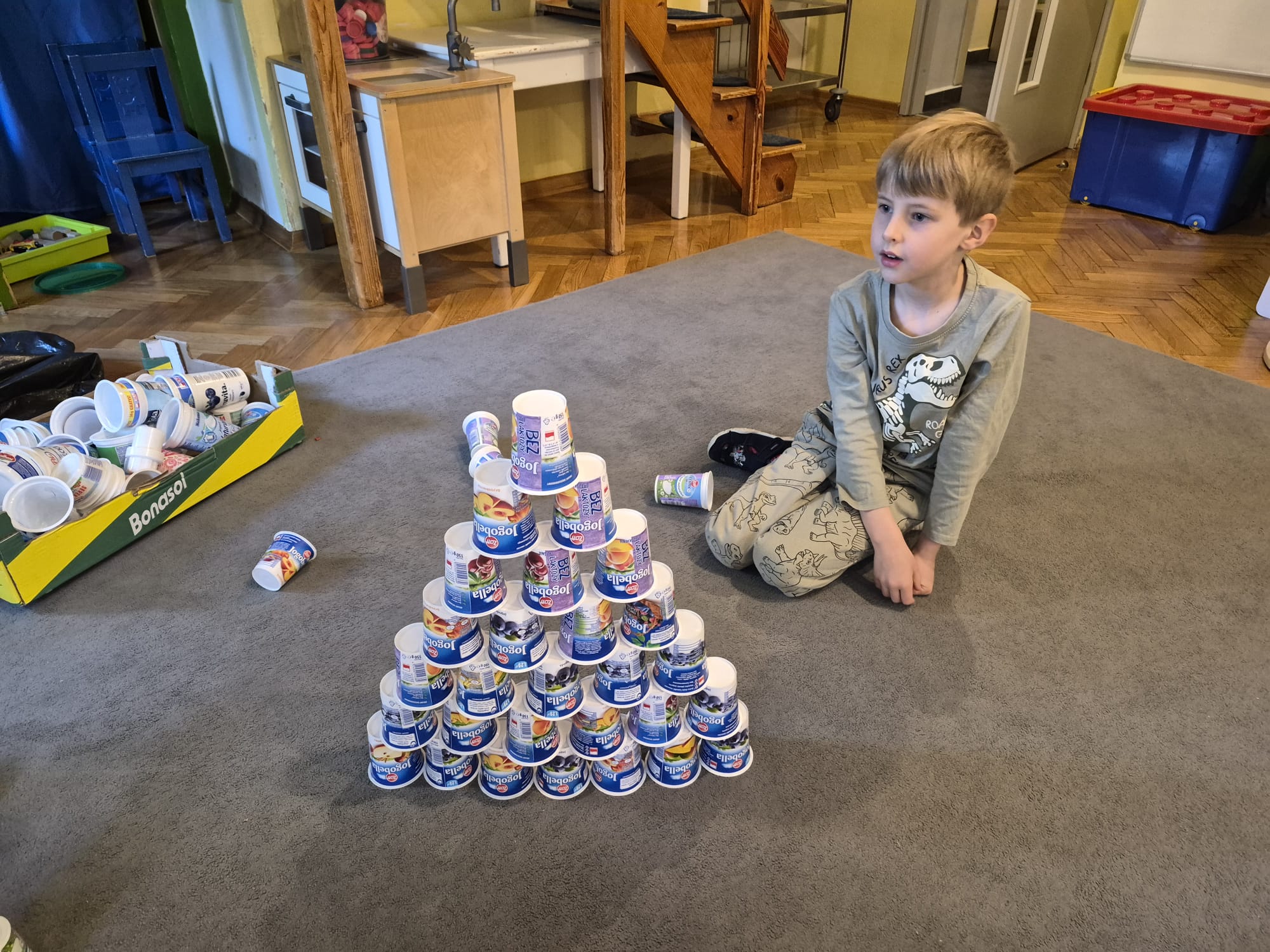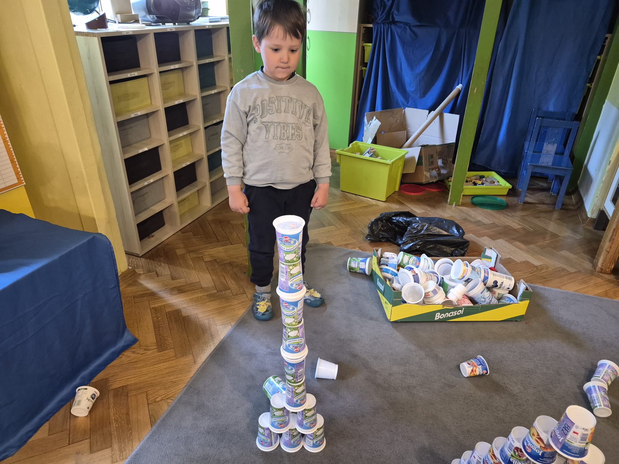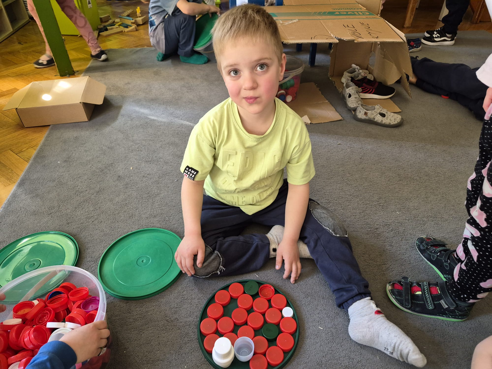 W piątek 24 kwietnia najstarsze Przedszkolaki zakończyły tydzień pt.”Dbamy o naszą Planetę Ziemię”. Te 5 dni dzieci i nauczyciele zapamiętają na długo nie tylko ze względu na ważne tematy poruszane na zajęciach ekologicznych, ale głównie przez „wulkan kreatywności”, który wybuchł w tym okresie w grupie!:) A zaczęło się wszystko w poniedziałek 20.04.,gdy Pani Ewa -po zajęciach ekologicznych -ogłosiła „Tydzień Bez Gotowych Zabawek” i razem z innymi Paniami przykryła zasłonami wszystkie szafy z pojemnikami pełnymi plastikowych zestawów do zabawy, zostawiając tylko drewniane klocki oraz dostęp do kolorowanek, kredek, nożyczek i kleju, a wystawiła na dywan : wielkie pudełka kartonowe, butelki i wiaderka plastikowe, duże rolki po wykładzinach lub dywanikach, pojemniczki po jogurtach i śmietanie, wysypała różnokolorowe nakrętki oraz rozwinęła folię bąbelkową. Po początkowych okrzykach: O nie! Śmieci! Czym my się teraz będziemy bawić? powoli zaczęły pojawiać na twarzach dzieci uśmiechy i po przedstawieniu przez nauczycieli możliwości wykorzystania tych surowców wtórnych i deklaracji pomocy przy łączeniach materiałów lub przecinaniu czegoś ,ukazała się oczom wszystkim Potęga Wyobraźni Dziecięcej !!! Samochody, rakiety, samoloty, łóżeczka dziecięce, pizza pepperoni, komin, konik, buda dla pieska, myjnia i zjeżdżalnia dla samochodów, sukienka z folii bąbelkowej , a w kolejnych dniach gra w kręgle jogurtowe, skoki przez przeszkody ,mur chiński, zbroja rycerska, robot, różne gry i zabawy zręcznościowe itd. Jako, że surowce wtórne grały główną rolę w tym tygodniu, nie mogło zabraknąć zajęć i zabaw ruchowych związanych z recyklingiem i segregacją śmieci, pojemniki na śmieci wystąpiły również jako aktorzy w teatrzyku pt.”Który kosz jest najważniejszy?”:) W Dniu Ziemi 22 kwietnia Starszaki wzięły udział w ogólnopolskiej akcji „Sprzątanie Świata” oraz cały tydzień śpiewały pięknie -ilustrując ruchem tekst- Hymn Ekoprzedszkolaków z „Zaczarowanego Ziarenka” czyli „Cały świat jest w naszych rękach”. W piątek 24 kwietnia wykonały jeszcze rano śliczne wielokolorowe zakładki do książek z hasłami ekologicznymi , które każde z dzieci uznało za najważniejsze wg. niego , by ratować Naszą Planetę, a po południu odbył się ekologiczny seans filmowy, na którym to m.in. zwierzątka leśne poprosiły dzieci ,by razem z dorosłymi zatroszczyły się o los Ziemi po prostu zachowując proste zasady ekologiczne na co dzień! Pozostaje mieć nadzieję, że ten trochę szalony , ale jakże ważny dydaktycznie tydzień, pozostawi w głowach i sercach dorosłych oraz dzieci trwałą potrzebę troski o los Naszej Planety- dla dobra przecież nas wszystkich , a rozbudzona wyobraźnia i chęć tworzenia nowych rzeczy zaprocentuje sukcesami w dalszej edukacji Przedszkolaków, a potem Szkolniaków:)