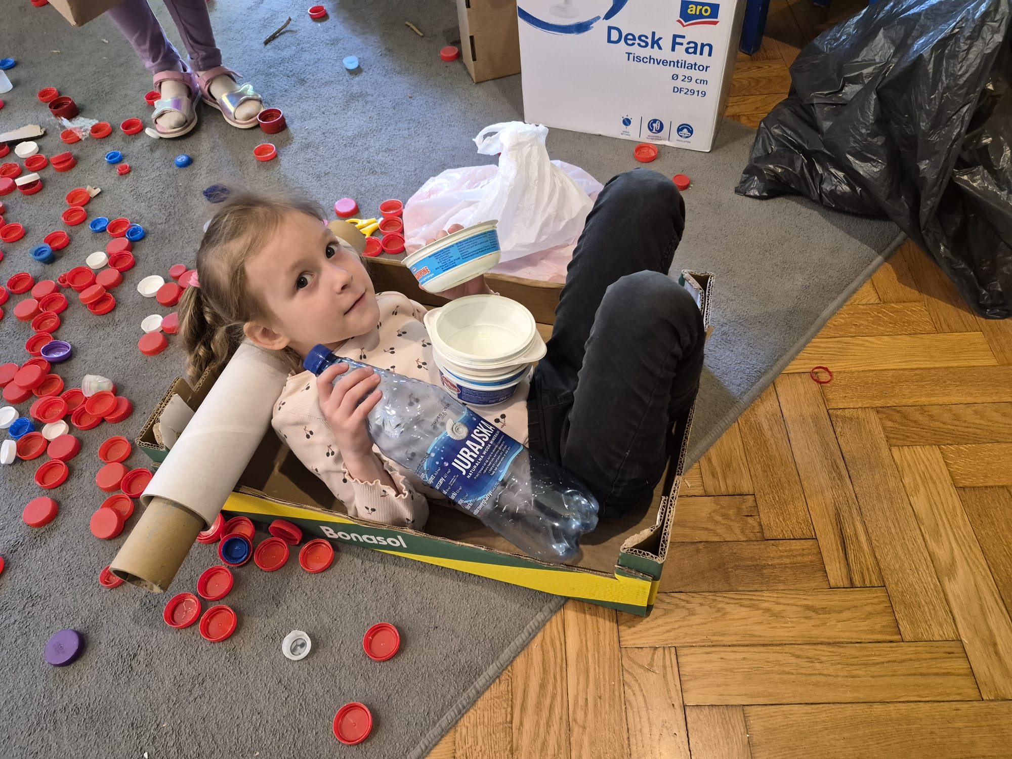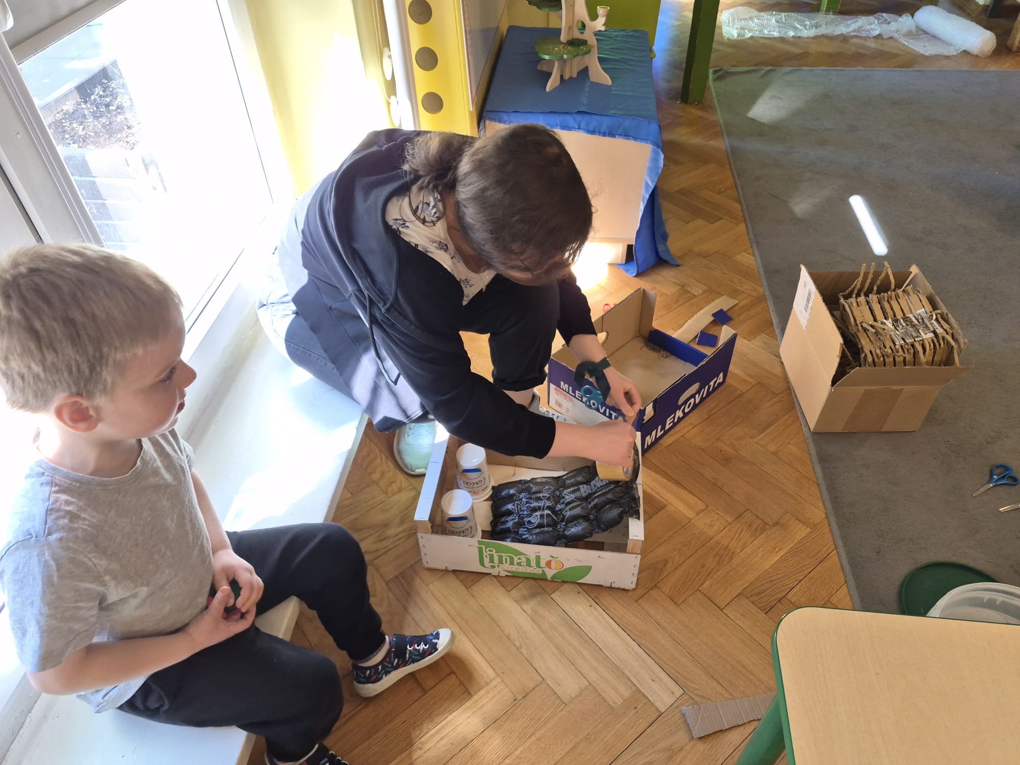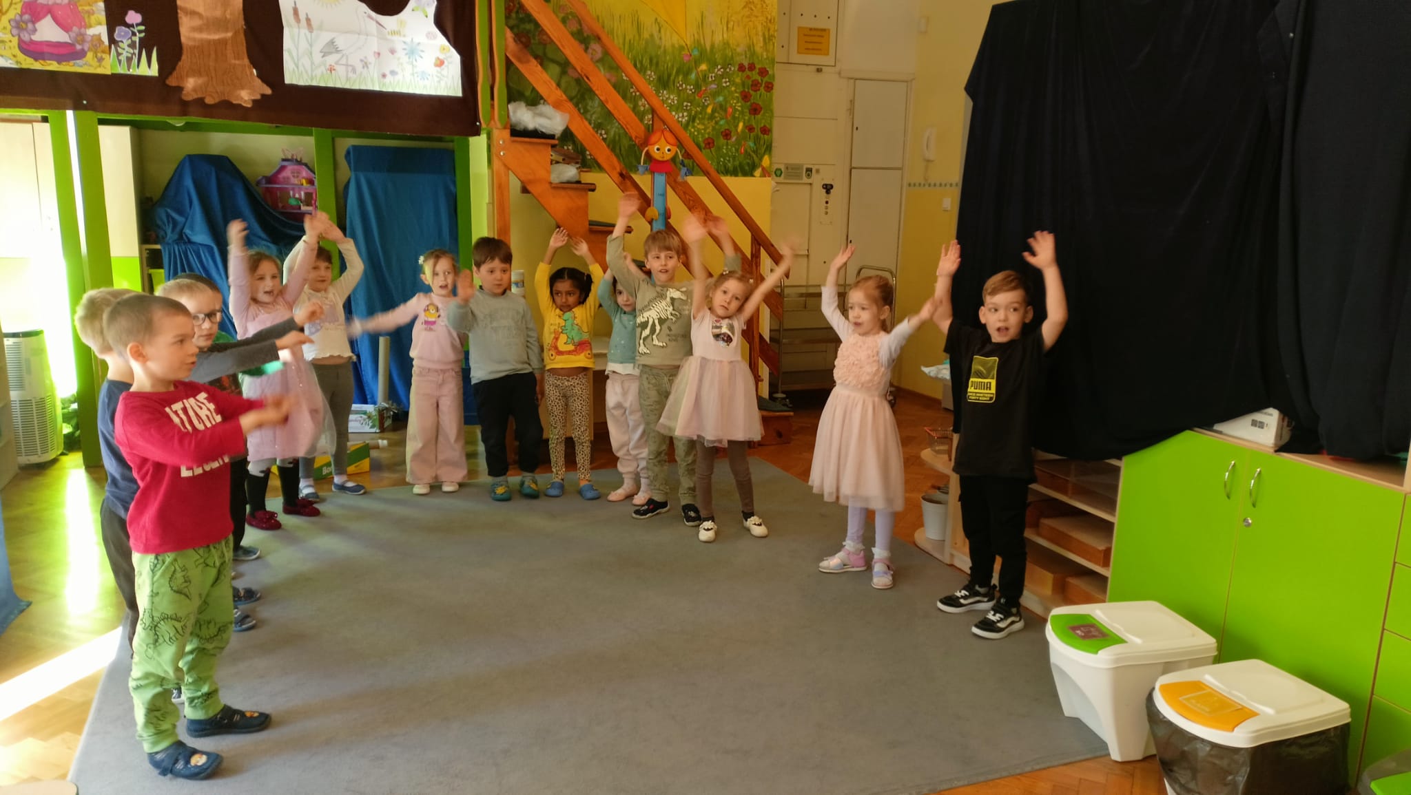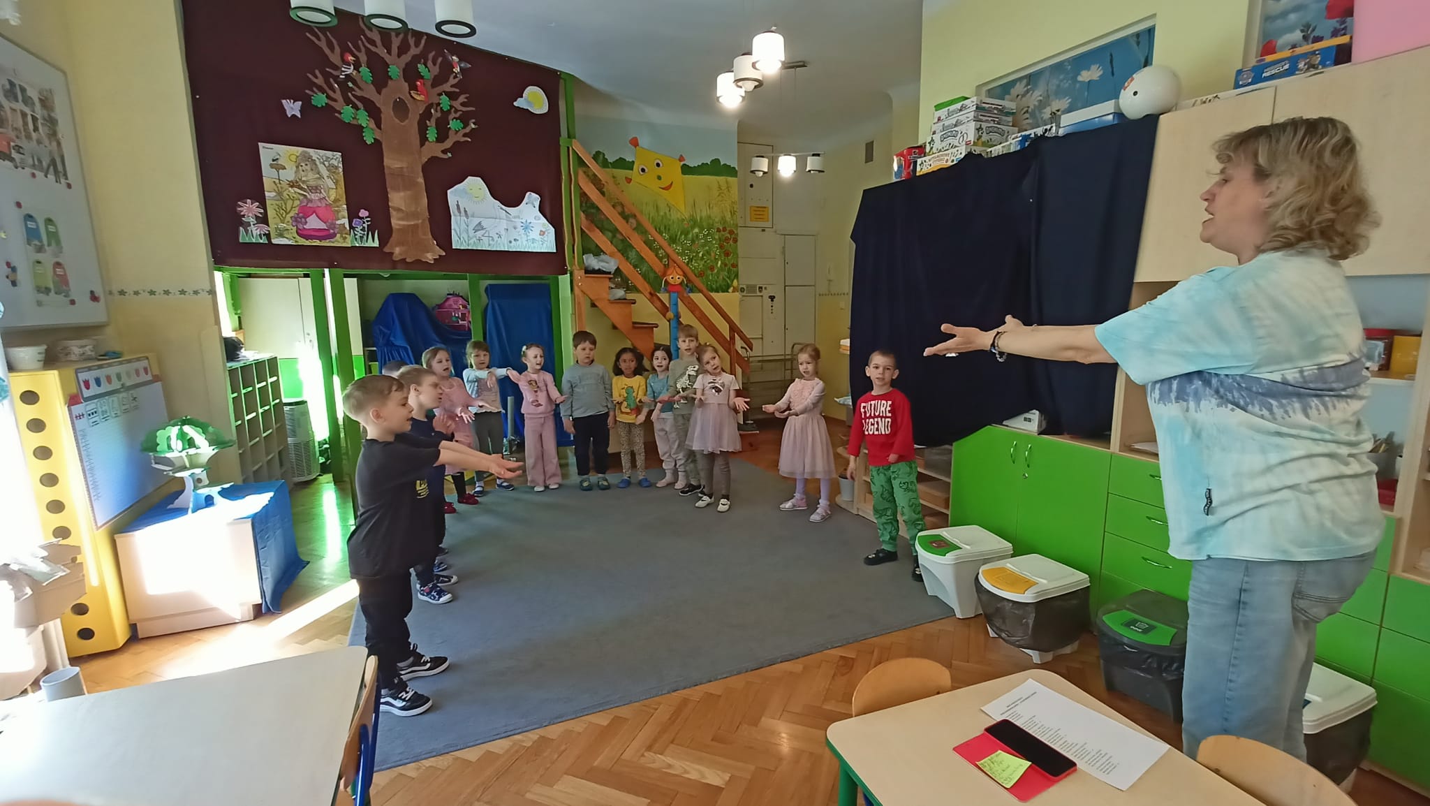 W piątek 24 kwietnia najstarsze Przedszkolaki zakończyły tydzień pt.”Dbamy o naszą Planetę Ziemię”. Te 5 dni dzieci i nauczyciele zapamiętają na długo nie tylko ze względu na ważne tematy poruszane na zajęciach ekologicznych, ale głównie przez „wulkan kreatywności”, który wybuchł w tym okresie w grupie!:) A zaczęło się wszystko w poniedziałek 20.04.,gdy Pani Ewa -po zajęciach ekologicznych -ogłosiła „Tydzień Bez Gotowych Zabawek” i razem z innymi Paniami przykryła zasłonami wszystkie szafy z pojemnikami pełnymi plastikowych zestawów do zabawy, zostawiając tylko drewniane klocki oraz dostęp do kolorowanek, kredek, nożyczek i kleju, a wystawiła na dywan : wielkie pudełka kartonowe, butelki i wiaderka plastikowe, duże rolki po wykładzinach lub dywanikach, pojemniczki po jogurtach i śmietanie, wysypała różnokolorowe nakrętki oraz rozwinęła folię bąbelkową. Po początkowych okrzykach: O nie! Śmieci! Czym my się teraz będziemy bawić? powoli zaczęły pojawiać na twarzach dzieci uśmiechy i po przedstawieniu przez nauczycieli możliwości wykorzystania tych surowców wtórnych i deklaracji pomocy przy łączeniach materiałów lub przecinaniu czegoś ,ukazała się oczom wszystkim Potęga Wyobraźni Dziecięcej !!! Samochody, rakiety, samoloty, łóżeczka dziecięce, pizza pepperoni, komin, konik, buda dla pieska, myjnia i zjeżdżalnia dla samochodów, sukienka z folii bąbelkowej , a w kolejnych dniach gra w kręgle jogurtowe, skoki przez przeszkody ,mur chiński, zbroja rycerska, robot, różne gry i zabawy zręcznościowe itd. Jako, że surowce wtórne grały główną rolę w tym tygodniu, nie mogło zabraknąć zajęć i zabaw ruchowych związanych z recyklingiem i segregacją śmieci, pojemniki na śmieci wystąpiły również jako aktorzy w teatrzyku pt.”Który kosz jest najważniejszy?”:) W Dniu Ziemi 22 kwietnia Starszaki wzięły udział w ogólnopolskiej akcji „Sprzątanie Świata” oraz cały tydzień śpiewały pięknie -ilustrując ruchem tekst- Hymn Ekoprzedszkolaków z „Zaczarowanego Ziarenka” czyli „Cały świat jest w naszych rękach”. W piątek 24 kwietnia wykonały jeszcze rano śliczne wielokolorowe zakładki do książek z hasłami ekologicznymi , które każde z dzieci uznało za najważniejsze wg. niego , by ratować Naszą Planetę, a po południu odbył się ekologiczny seans filmowy, na którym to m.in. zwierzątka leśne poprosiły dzieci ,by razem z dorosłymi zatroszczyły się o los Ziemi po prostu zachowując proste zasady ekologiczne na co dzień! Pozostaje mieć nadzieję, że ten trochę szalony , ale jakże ważny dydaktycznie tydzień, pozostawi w głowach i sercach dorosłych oraz dzieci trwałą potrzebę troski o los Naszej Planety- dla dobra przecież nas wszystkich , a rozbudzona wyobraźnia i chęć tworzenia nowych rzeczy zaprocentuje sukcesami w dalszej edukacji Przedszkolaków, a potem Szkolniaków:)