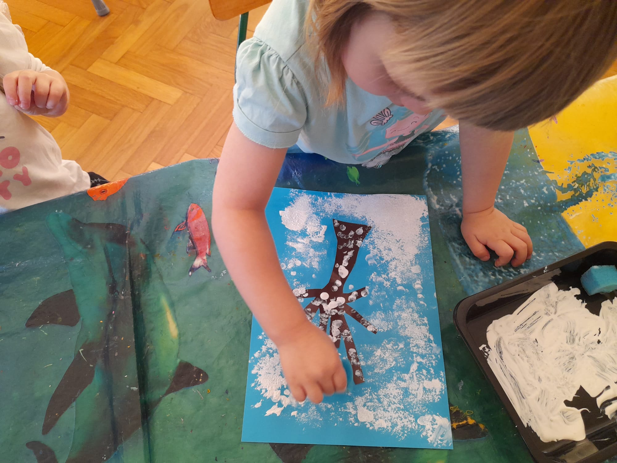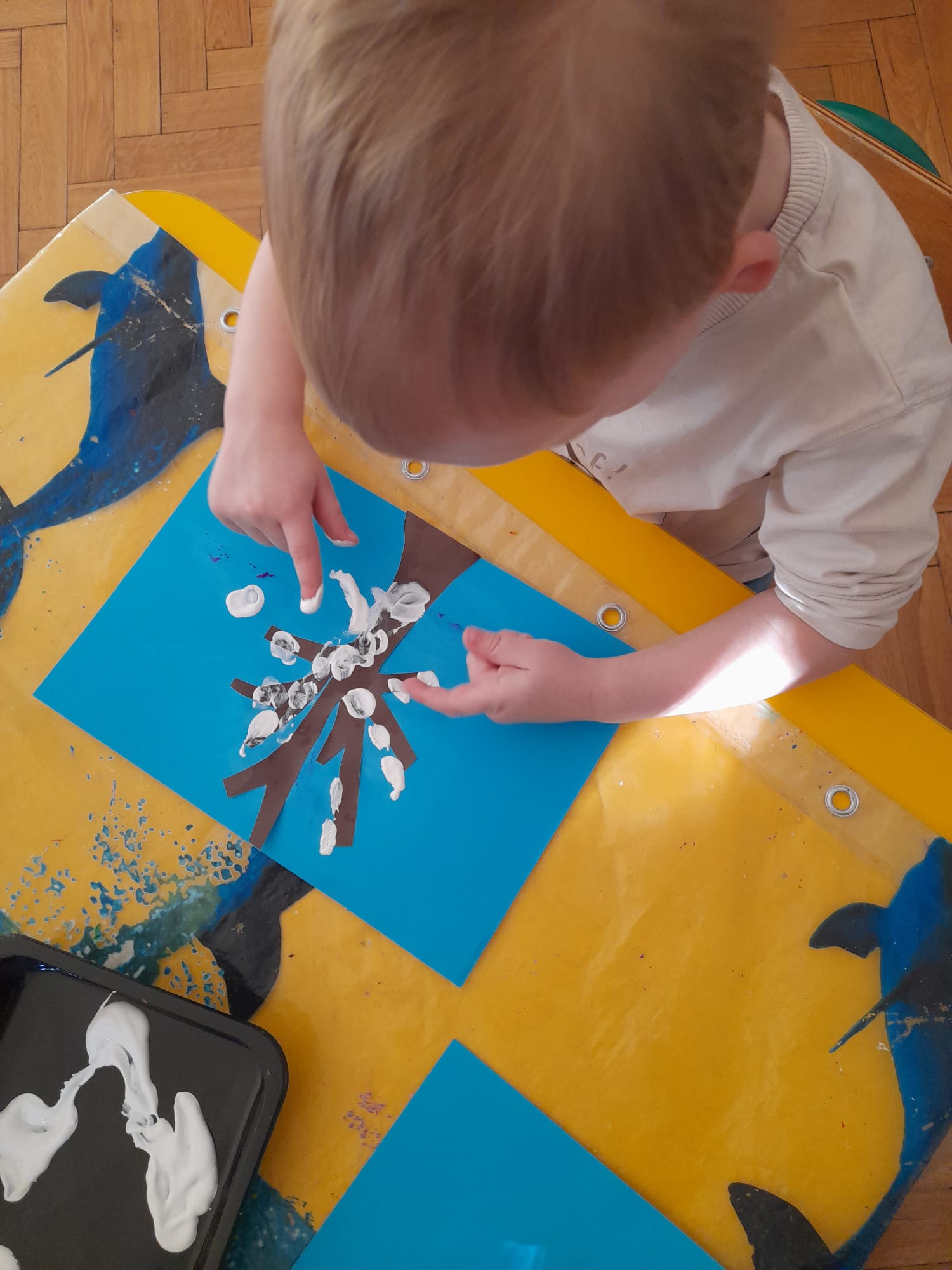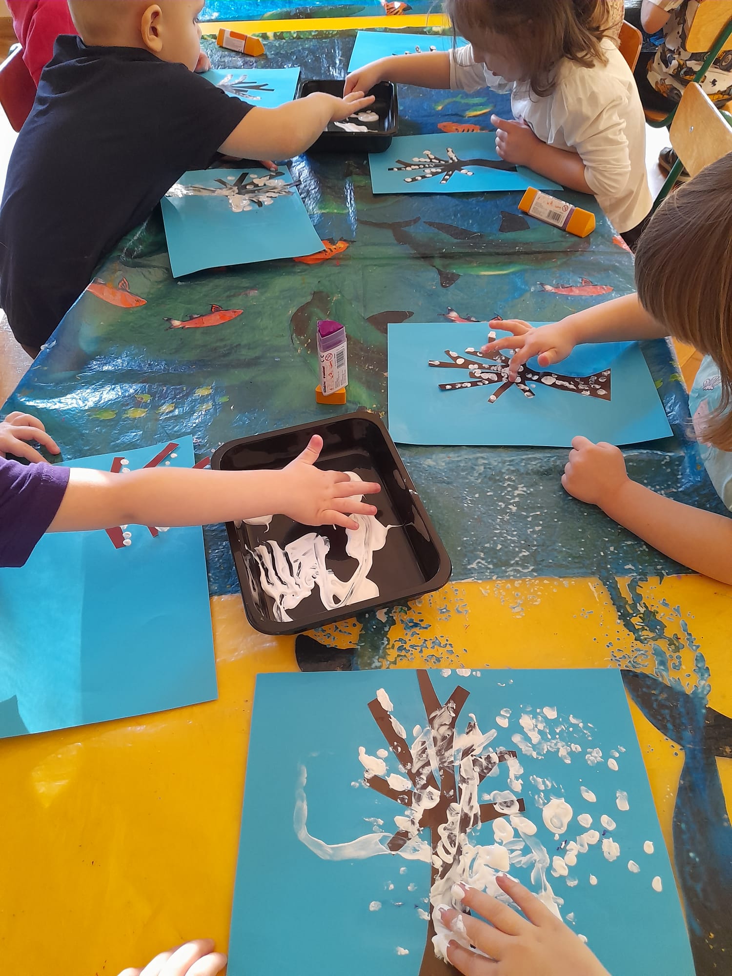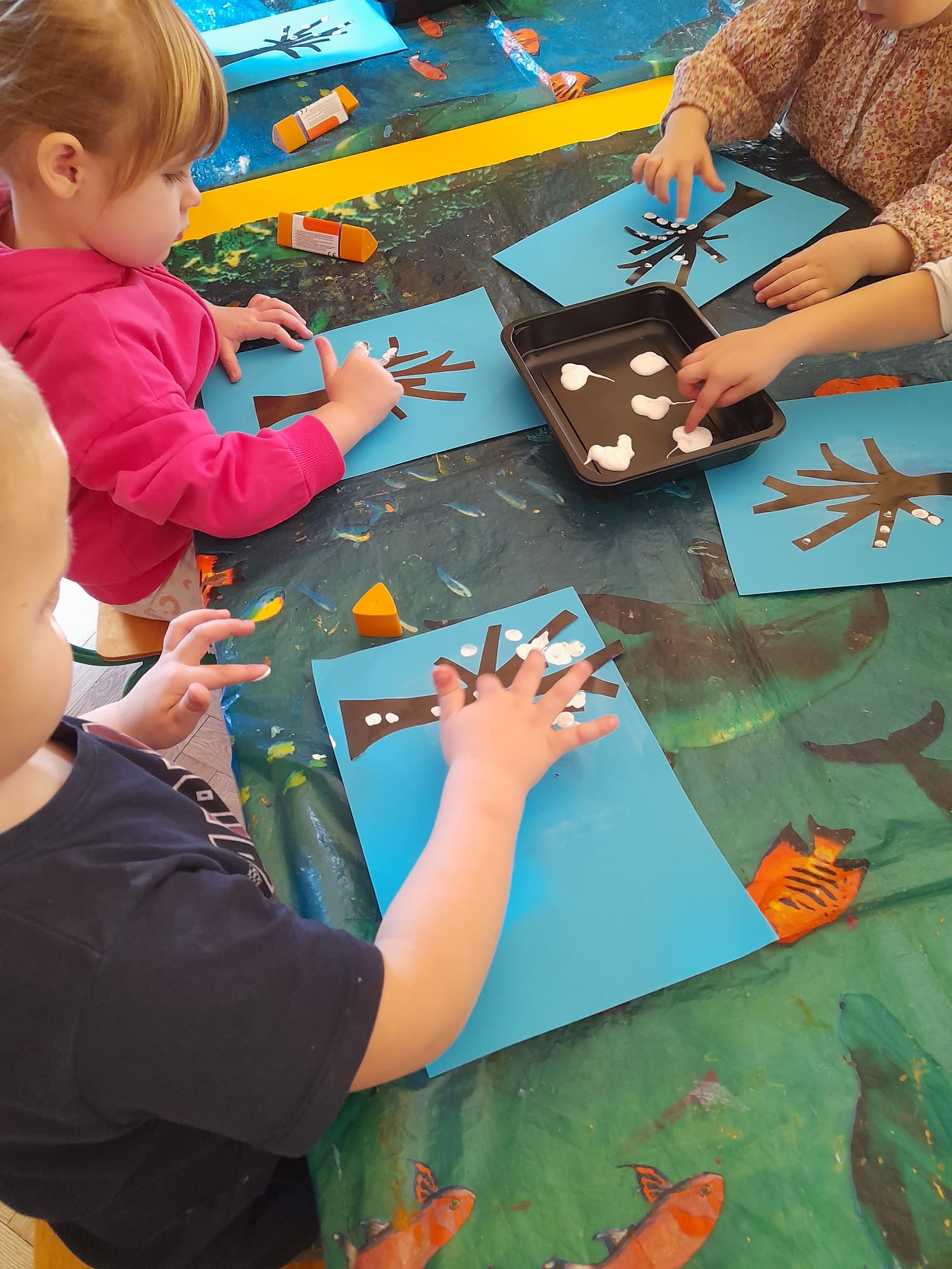 W grupie Maluszków nie ma czasu na nudę, nieustannie tworzą pomysłowe arcydzieła . Tym razem – w Kąciku Kreatywności- poznały nową technikę plastyczną- Wydrapywankę. Dzieci z ogromnym zaciekawieniem i skupieniem odkrywały kolorowe wzory ukryte pod czarną warstwą. Następnie tworzyły zimowe obrazki techniką paluszkową. Działania te sprawiły Małym Artystom wiele radości i pozwoliły na swobodną ekspresję twórczą:)