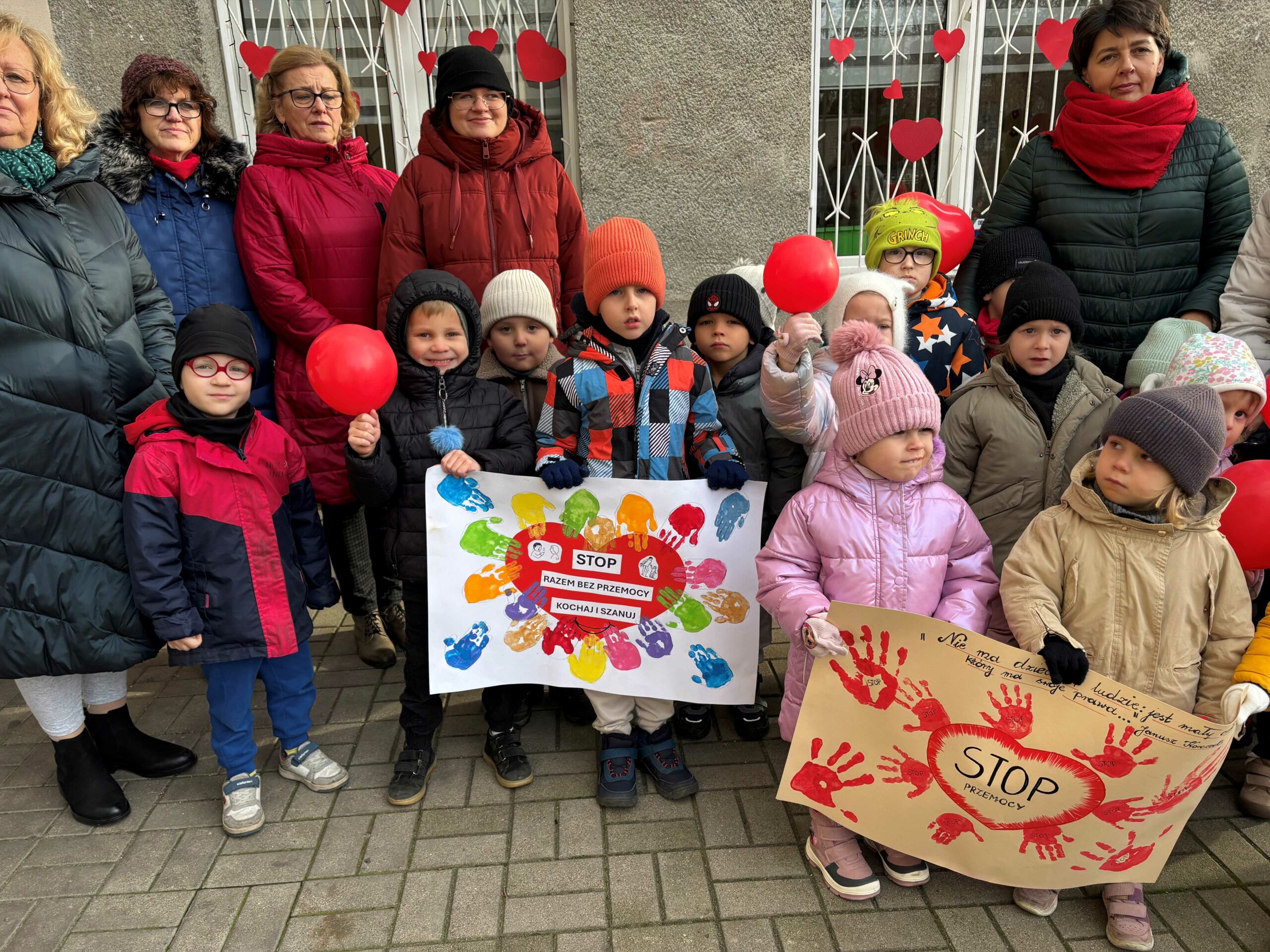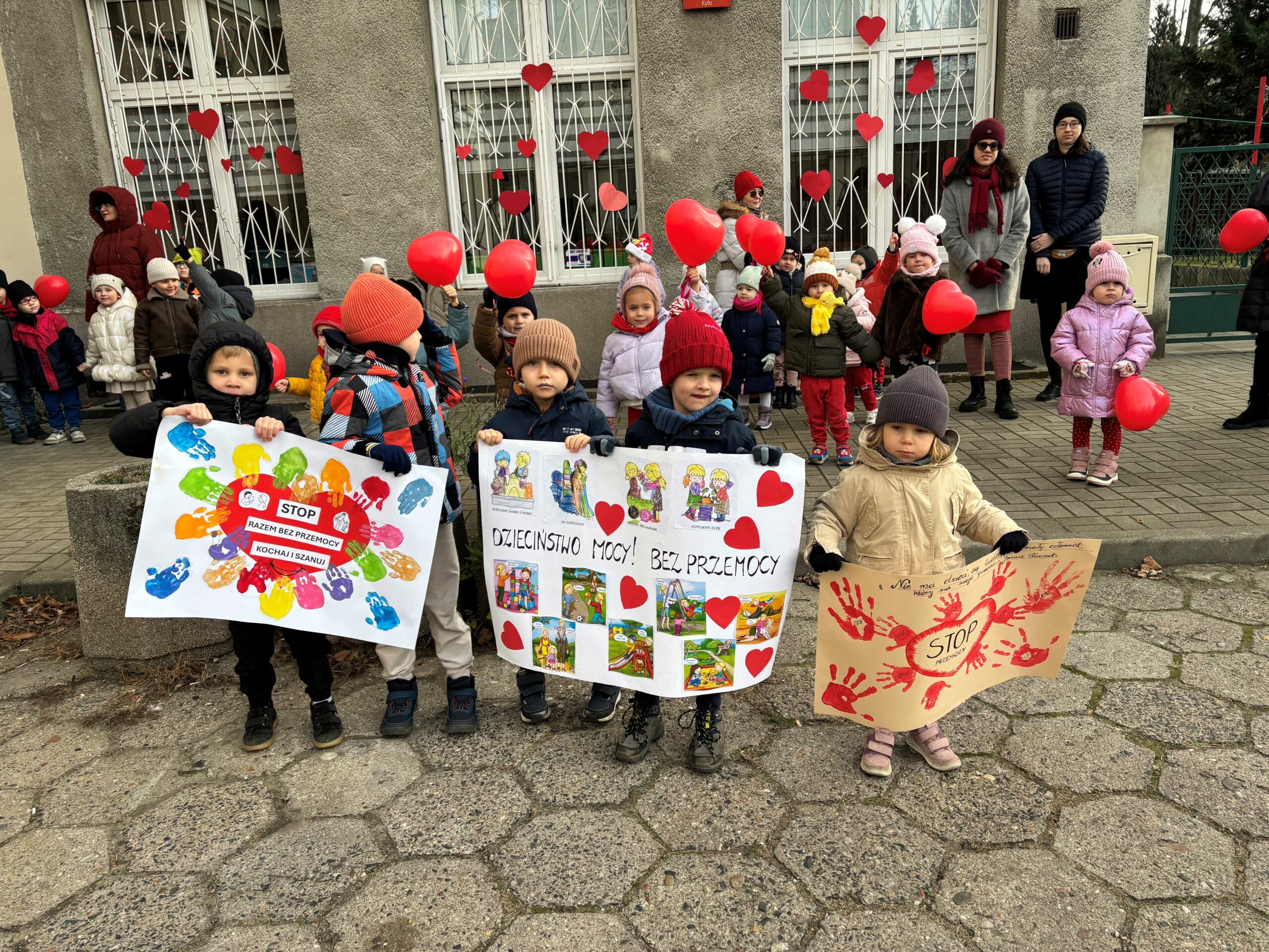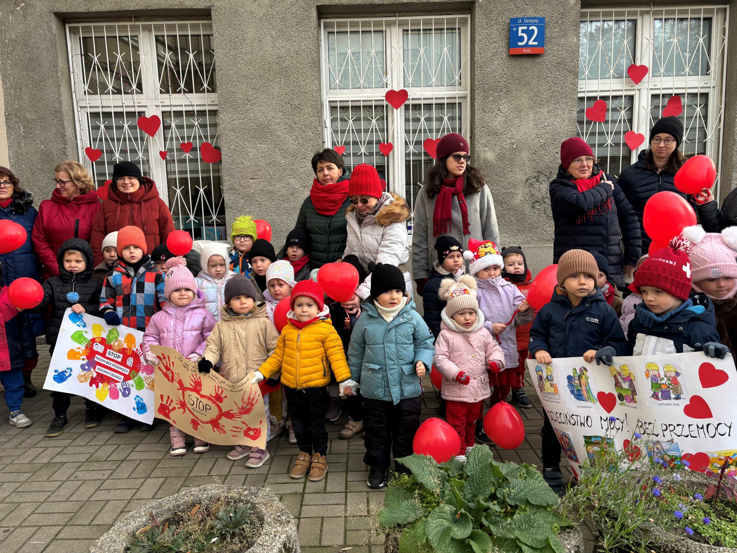 W naszym przedszkolu realizowane były działania w ramach Ogólnopolskiej Kampanii „Dzieciństwo bez przemocy”, której głównym organizatorem jest Fundacja Dajemy Dzieciom Siłę. Przez kilka ostatnich dni w grupach odbywały się zajęcia na temat bezpieczeństwa, radzenia sobie w trudnych sytuacjach. Przedszkolaki uczyły się też mówić „NIE” np. gdy ktoś sprawia im przykrość. W środę 19 listopada na podsumowanie kampanii wyruszyliśmy z przygotowanymi wspólnie plakatami, aby promować akcję w środowisku lokalnym i uświadamiać spotkane po drodze osoby, jak ważne jest zapobieganie przemocy wobec dzieci. Przedszkole zostało udekorowane czerwonymi lampkami, balonikami i serduszkami. Postaraliśmy się też, aby w tym dniu założyć ubrania w czerwonym kolorze np. spodnie, szalik, czapkę. Na zakończenie spaceru po najbliższej okolicy pobawiliśmy się razem i zaśpiewaliśmy hymn naszego przedszkola.