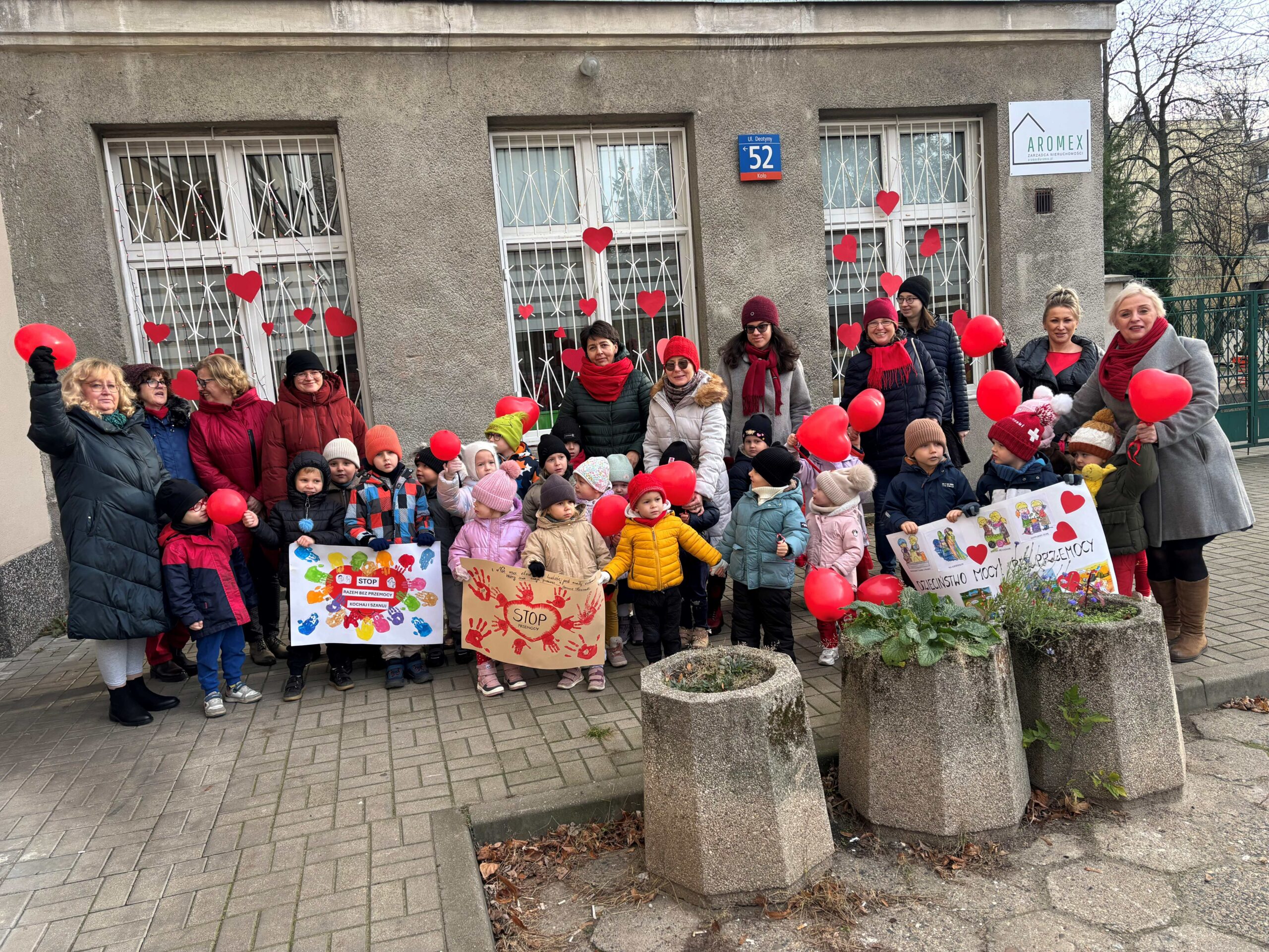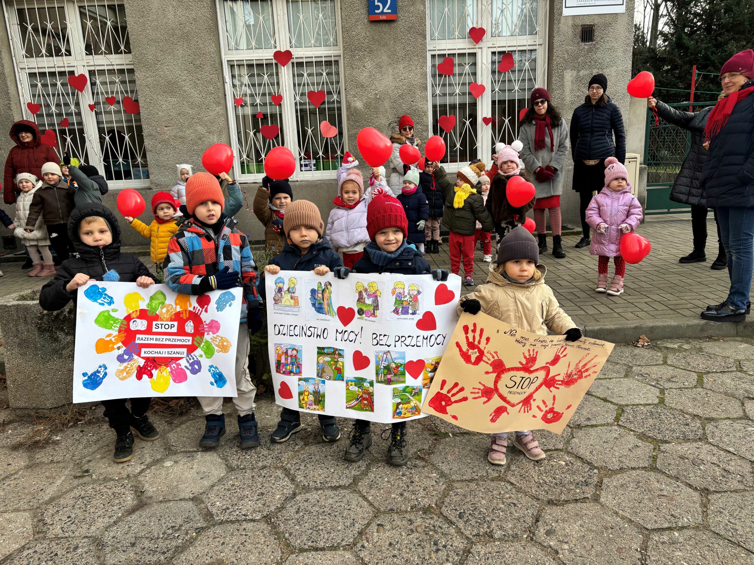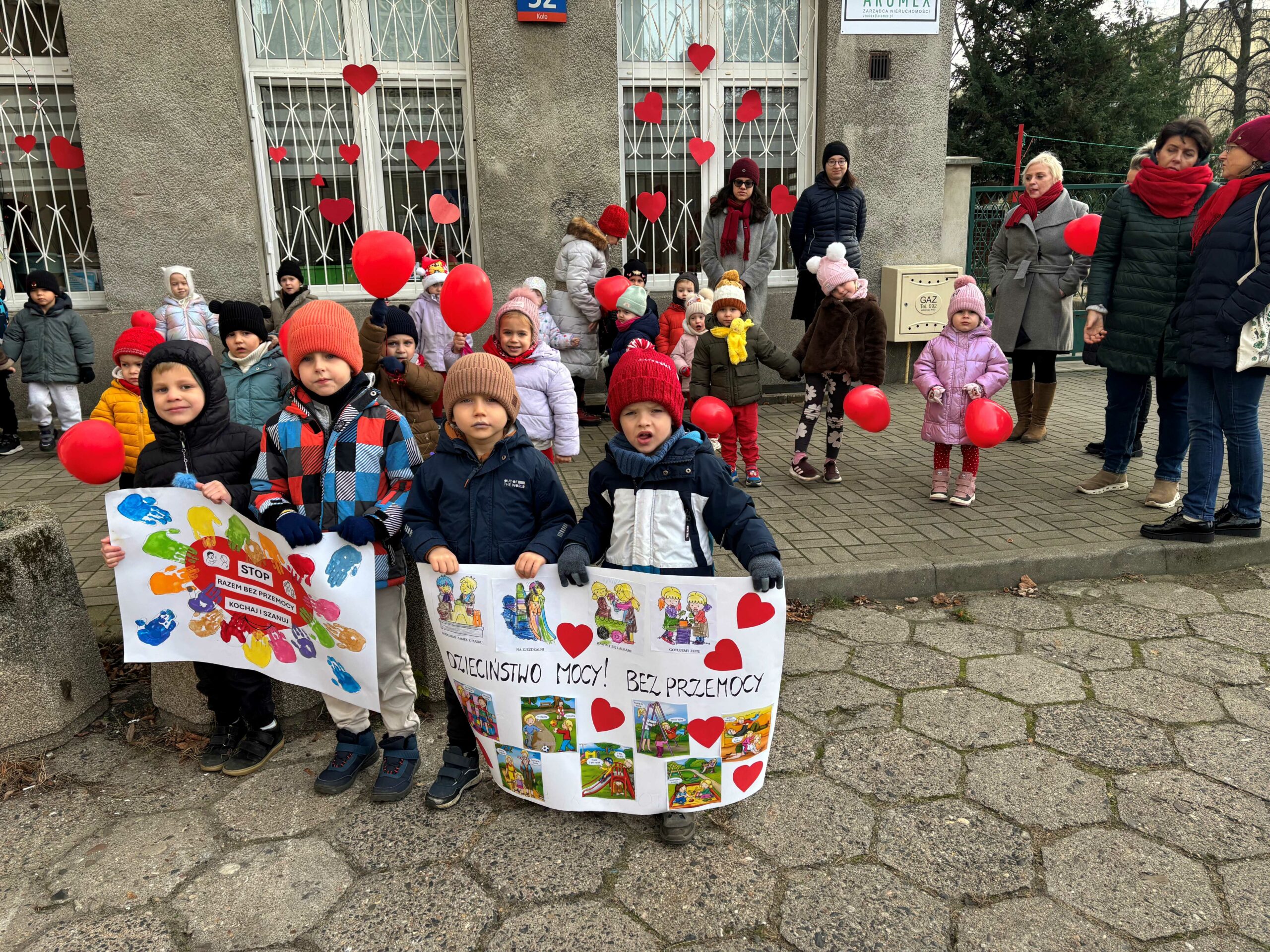 W naszym przedszkolu realizowane były działania w ramach Ogólnopolskiej Kampanii „Dzieciństwo bez przemocy”, której głównym organizatorem jest Fundacja Dajemy Dzieciom Siłę. Przez kilka ostatnich dni w grupach odbywały się zajęcia na temat bezpieczeństwa, radzenia sobie w trudnych sytuacjach. Przedszkolaki uczyły się też mówić „NIE” np. gdy ktoś sprawia im przykrość. W środę 19 listopada na podsumowanie kampanii wyruszyliśmy z przygotowanymi wspólnie plakatami, aby promować akcję w środowisku lokalnym i uświadamiać spotkane po drodze osoby, jak ważne jest zapobieganie przemocy wobec dzieci. Przedszkole zostało udekorowane czerwonymi lampkami, balonikami i serduszkami. Postaraliśmy się też, aby w tym dniu założyć ubrania w czerwonym kolorze np. spodnie, szalik, czapkę. Na zakończenie spaceru po najbliższej okolicy pobawiliśmy się razem i zaśpiewaliśmy hymn naszego przedszkola.