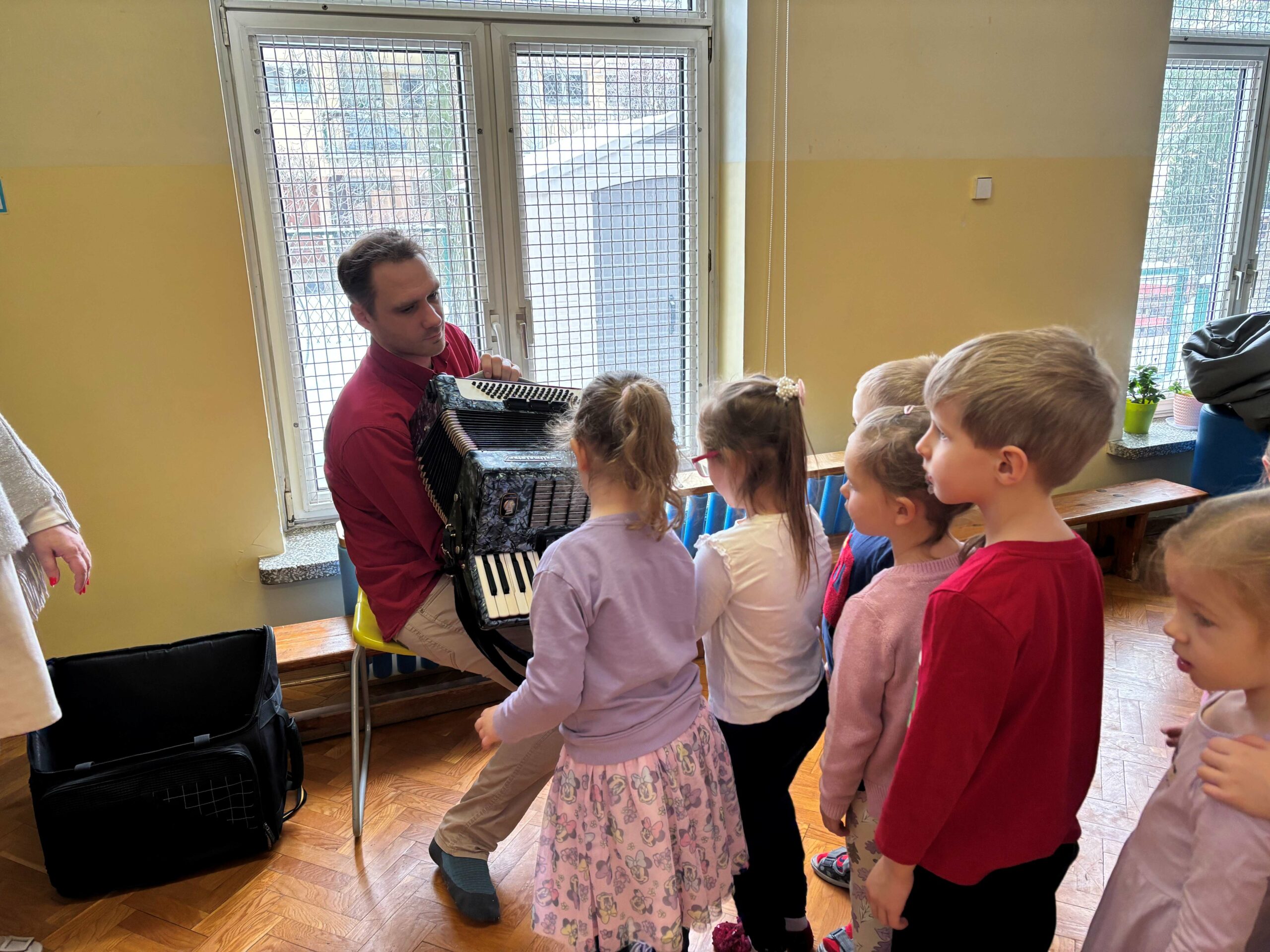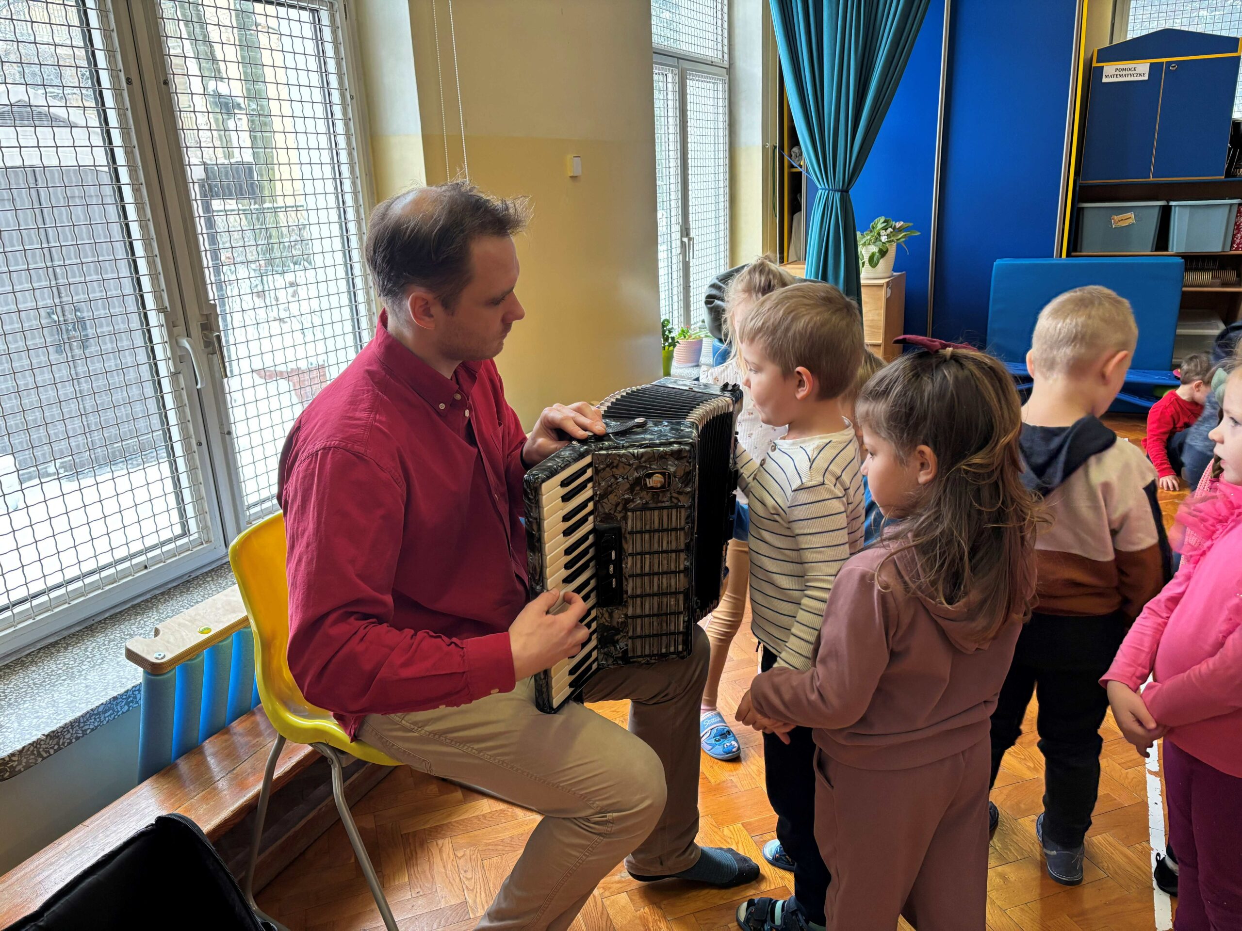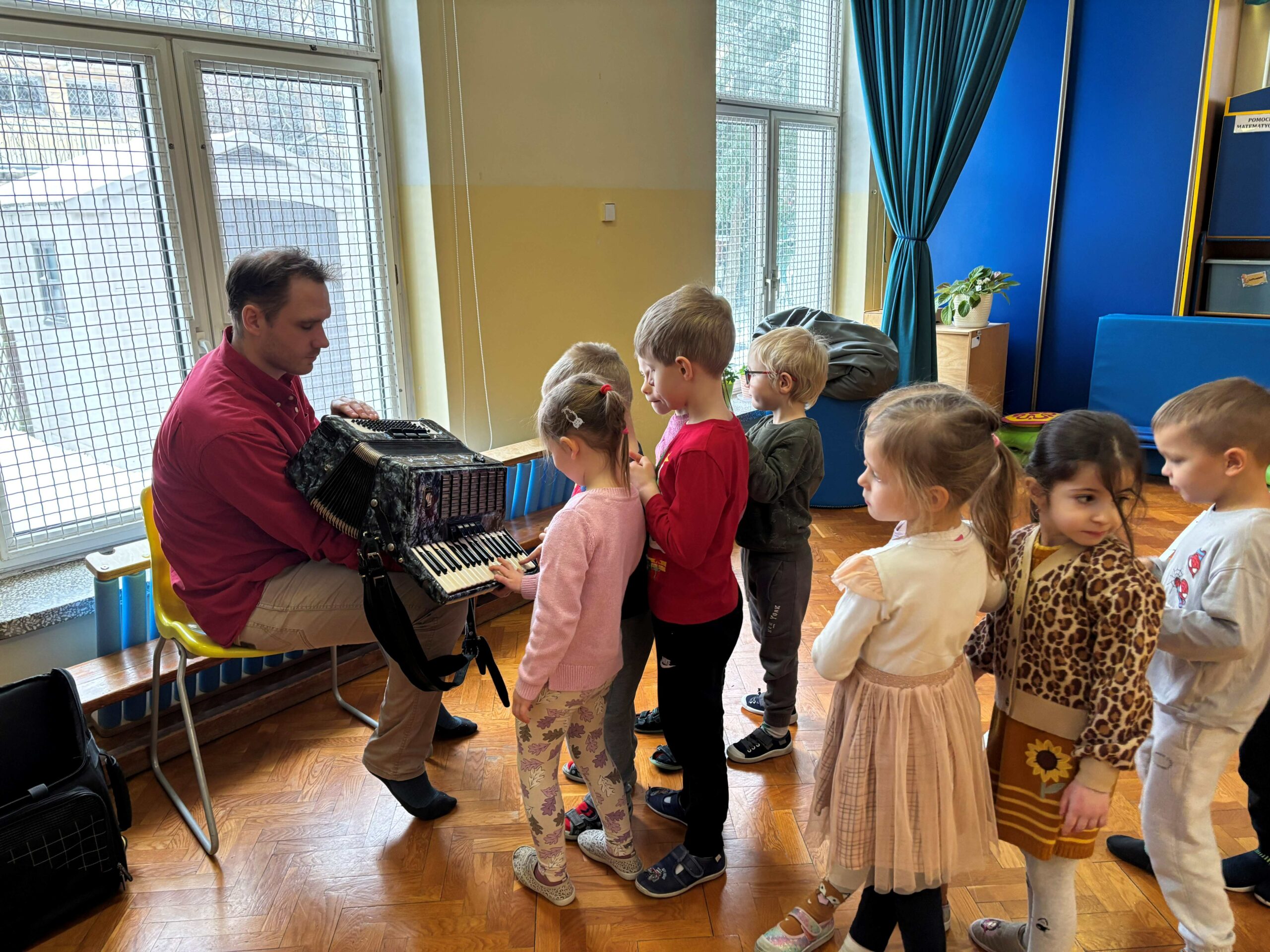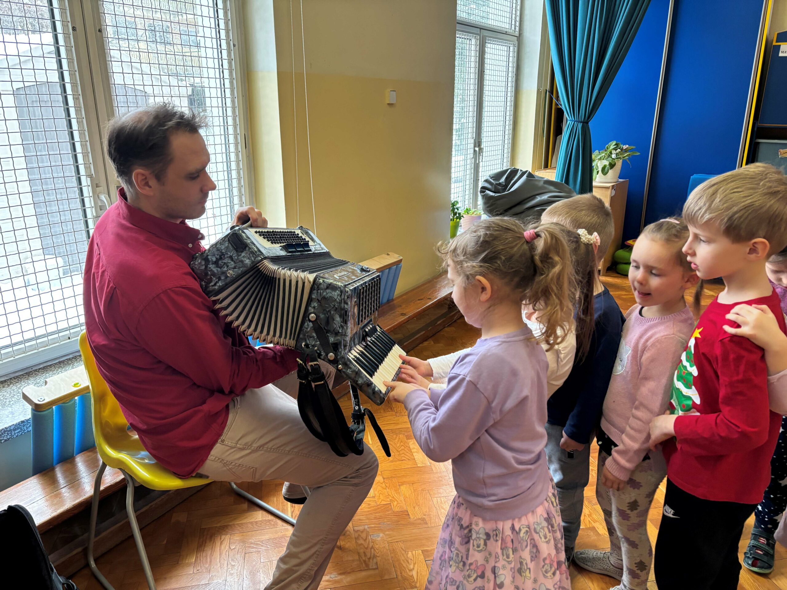 W środę 14 stycznia w naszym przedszkolu odbył się kolejny koncert edukacyjny z cyklu „Poznajemy instrumenty”. Tym razem dzieci miały okazję poznać bliżej akordeon. Sympatyczny pan opowiedział nam krótko, z jakich elementów składa się ten instrument i jak wydobywają się z niego dźwięki. Potem był koncert pełen wesołej zabawy i tańca. Żywiołowa muzyka bardzo spodobała się dzieciom. Na koniec każdy przedszkolak mógł sam sprawdzić, jak gra się na akordeonie. To było inspirujące spotkanie ze sztuką, która pozwala wyrażać emocje, rozwija wrażliwość i kreatywność.