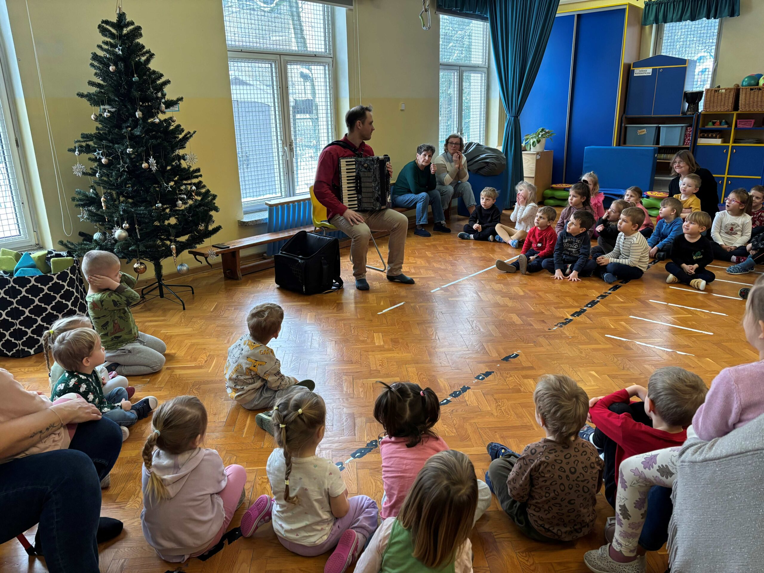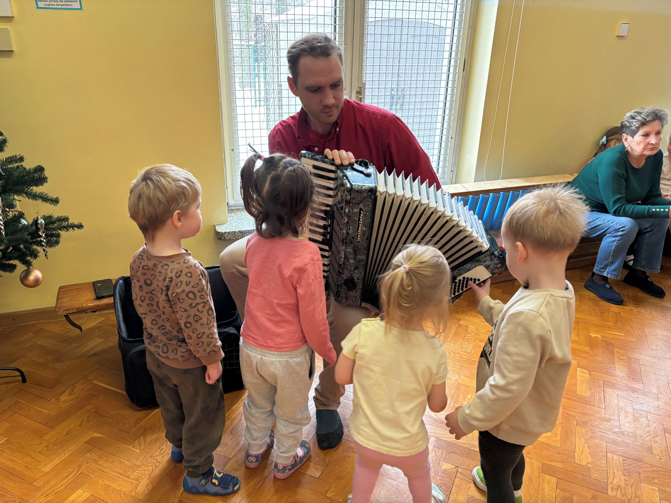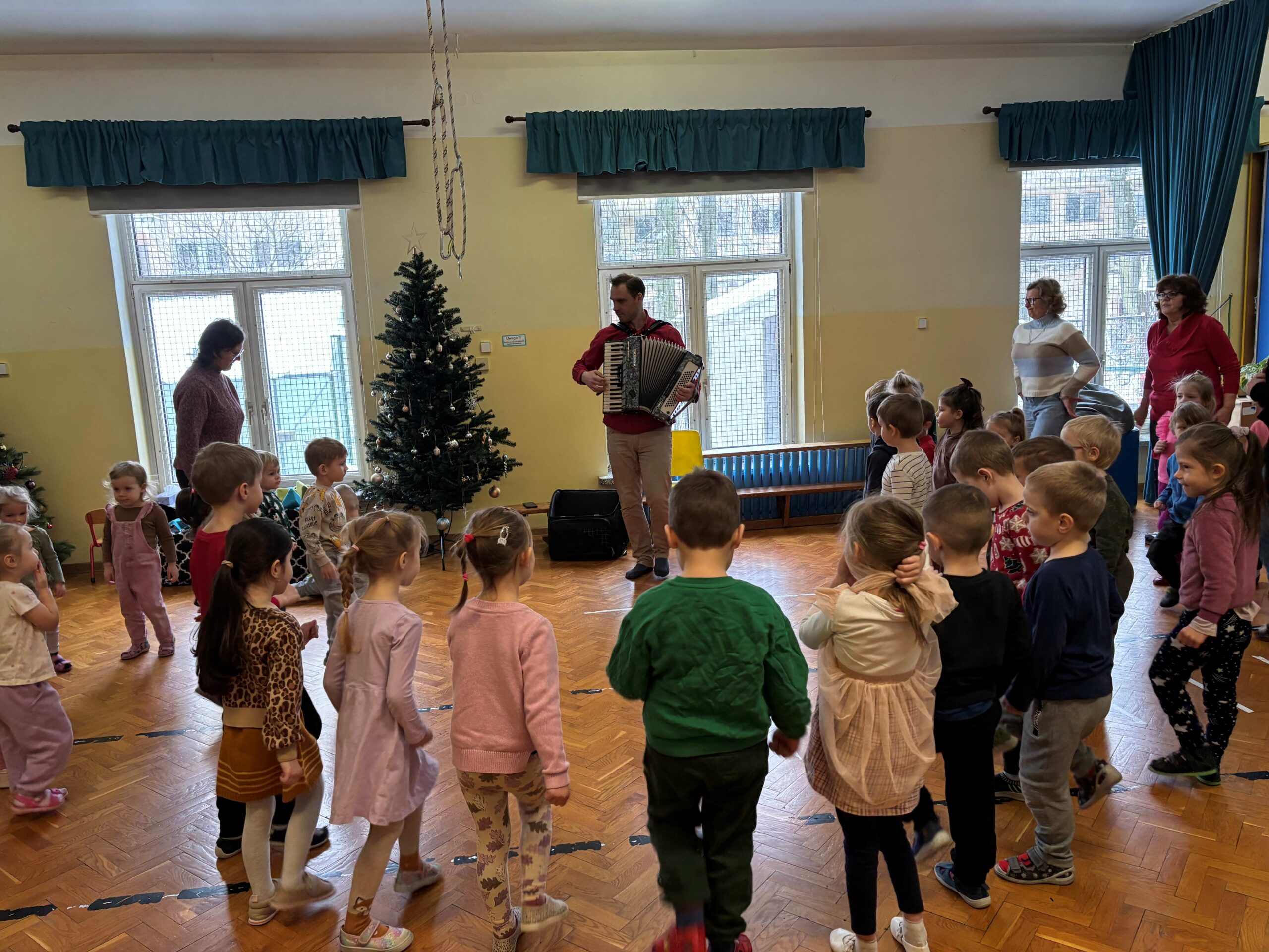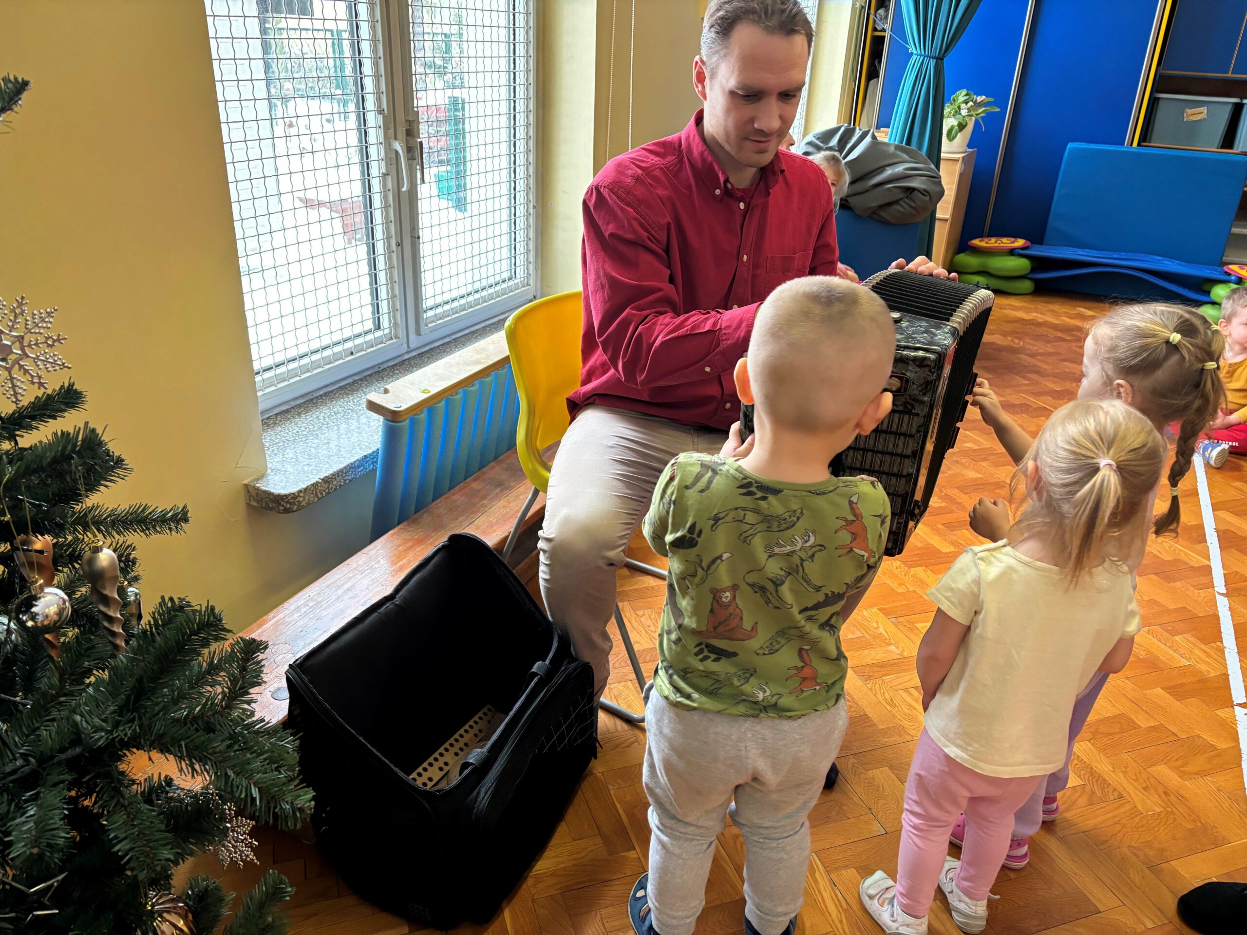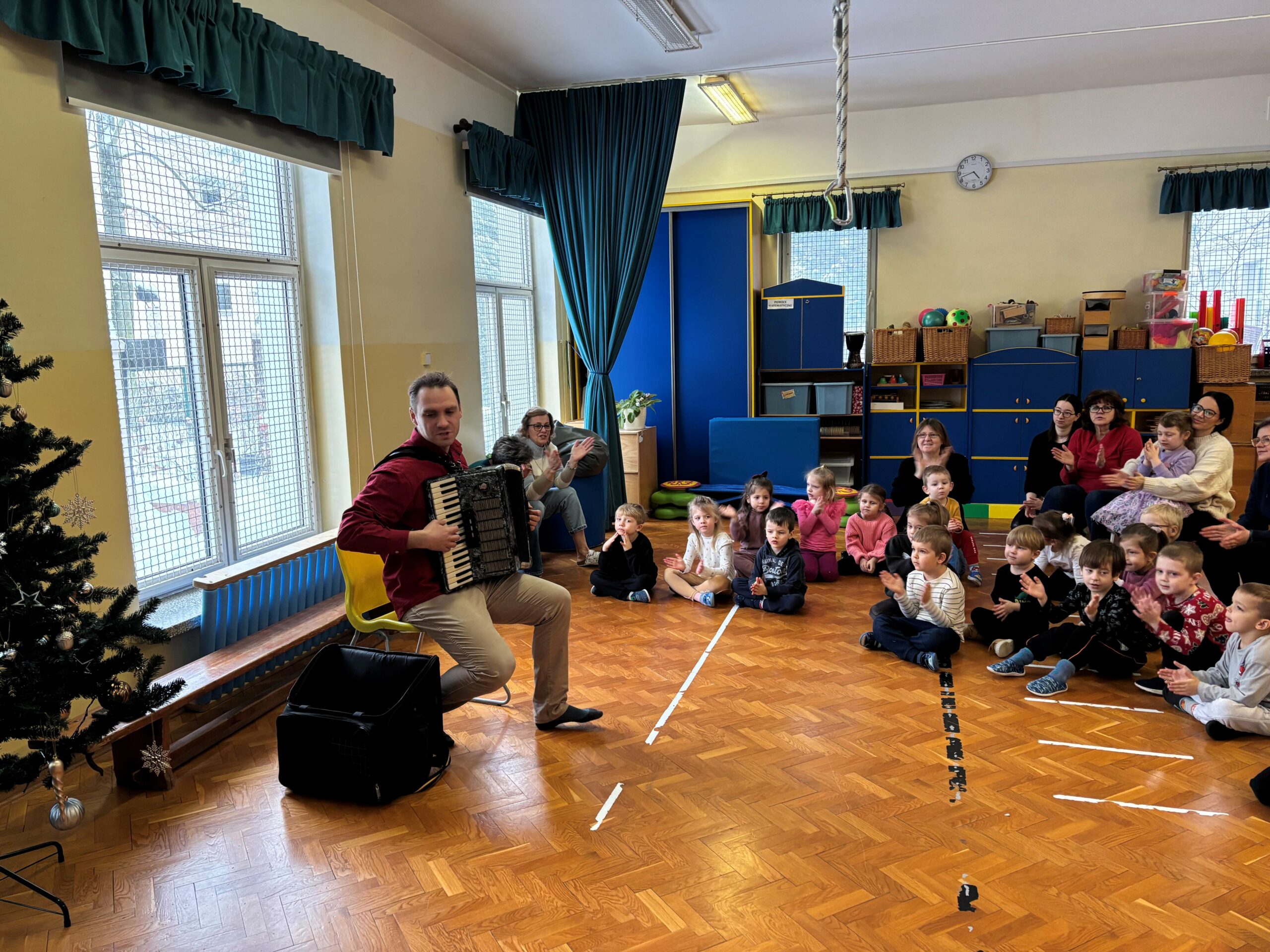 W środę 14 stycznia w naszym przedszkolu odbył się kolejny koncert edukacyjny z cyklu „Poznajemy instrumenty”. Tym razem dzieci miały okazję poznać bliżej akordeon. Sympatyczny pan opowiedział nam krótko, z jakich elementów składa się ten instrument i jak wydobywają się z niego dźwięki. Potem był koncert pełen wesołej zabawy i tańca. Żywiołowa muzyka bardzo spodobała się dzieciom. Na koniec każdy przedszkolak mógł sam sprawdzić, jak gra się na akordeonie. To było inspirujące spotkanie ze sztuką, która pozwala wyrażać emocje, rozwija wrażliwość i kreatywność.