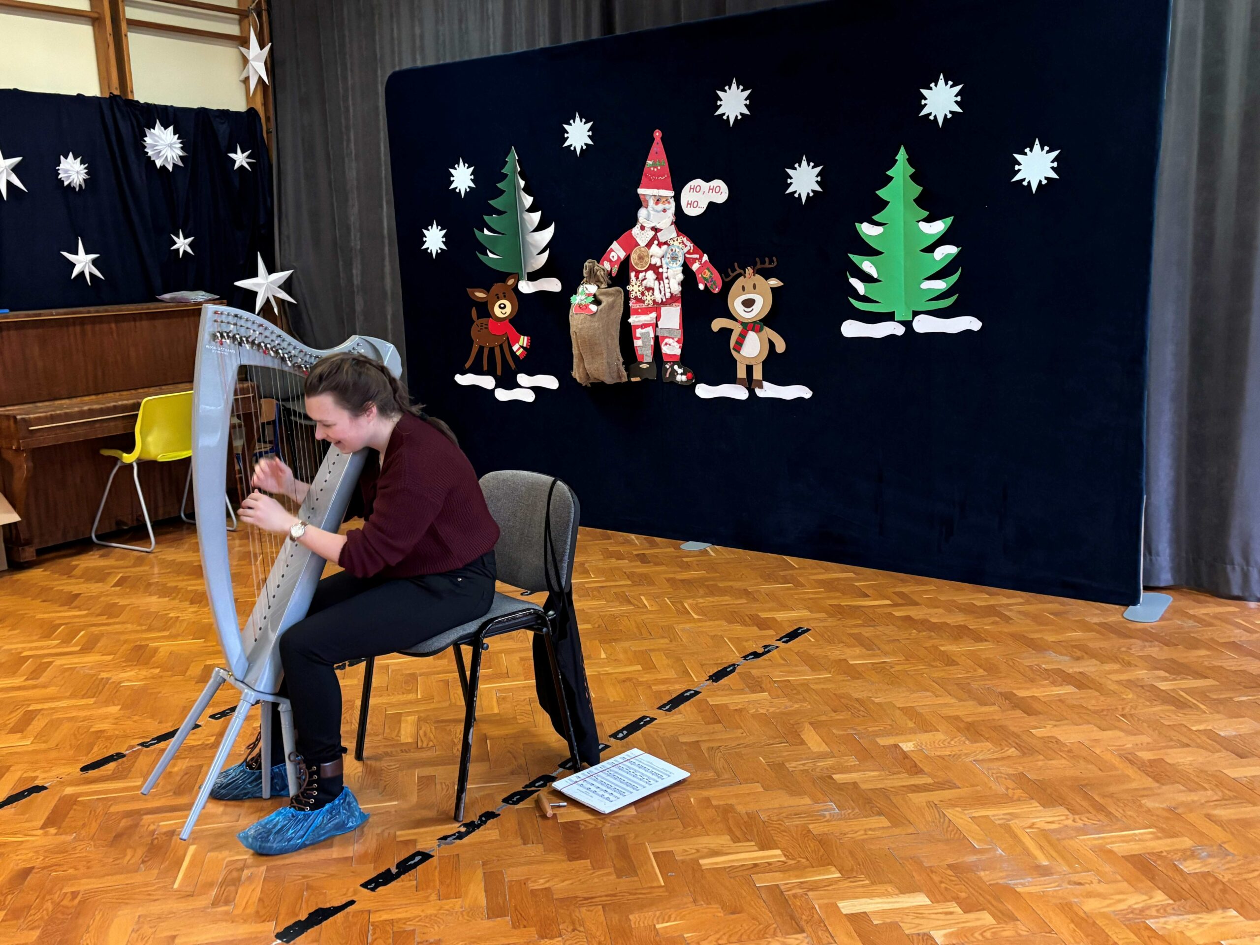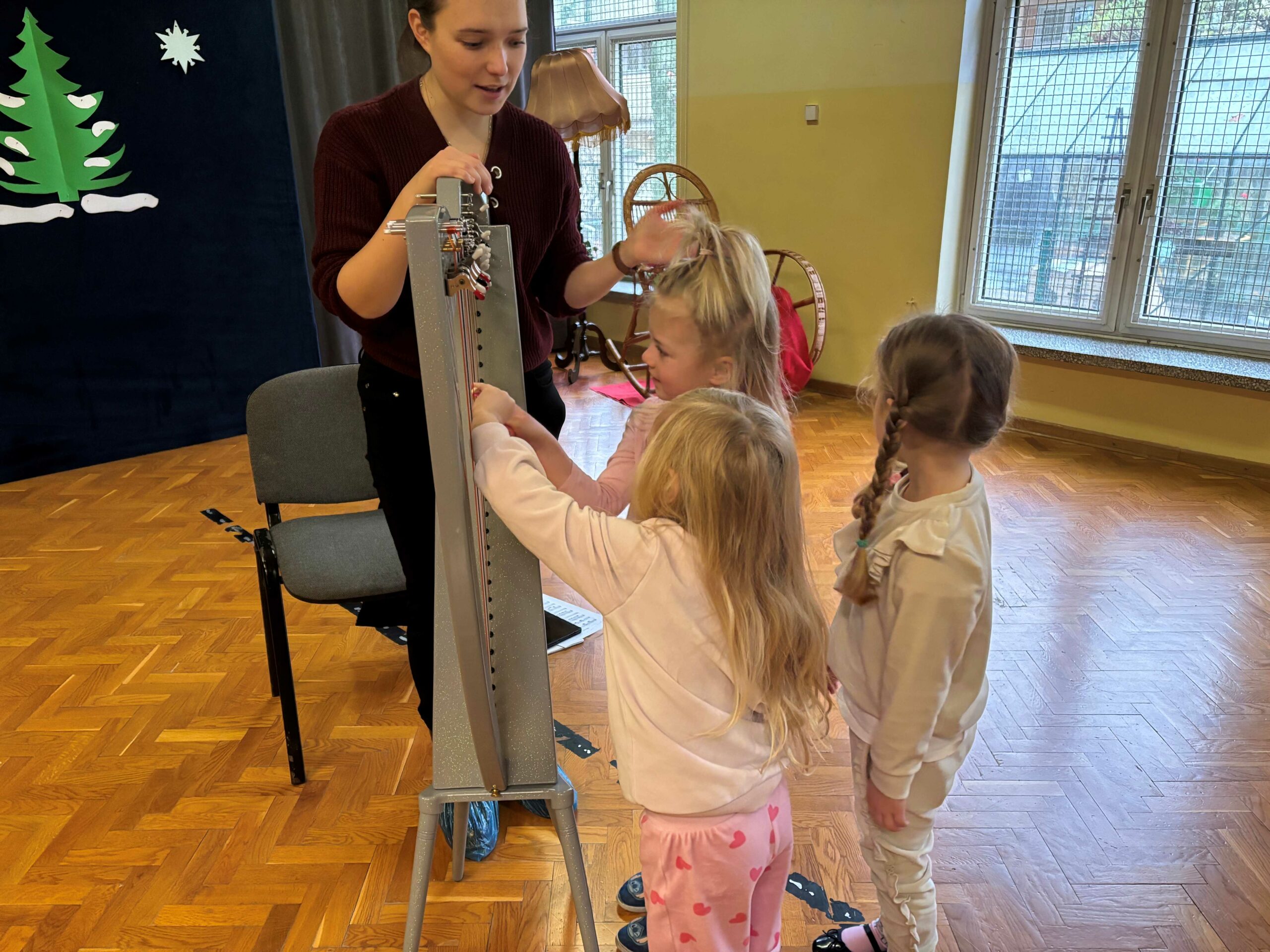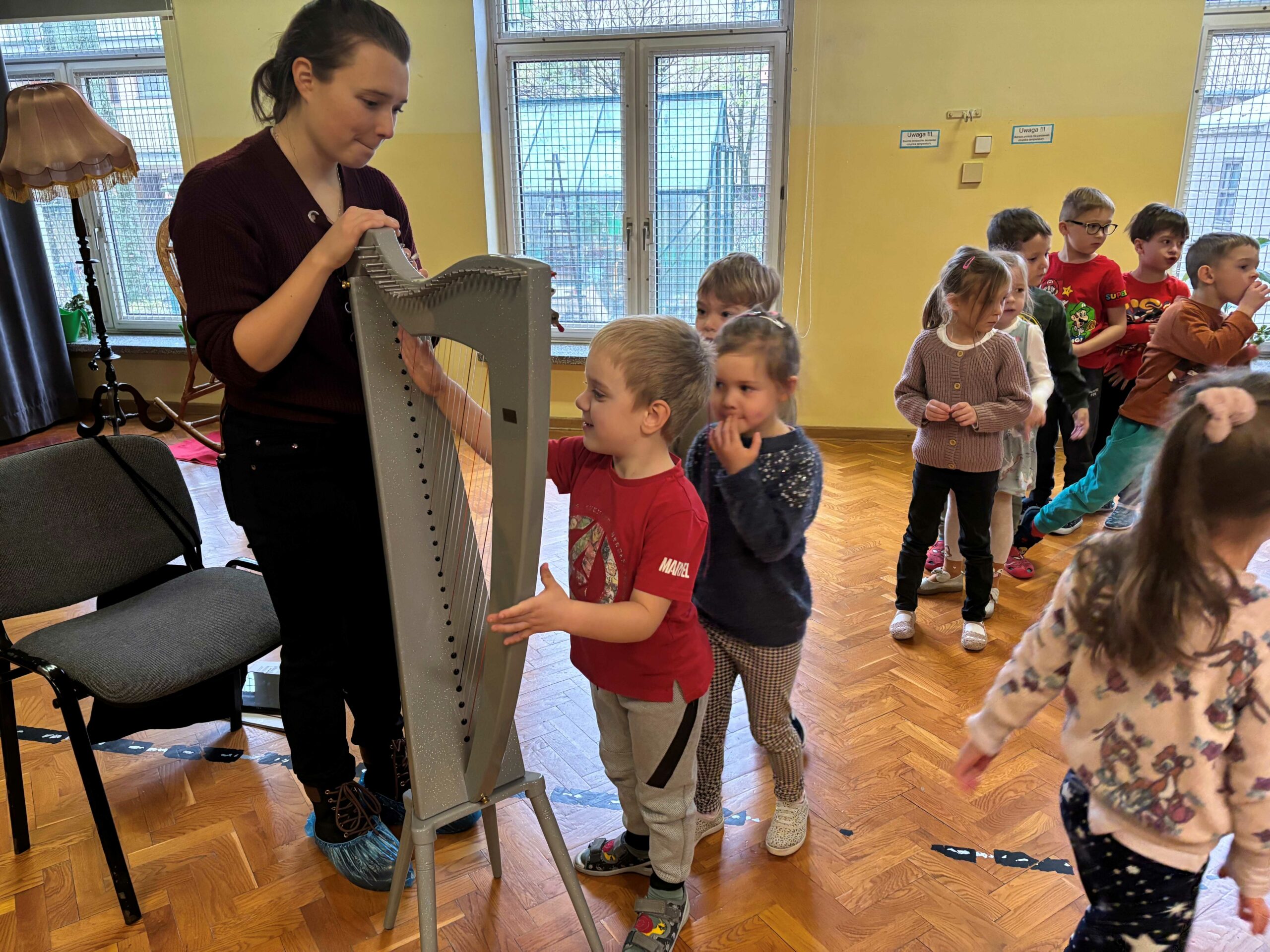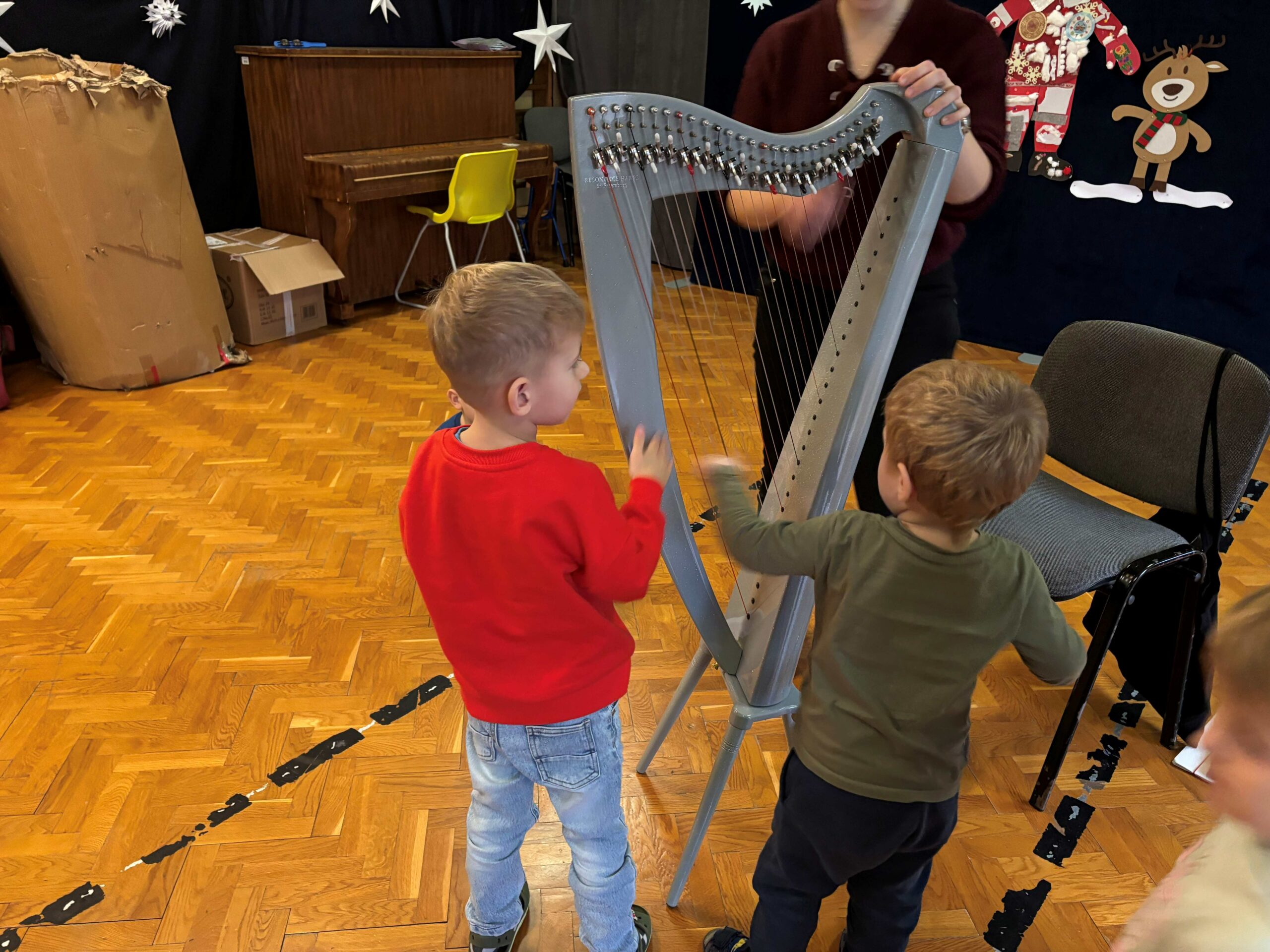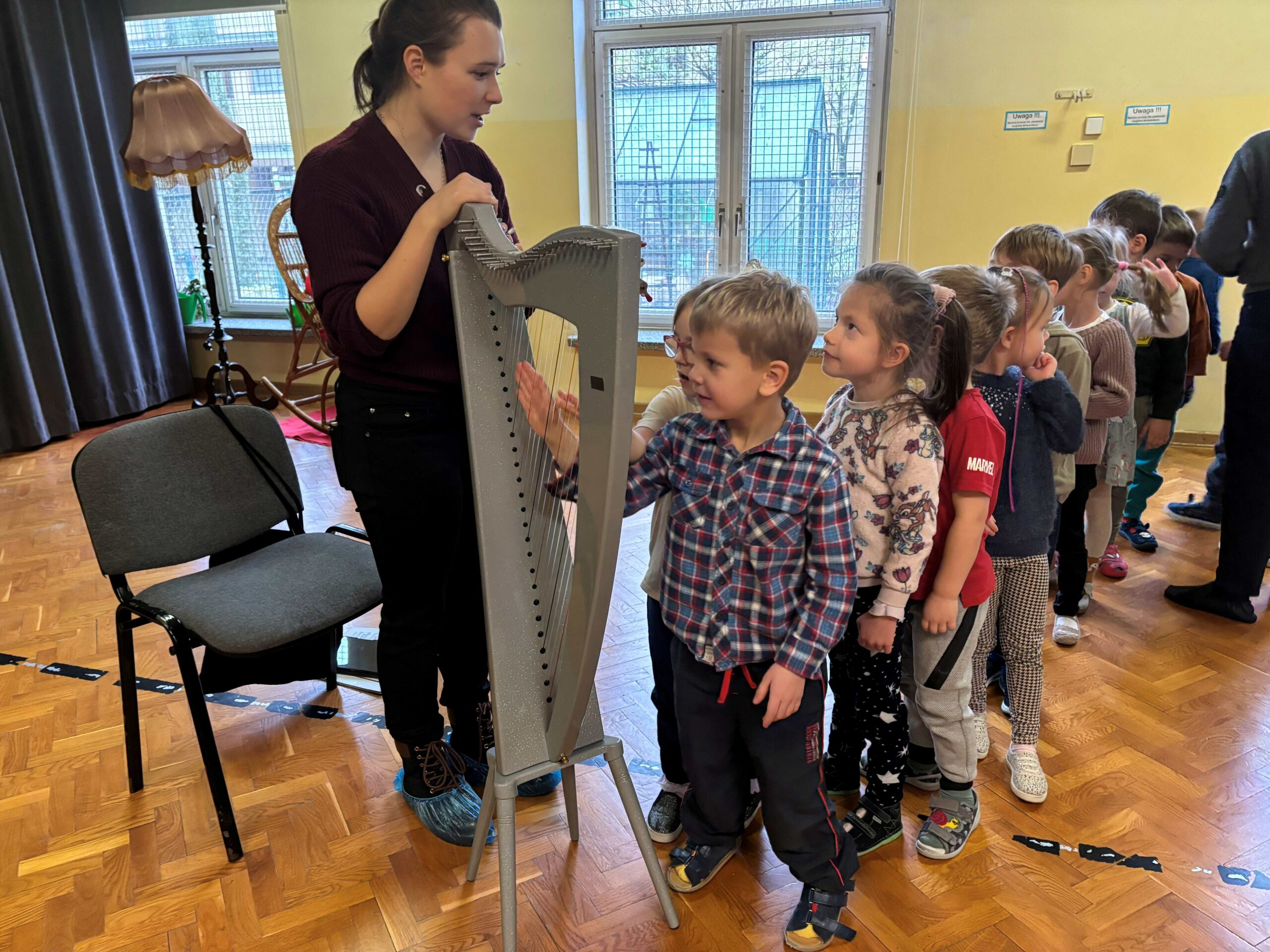 W środę 26 listopada w przedszkolu odbył się wyjątkowy koncert edukacyjny. Dzieci miały okazję poznać jeden z najstarszych instrumentów strunowych – harfę. Miła pani harfistka opowiedziała nam wiele ciekawostek i zagrała kilka utworów. Dowiedzieliśmy się, że harfa jest bardzo popularna w Irlandii. Oprócz muzyki klasycznej mogliśmy też posłuchać znanej wszystkim piosenki „Baby shark” i oczywiście pobawić się do niej. Na koniec każde dziecko sprawdzało, jak gra się na harfie. To było interesujące i pełne wrażeń artystycznych spotkanie.