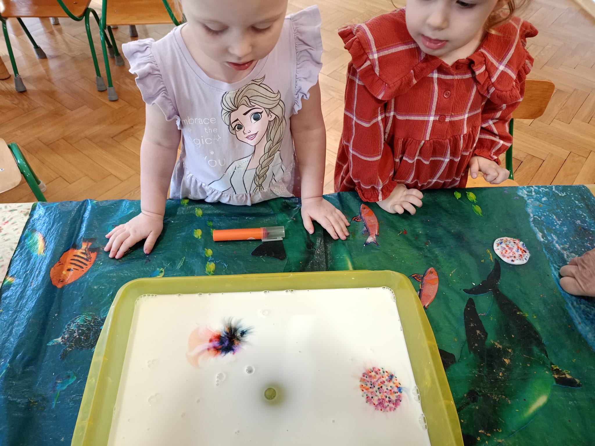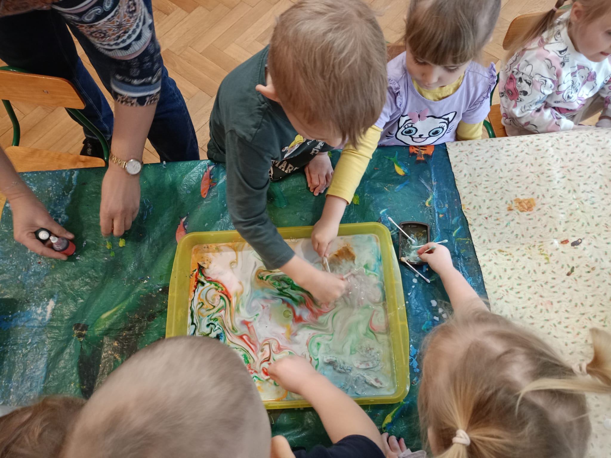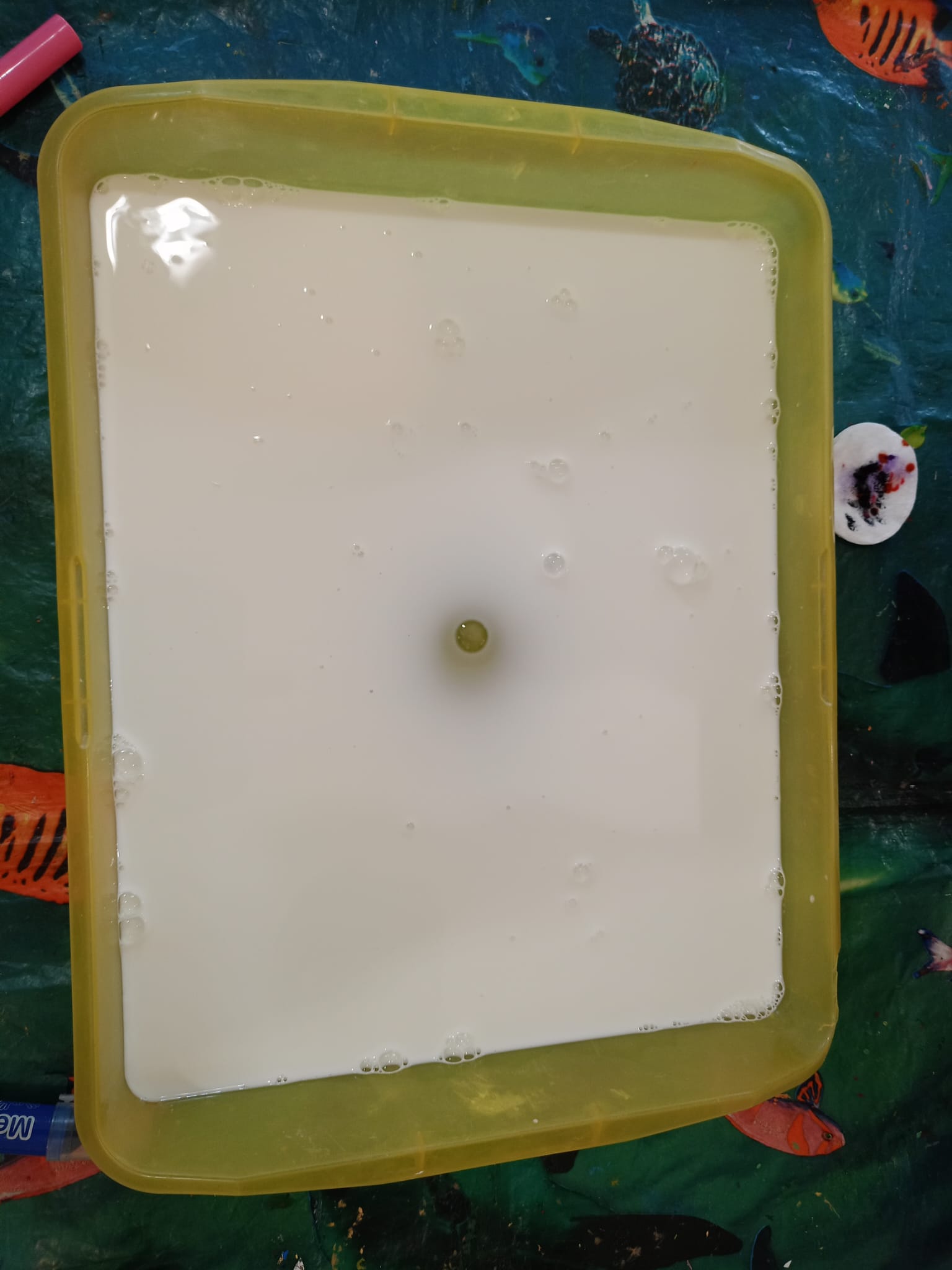 Dzieci miały okazję obserwować, jak kolory łączą się i przenikają, tworząc barwne, dynamiczne kompozycje. Kilka kropel farby i odrobina „magii” sprawiły, że na powierzchni mleka powstawały zachwycające wzory – wirujące, mieszające się i zmieniające niczym tęcza.