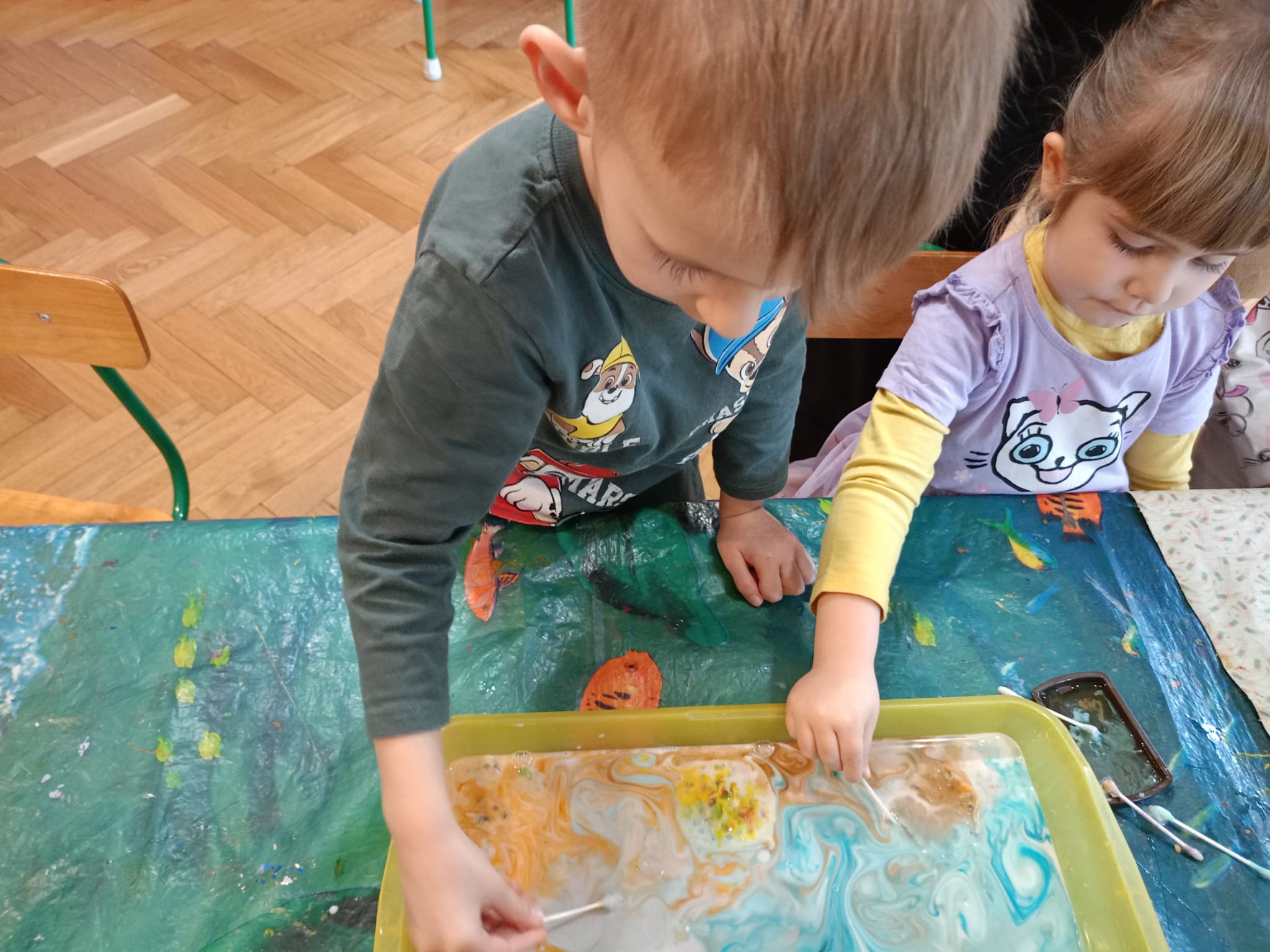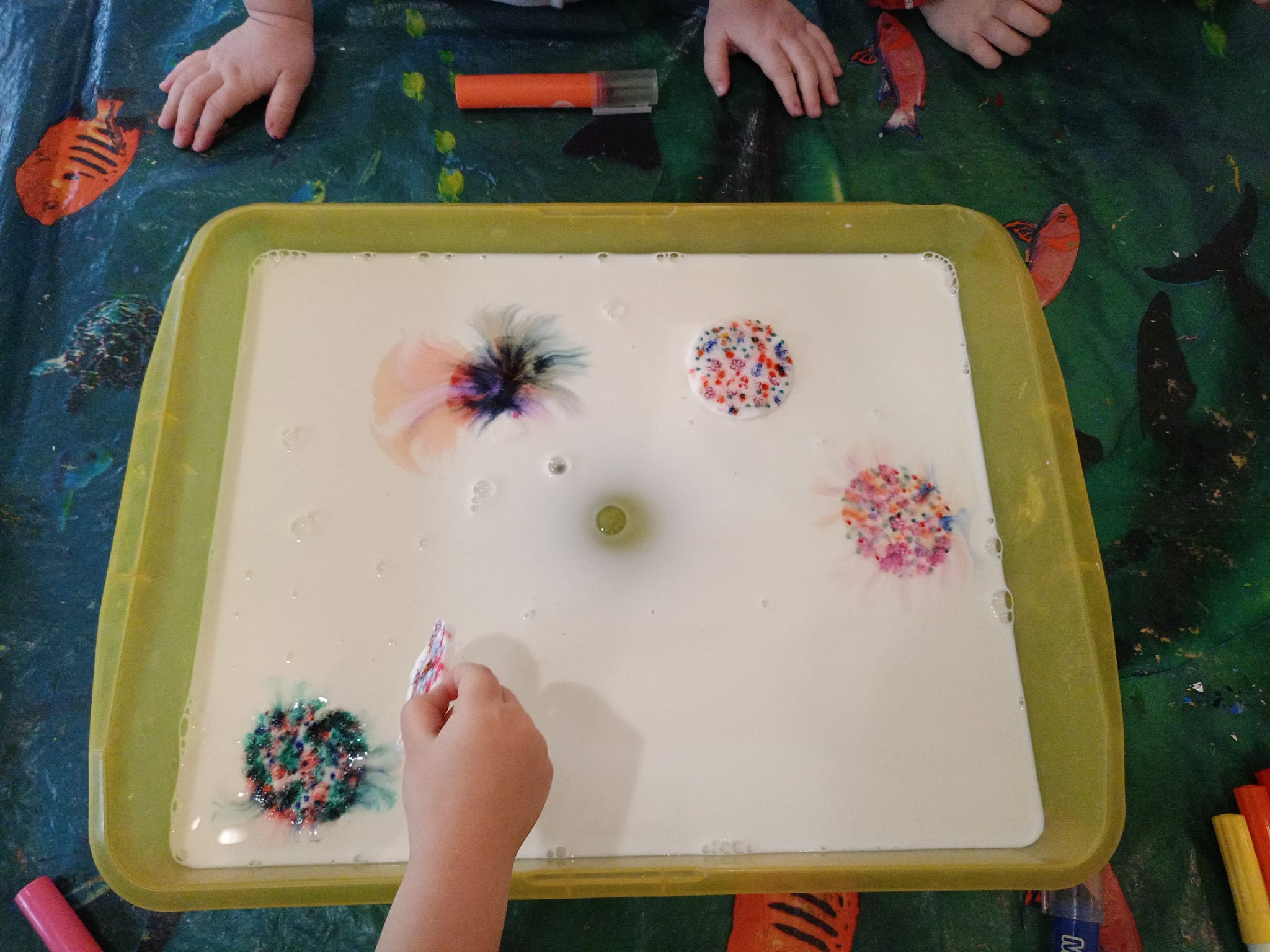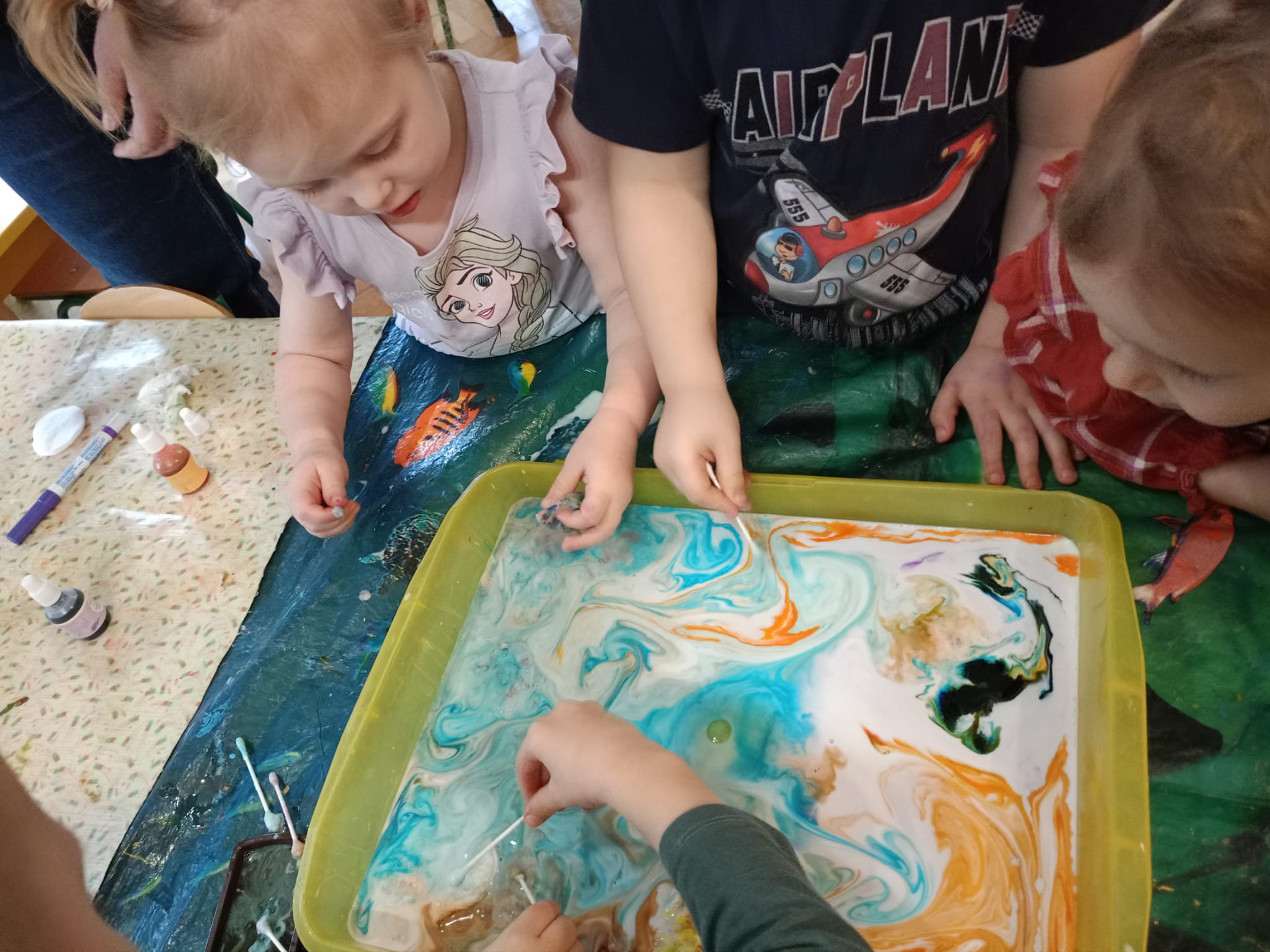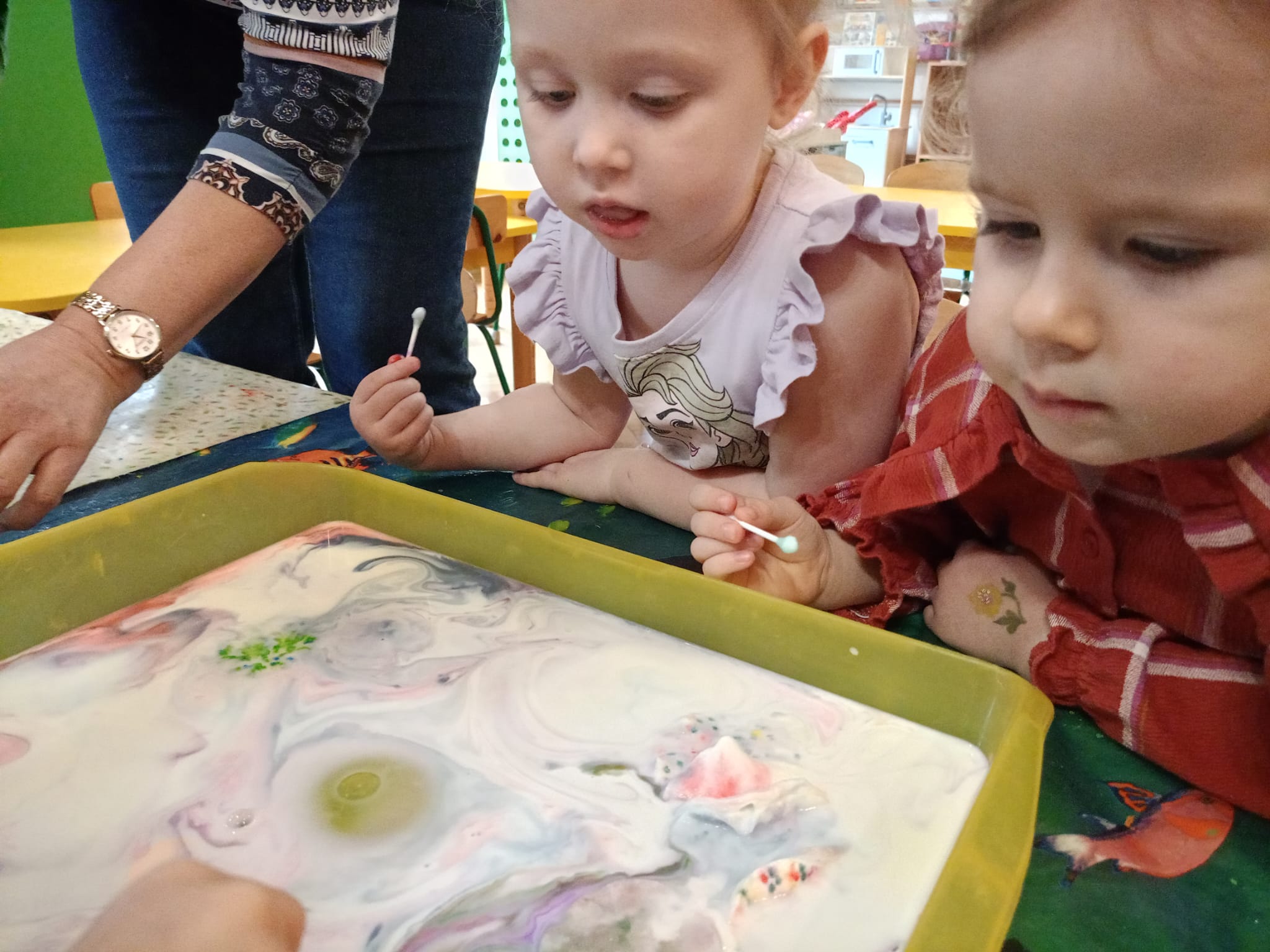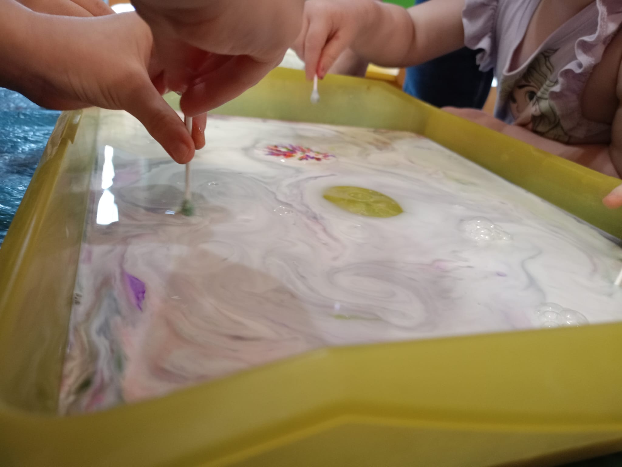 Najmłodsi „Odkrywcy kolorów i dźwięków” malują na mleku.