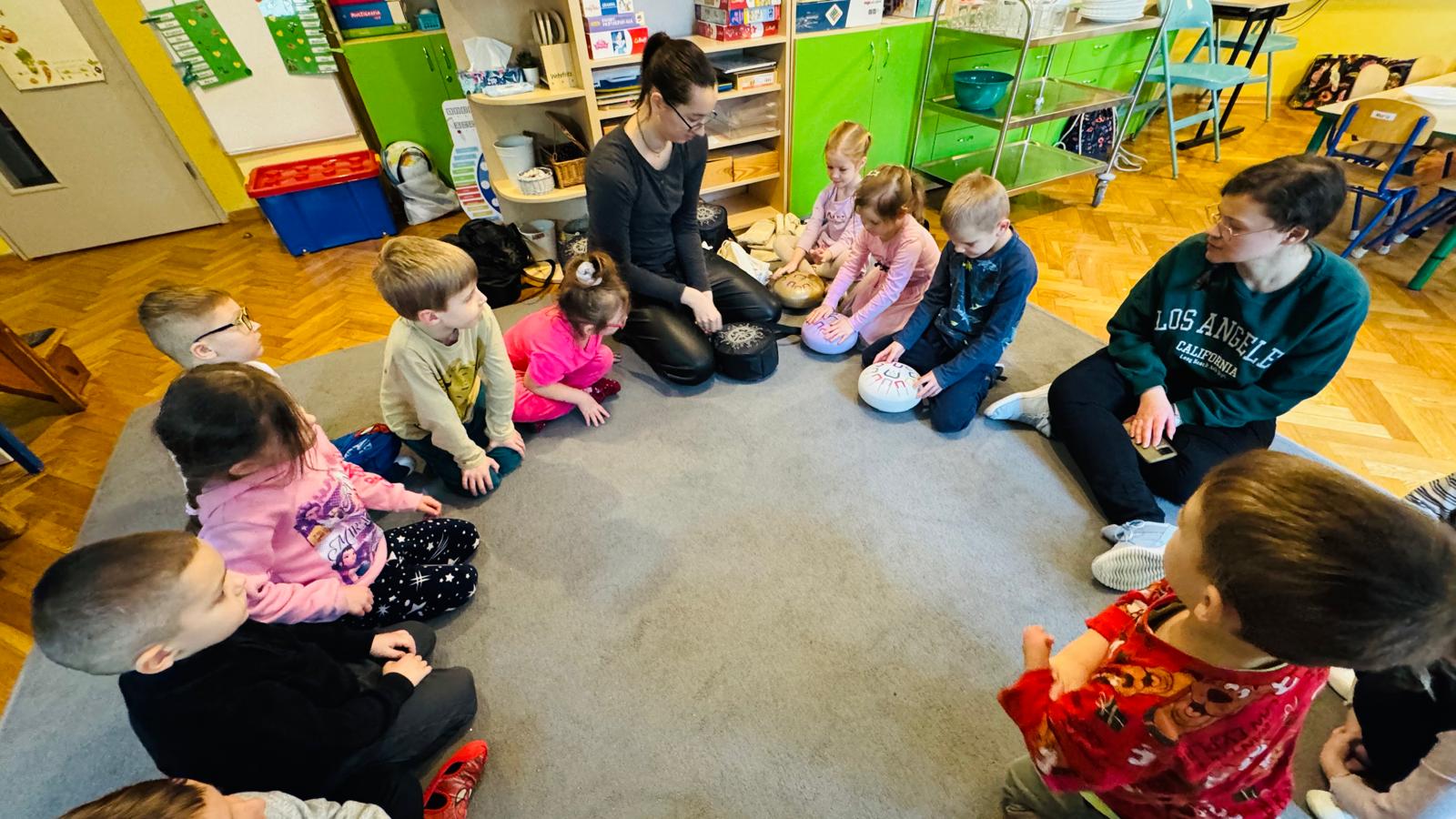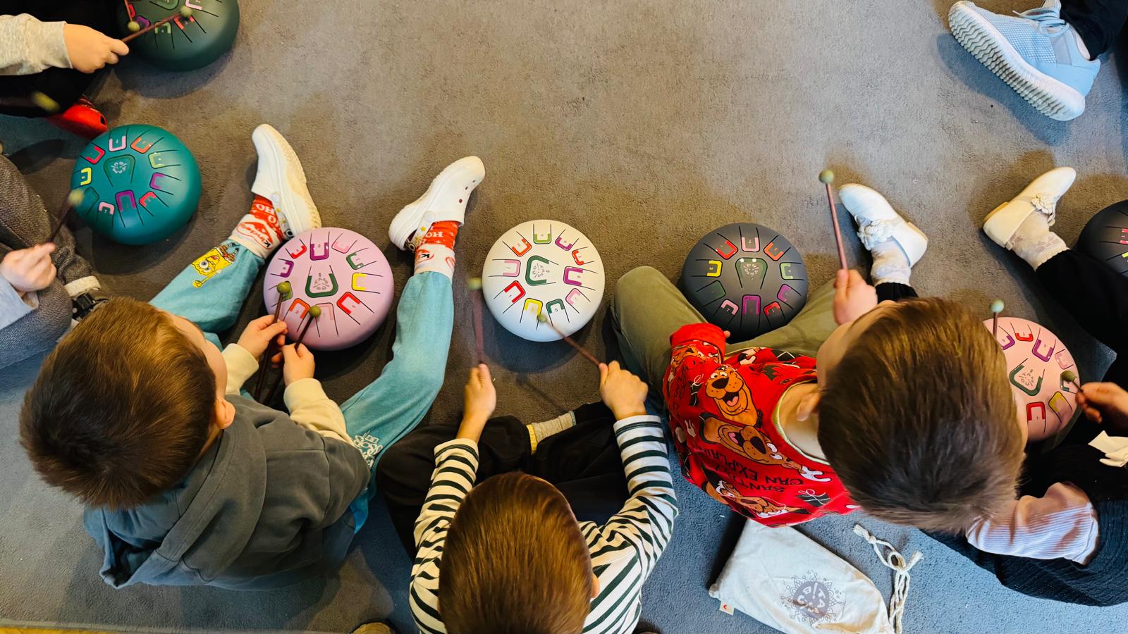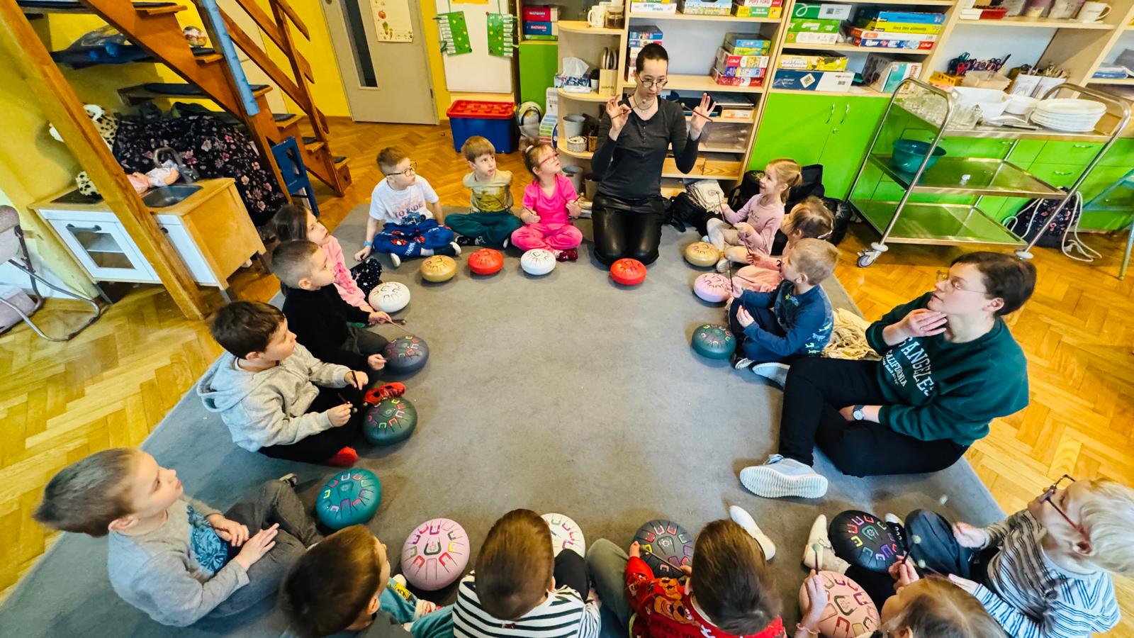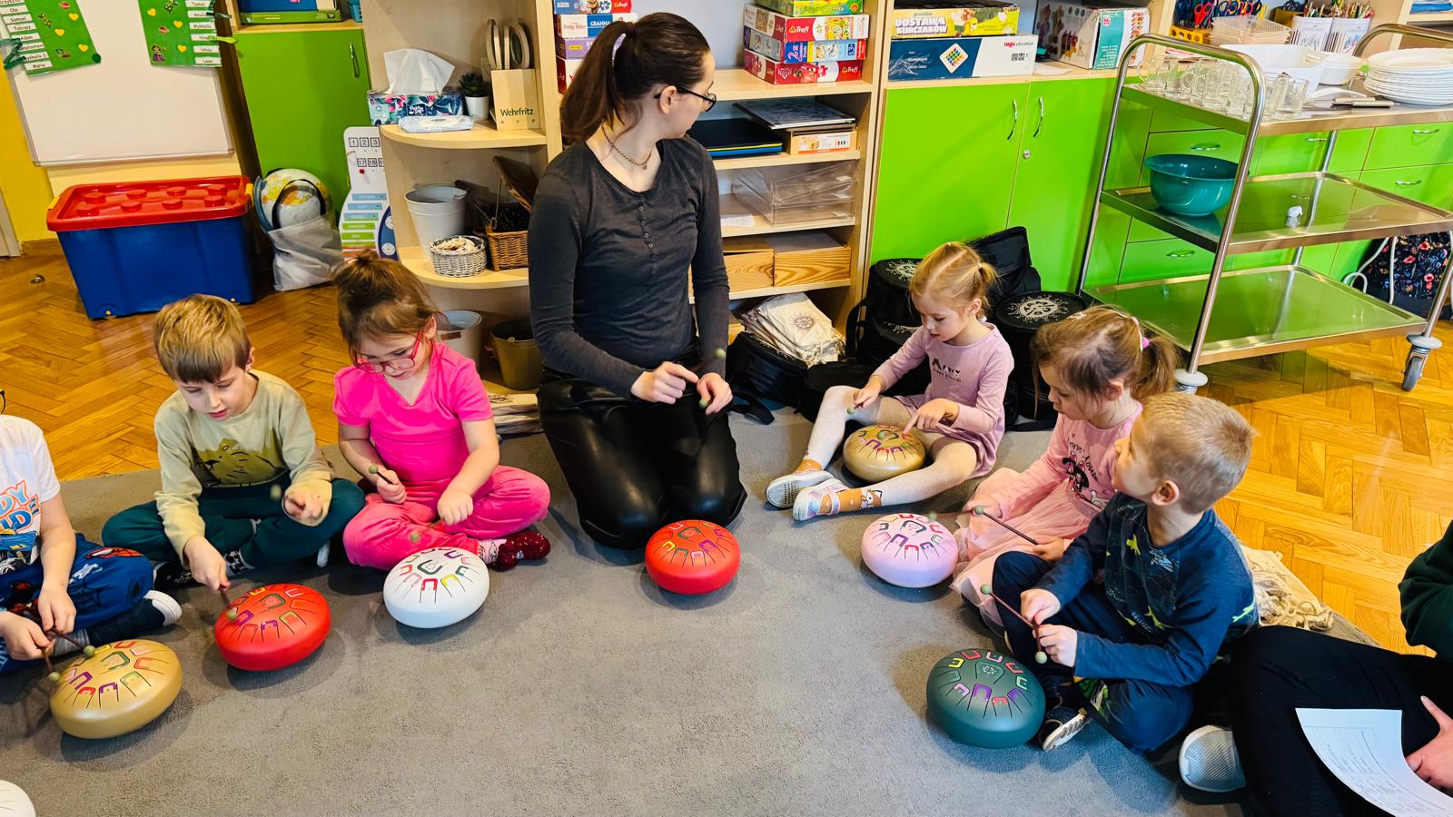Żeby zostać ślimakiem, wcale nie trzeba deszczu, ani liścia sałaty. Wystarczą dwie pałeczki, odrobina wyobraźni i już . Tak właśnie na dziecięcych głowach pojawiły się ślimacze „czułki”, a sala zamieniła się w spokojną, dźwięczną łąkę. Podczas piątkowych zajęć Logorytmiki dzieci wsłuchiwały się w dźwięki tongue drum’ów (bębenków językowych), jak również same wygrywały na nich melodie! Sprawdzały , jak brzmi język bębenka w kolorze żółtym, a jak ten w kolorze czerwonym. Każdy ton miał swój charakter i własny nastrój. Starszaki sprawdzały również jakie to uczucie, kiedy przestrzeń zostanie wypełniona tonem o tej samej wysokości, zwielokrotnionym przez brzmienia kilkunastu bębenków. Każdy mógł przez chwilę nacieszyć się sposobnością zagrania własnej, całkowicie zaimprowizowanej melodii na forum grupy, a pozostałe dzieci słuchały, czekając na swoją kolej.