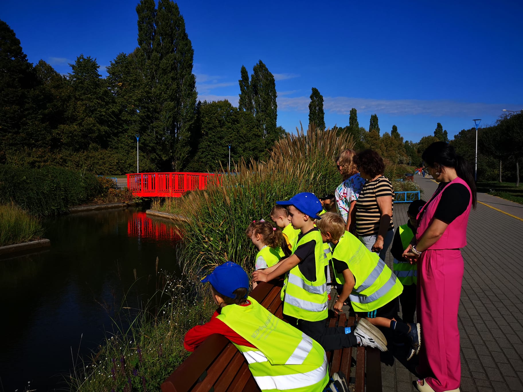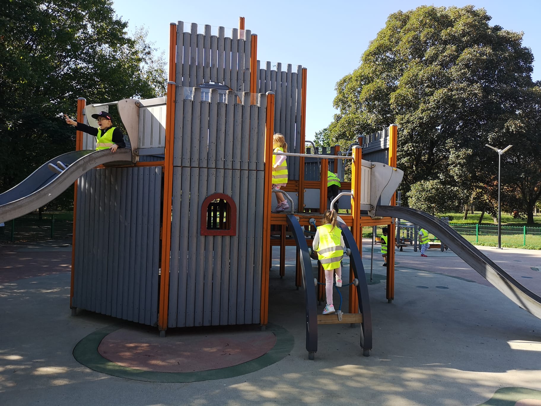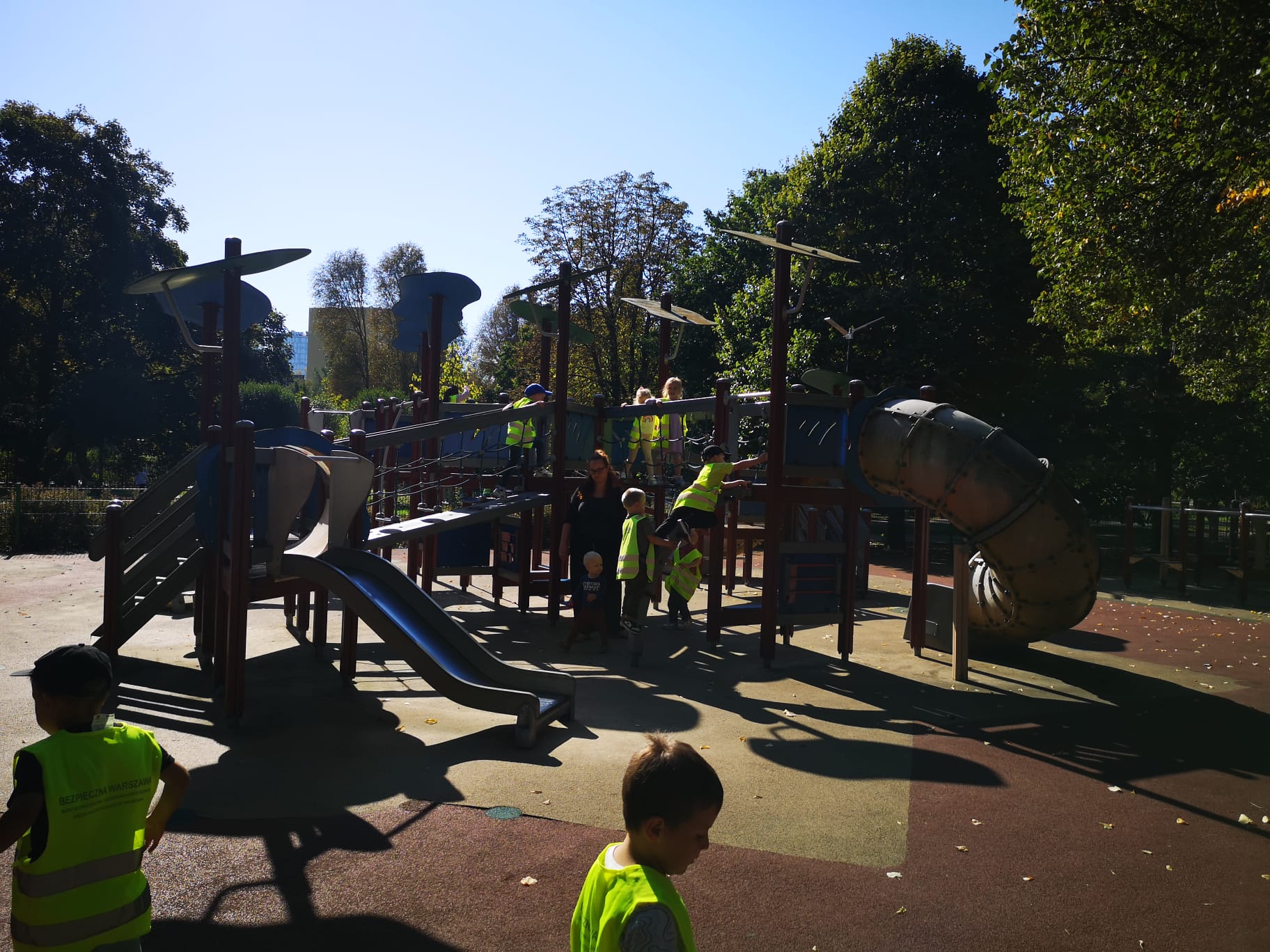 Woda płynęła też w małym kanałku, w którym pluskały się kaczki. Była też wyspa, na której ustawiono ul. A jako wieloletni hodowcy Pszczół Murarek w przedszkolu wiemy, że pszczoły też potrzebują wody do picia:)W parku posadzono młode drzewka i co ciekawe, przy każdym z nich znajdował się duży, zielony worek z wodą . Dzieci dowiedziały się,że jest on systematycznie napełniany i pozwala roślinom rosnąć. Fascynujące sprawy nieprawdaż?! Po tych wszystkich wrażeniach i zgłębianiu wiedzy o wodzie, należała się „Strażnikom Wody” chwila oddechu na fantastycznym placu zabaw i pierwsze zbiory kasztanów:)