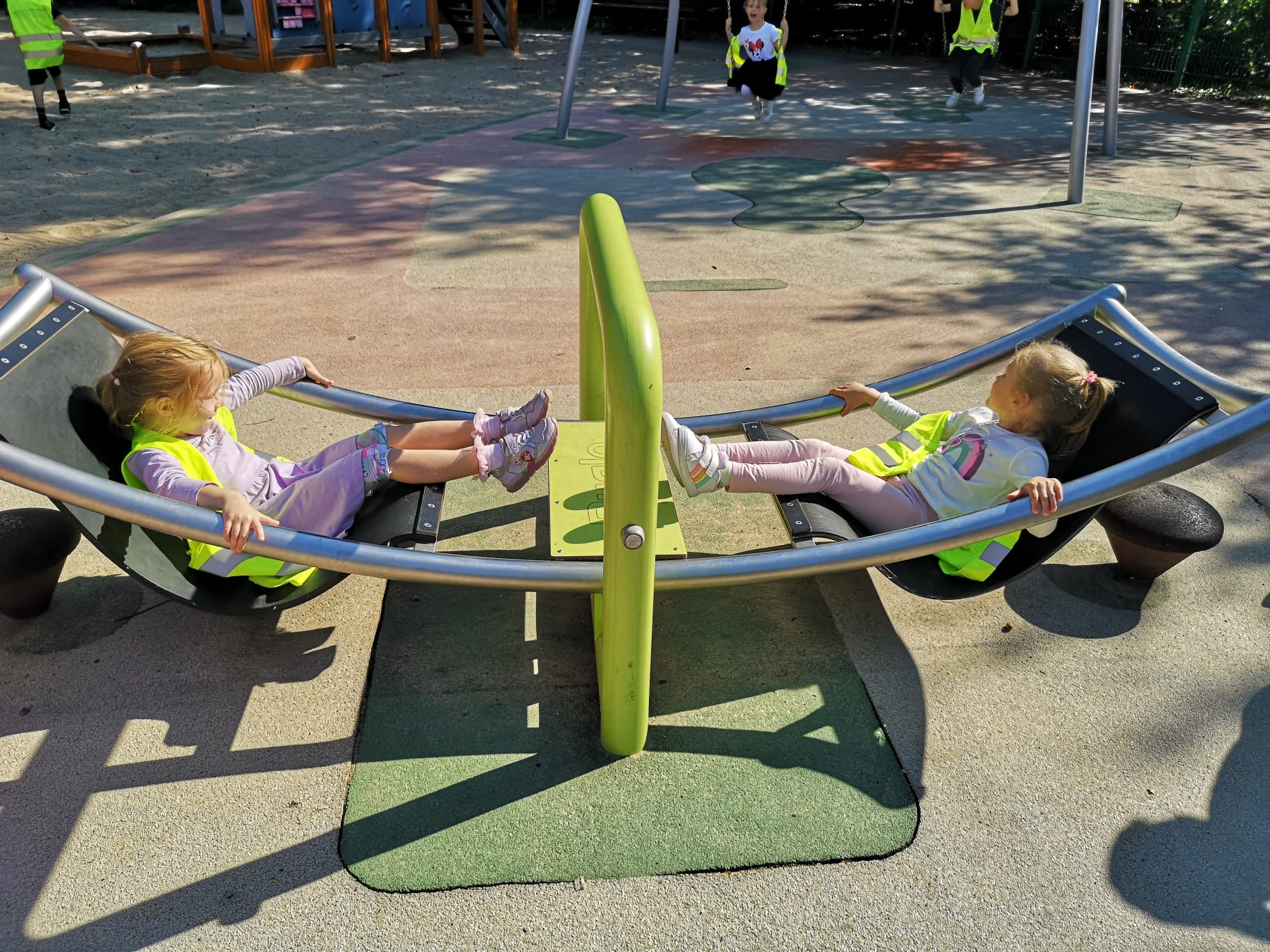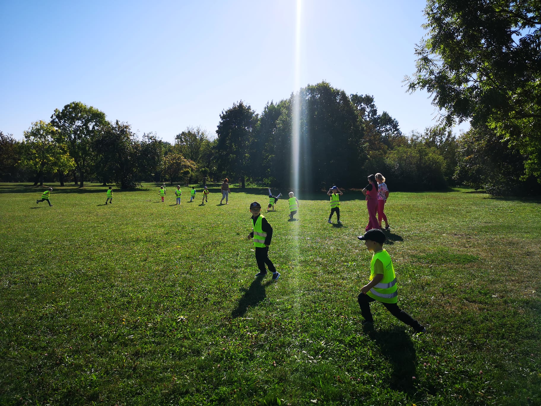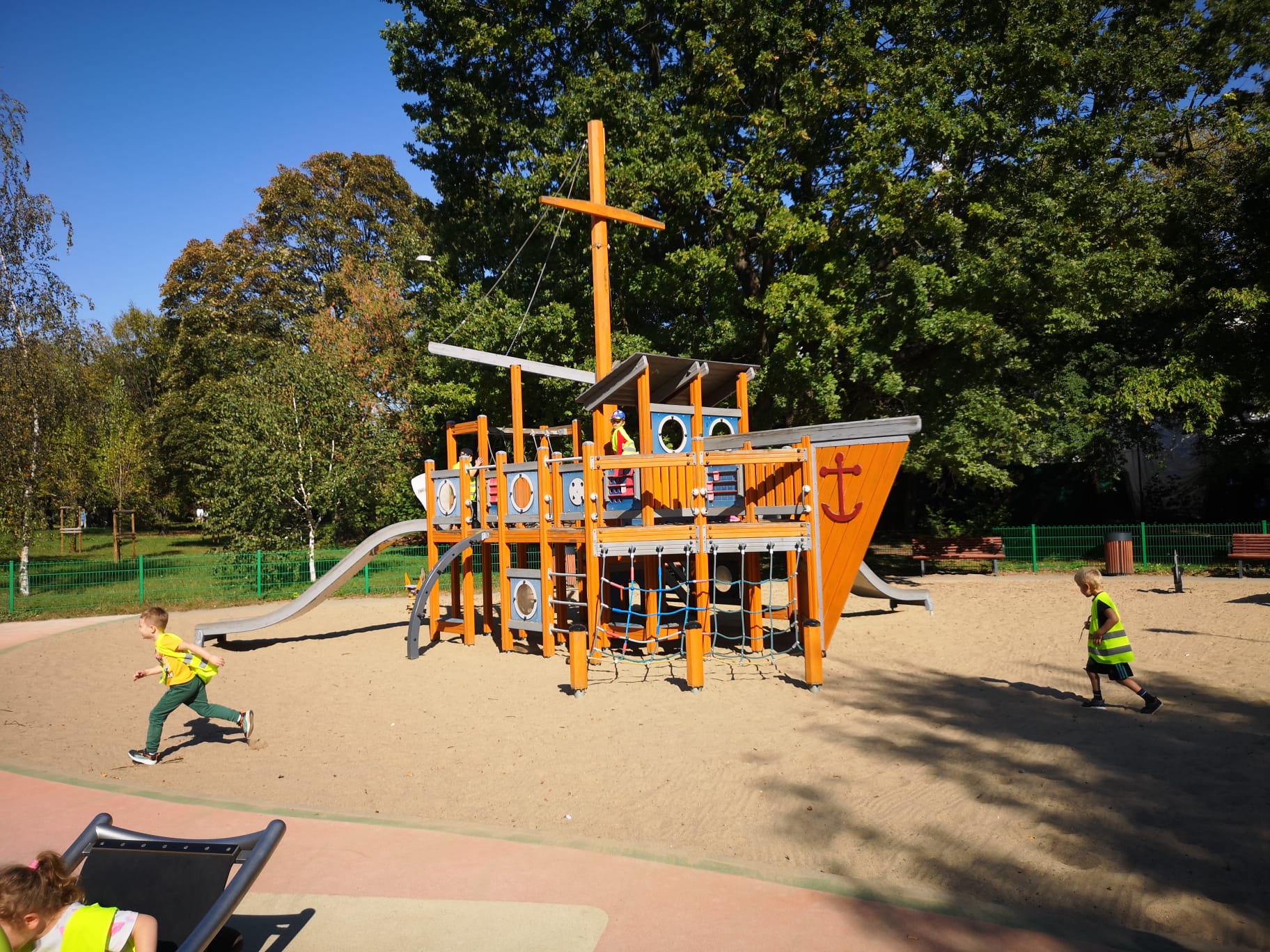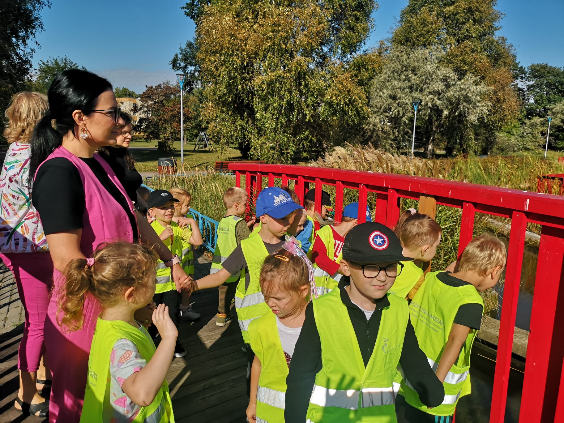 Woda płynęła też w małym kanałku, w którym pluskały się kaczki. Była też wyspa, na której ustawiono ul. A jako wieloletni hodowcy Pszczół Murarek w przedszkolu wiemy, że pszczoły też potrzebują wody do picia:)W parku posadzono młode drzewka i co ciekawe, przy każdym z nich znajdował się duży, zielony worek z wodą . Dzieci dowiedziały się,że jest on systematycznie napełniany i pozwala roślinom rosnąć. Fascynujące sprawy nieprawdaż?! Po tych wszystkich wrażeniach i zgłębianiu wiedzy o wodzie, należała się „Strażnikom Wody” chwila oddechu na fantastycznym placu zabaw i pierwsze zbiory kasztanów:)