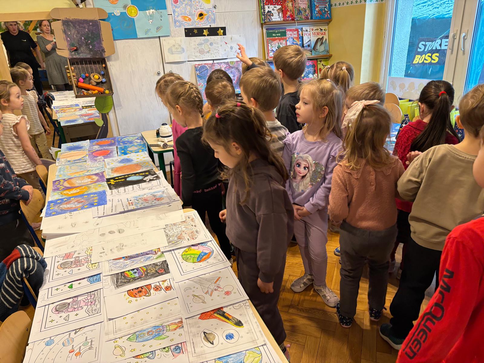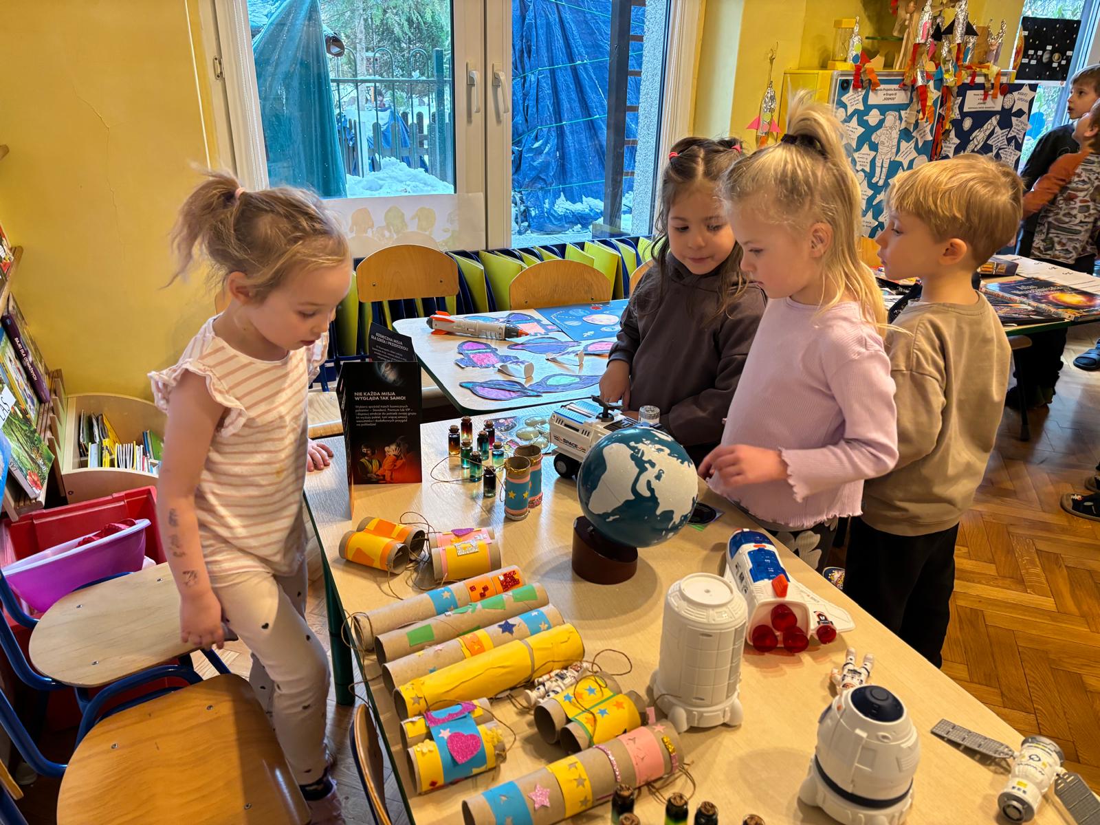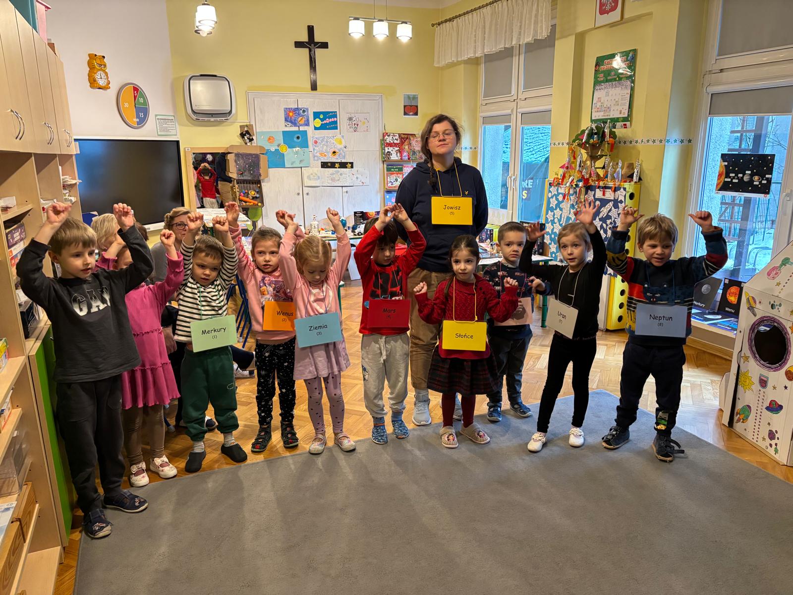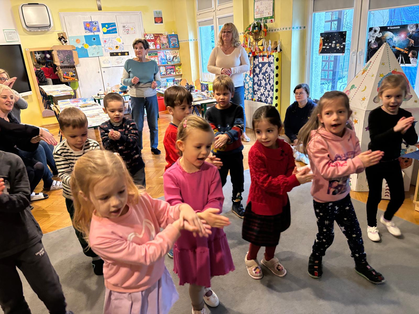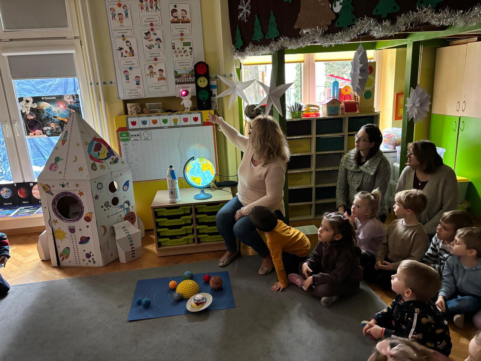23 stycznia przed południem salę najstarszej grupy wypełnił gwar i śmiech. A to za sprawą wizyty Średniaków ze swoimi Paniami. Powodem ich odwiedzin było zakończenie przez Starszaki trwającego 3 tygodnie projektu badawczego „Kosmos”. Chcąc się pochwalić efektami swojej pracy, zaprosiły na uroczyste zakończenie młodszych kolegów wraz z Paniami, Panią Dyrektor i Panią Logopedę. Na początku Pani Renatka opowiedziała zebranym gościom o tym, co się działo podczas tych minionych trzech tygodniu. A było o czym opowiadać…Starszaki wraz ze swoimi Paniami: były na wycieczce w KosmoParku, oglądały filmy naukowe, robiły rakiety z rolek, lunety i lornetki, witraże, szkicowały, rysowały historie własne związane z kosmosem, kalkowały planety, pokolorowały mnóstwo kolorowanek kosmicznych, wykonały kosmos w słoiku, eksperymentowały, stworzyły makietę układu słonecznego, zbudowały wielką rakietę z kartonu, razem z rodzicami przedstawiły różnymi technikami ulubione elementy kosmiczne, a na koniec przeprowadziły w przedszkolu ankietę sprawdzającą zainteresowania kosmiczne wszystkich dzieci i dorosłych .Uff- było tego trochę! Średniaki wykazały się dużą wiedzą na temat kosmosu podczas krótkiego quizu .Po części teoretycznej nadszedł czas na występ artystyczny Starszaków. Zaprezentowały piosenkę o układzie słonecznym, wierszyk o podróży kosmicznej , piosenkę o wyścigu planet ilustrowaną ruchem oraz zatańczyły taniec rakietowy:) Po oklaskach gości , Pani Ewa zaprosiła wszystkich dużych i małych do wspólnej kosmicznej zabawy. Najpierw tanecznym krokiem uczestnicy odbyli podróż na nieznane planety np. skoczkową, kurzową czy żabkową , a potem dzieci w trójeczkach zamieniały się w przerwie tańcowania w planety : Saturna, Jowisza, Marsa i Ziemię. Śmiechu było co nie miara:) Po krótkim oddechowym odpoczynku Starszaki zaprosiły gości do zwiedzania zgromadzonych eksponatów, by wreszcie na koniec wszyscy poczęstowali się kosmicznymi przekąskami czyli małymi planetkami i gwiazdkowymi pierniczkami- mniam! Było miło i wesoło, a wszyscy pożegnali się bardzo zadowoleni z kosmicznego spotkania:)