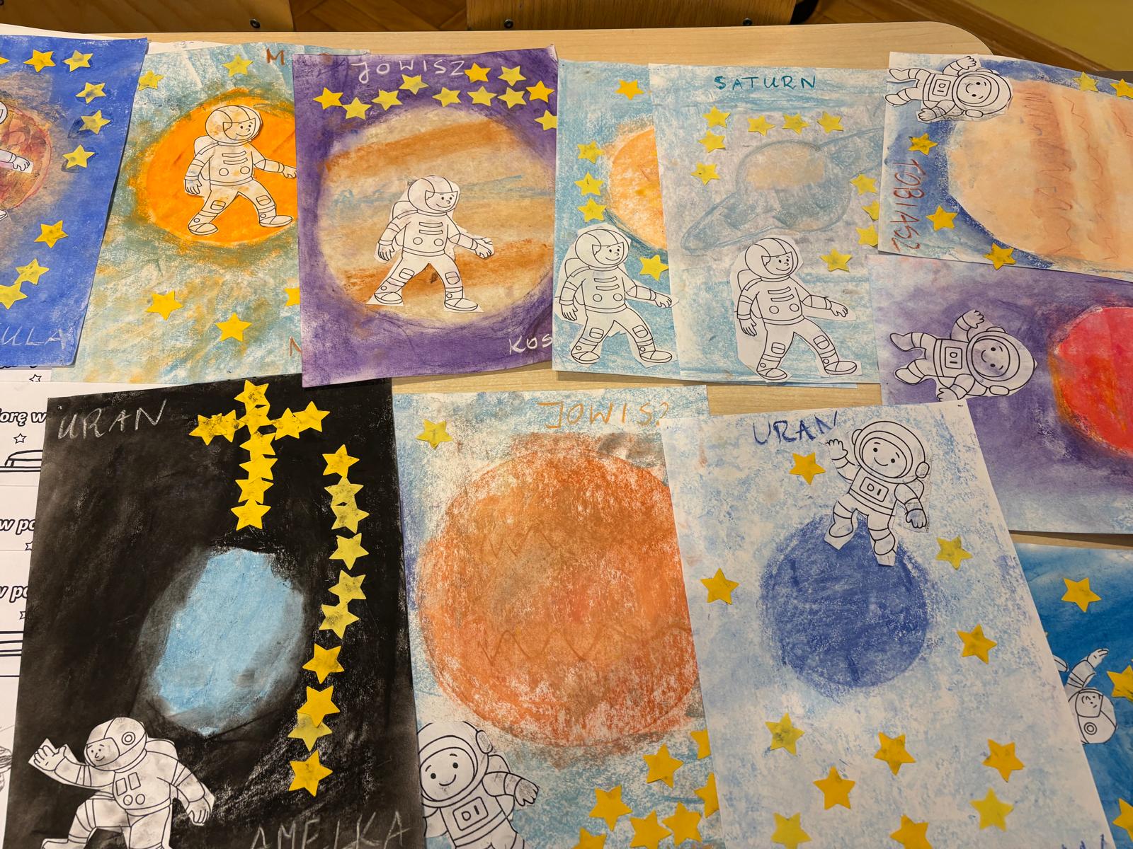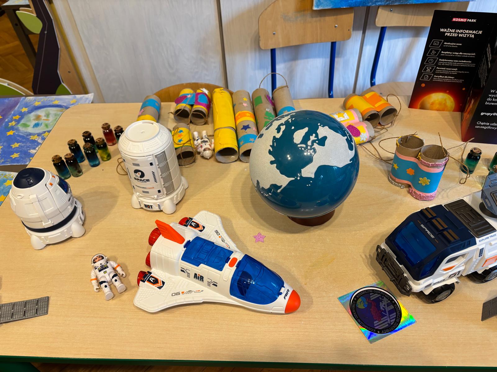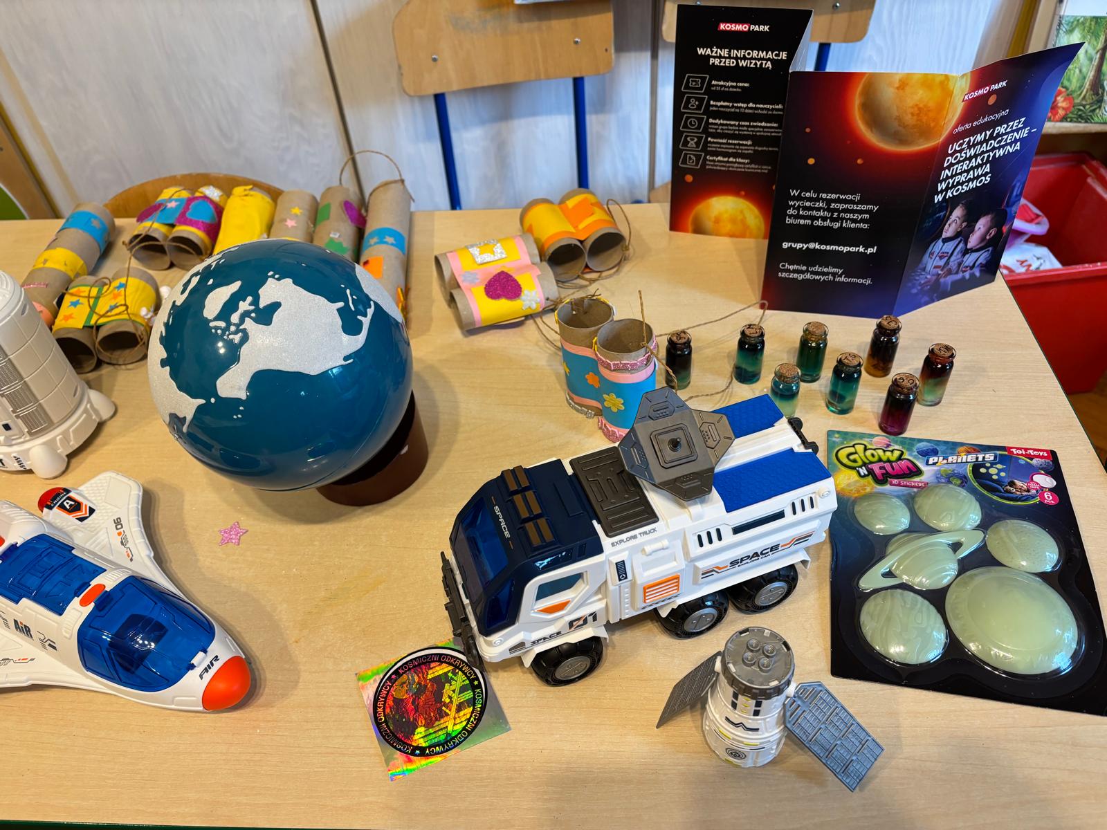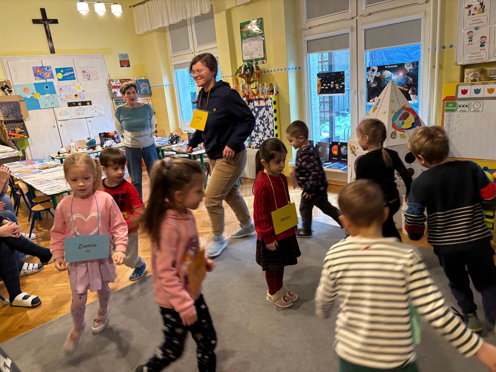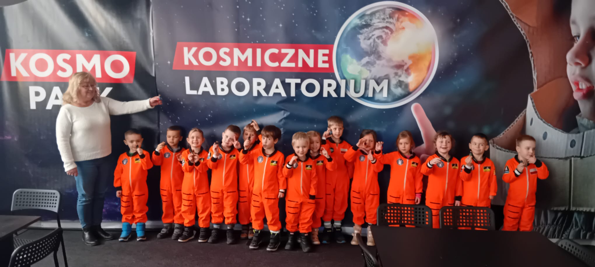 23 stycznia przed południem salę najstarszej grupy wypełnił gwar i śmiech. A to za sprawą wizyty Średniaków ze swoimi Paniami. Powodem ich odwiedzin było zakończenie przez Starszaki trwającego 3 tygodnie projektu badawczego „Kosmos”. Chcąc się pochwalić efektami swojej pracy, zaprosiły na uroczyste zakończenie młodszych kolegów wraz z Paniami, Panią Dyrektor i Panią Logopedę. Na początku Pani Renatka opowiedziała zebranym gościom o tym, co się działo podczas tych minionych trzech tygodniu. A było o czym opowiadać…Starszaki wraz ze swoimi Paniami: były na wycieczce w KosmoParku, oglądały filmy naukowe, robiły rakiety z rolek, lunety i lornetki, witraże, szkicowały, rysowały historie własne związane z kosmosem, kalkowały planety, pokolorowały mnóstwo kolorowanek kosmicznych, wykonały kosmos w słoiku, eksperymentowały, stworzyły makietę układu słonecznego, zbudowały wielką rakietę z kartonu, razem z rodzicami przedstawiły różnymi technikami ulubione elementy kosmiczne, a na koniec przeprowadziły w przedszkolu ankietę sprawdzającą zainteresowania kosmiczne wszystkich dzieci i dorosłych .Uff- było tego trochę! Średniaki wykazały się dużą wiedzą na temat kosmosu podczas krótkiego quizu .Po części teoretycznej nadszedł czas na występ artystyczny Starszaków. Zaprezentowały piosenkę o układzie słonecznym, wierszyk o podróży kosmicznej , piosenkę o wyścigu planet ilustrowaną ruchem oraz zatańczyły taniec rakietowy:) Po oklaskach gości , Pani Ewa zaprosiła wszystkich dużych i małych do wspólnej kosmicznej zabawy. Najpierw tanecznym krokiem uczestnicy odbyli podróż na nieznane planety np. skoczkową, kurzową czy żabkową , a potem dzieci w trójeczkach zamieniały się w przerwie tańcowania w planety : Saturna, Jowisza, Marsa i Ziemię. Śmiechu było co nie miara:) Po krótkim oddechowym odpoczynku Starszaki zaprosiły gości do zwiedzania zgromadzonych eksponatów, by wreszcie na koniec wszyscy poczęstowali się kosmicznymi przekąskami czyli małymi planetkami i gwiazdkowymi pierniczkami- mniam! Było miło i wesoło, a wszyscy pożegnali się bardzo zadowoleni z kosmicznego spotkania:)