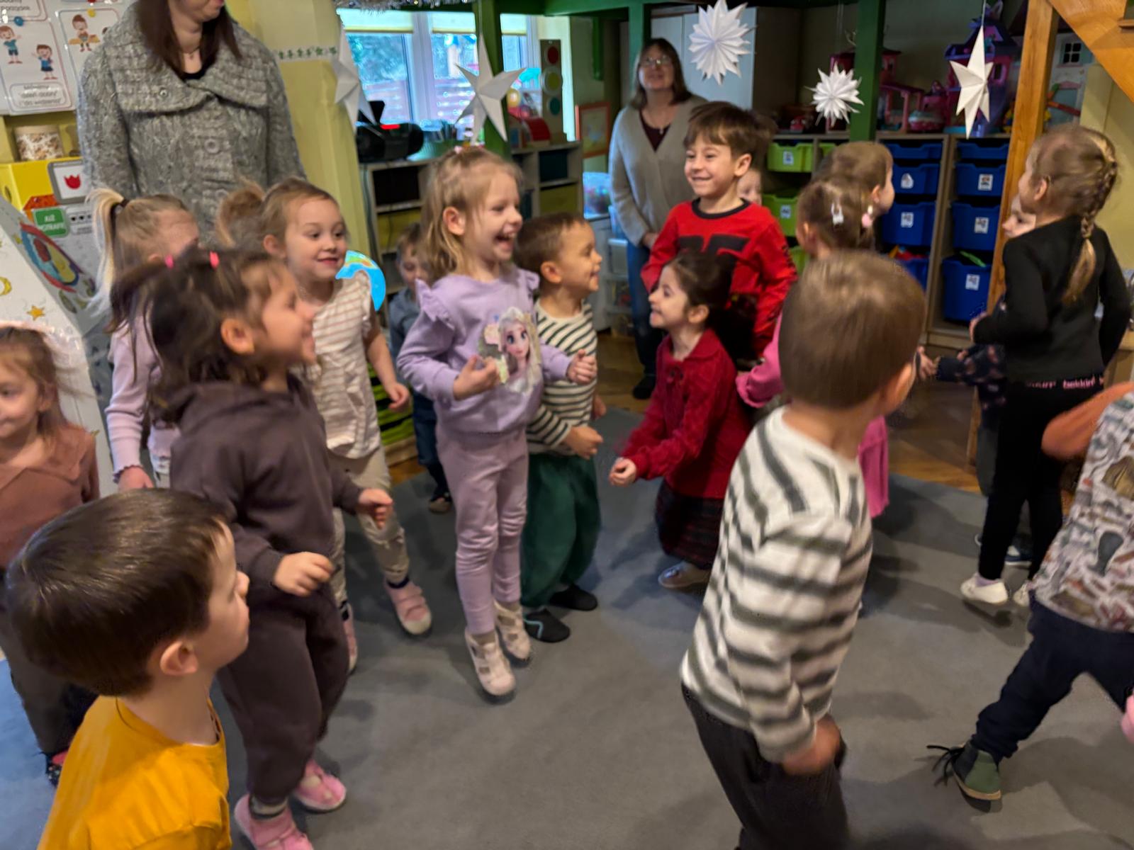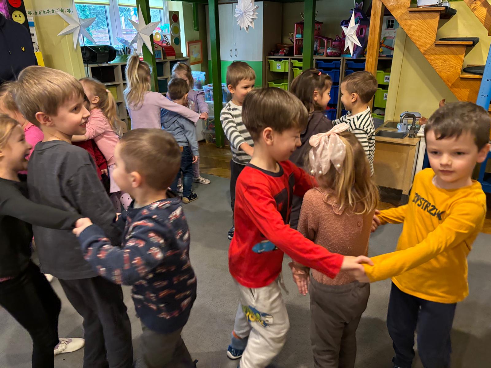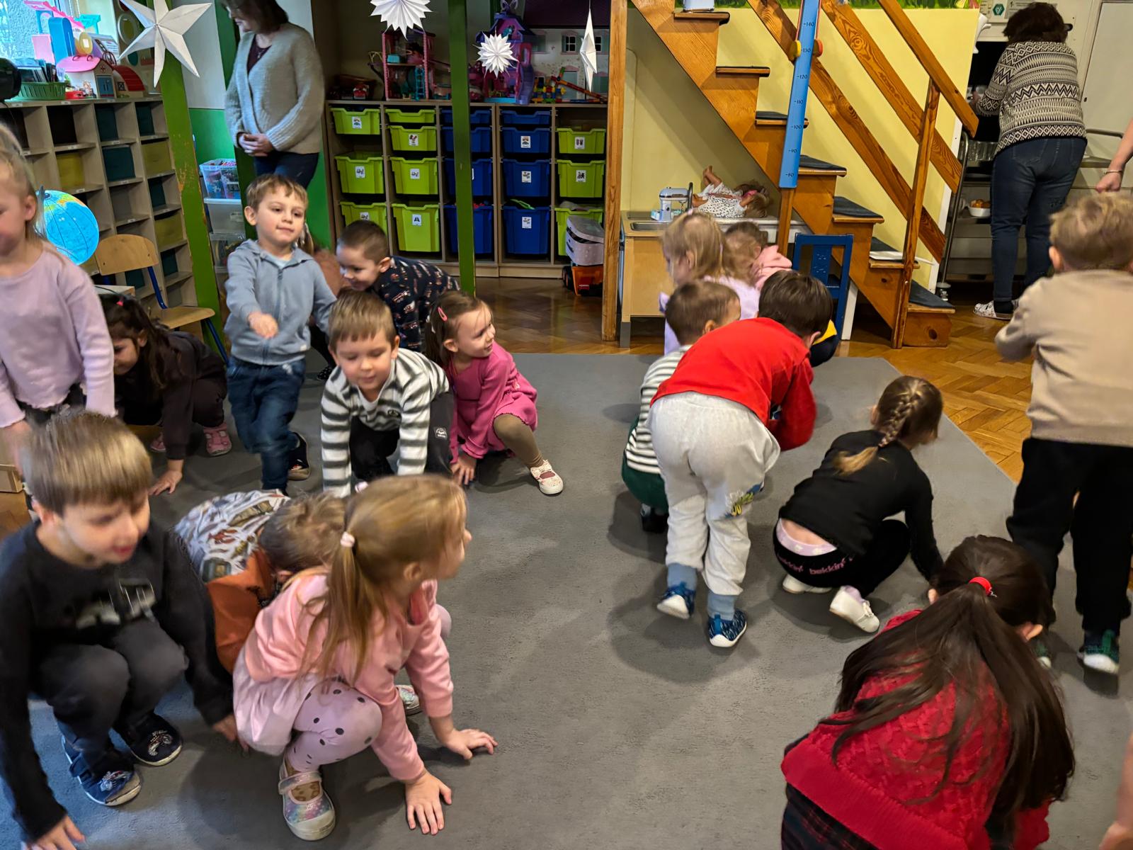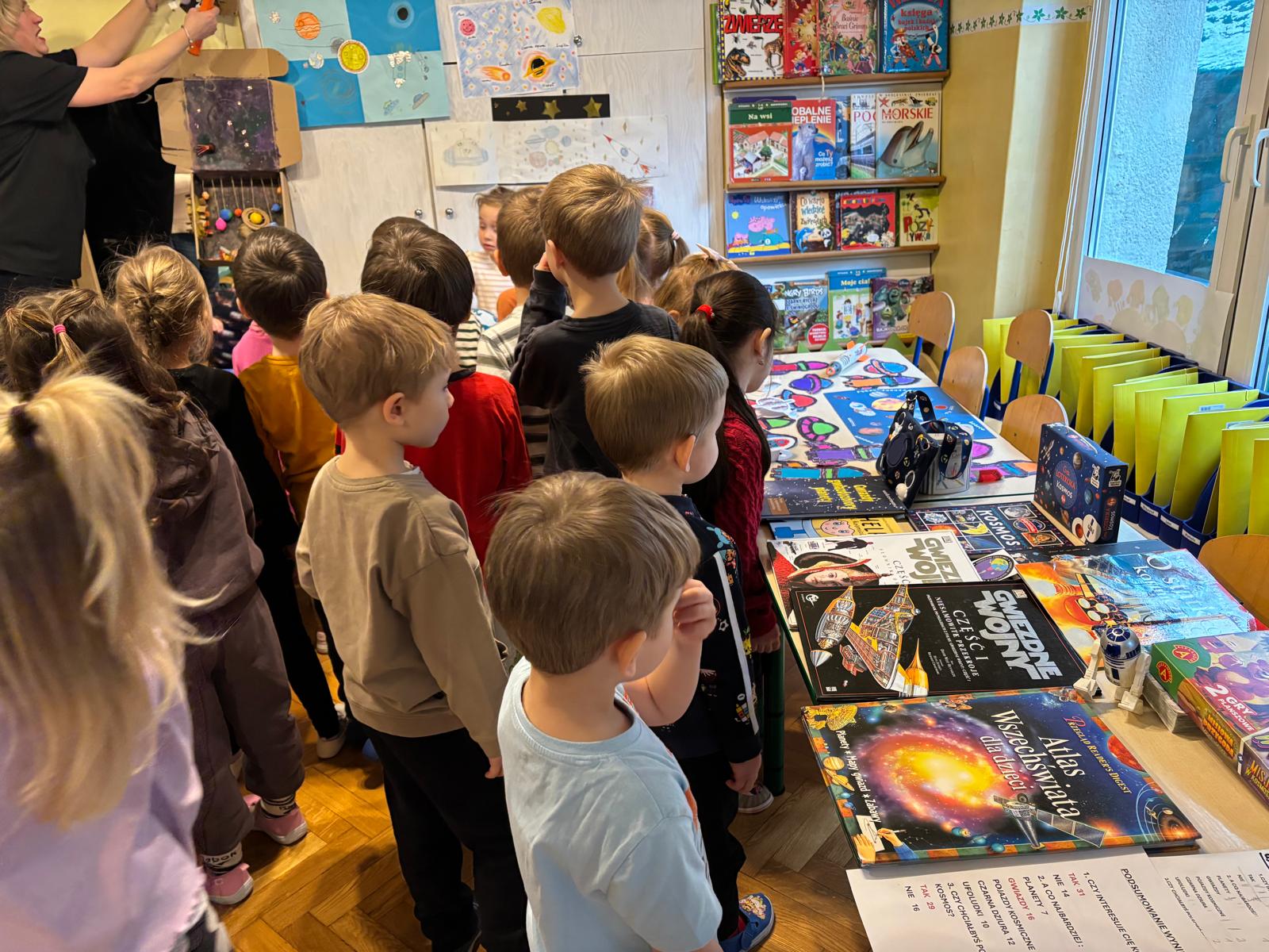 23 stycznia przed południem salę najstarszej grupy wypełnił gwar i śmiech. A to za sprawą wizyty Średniaków ze swoimi Paniami. Powodem ich odwiedzin było zakończenie przez Starszaki trwającego 3 tygodnie projektu badawczego „Kosmos”. Chcąc się pochwalić efektami swojej pracy, zaprosiły na uroczyste zakończenie młodszych kolegów wraz z Paniami, Panią Dyrektor i Panią Logopedę. Na początku Pani Renatka opowiedziała zebranym gościom o tym, co się działo podczas tych minionych trzech tygodniu. A było o czym opowiadać…Starszaki wraz ze swoimi Paniami: były na wycieczce w KosmoParku, oglądały filmy naukowe, robiły rakiety z rolek, lunety i lornetki, witraże, szkicowały, rysowały historie własne związane z kosmosem, kalkowały planety, pokolorowały mnóstwo kolorowanek kosmicznych, wykonały kosmos w słoiku, eksperymentowały, stworzyły makietę układu słonecznego, zbudowały wielką rakietę z kartonu, razem z rodzicami przedstawiły różnymi technikami ulubione elementy kosmiczne, a na koniec przeprowadziły w przedszkolu ankietę sprawdzającą zainteresowania kosmiczne wszystkich dzieci i dorosłych .Uff- było tego trochę! Średniaki wykazały się dużą wiedzą na temat kosmosu podczas krótkiego quizu .Po części teoretycznej nadszedł czas na występ artystyczny Starszaków. Zaprezentowały piosenkę o układzie słonecznym, wierszyk o podróży kosmicznej , piosenkę o wyścigu planet ilustrowaną ruchem oraz zatańczyły taniec rakietowy:) Po oklaskach gości , Pani Ewa zaprosiła wszystkich dużych i małych do wspólnej kosmicznej zabawy. Najpierw tanecznym krokiem uczestnicy odbyli podróż na nieznane planety np. skoczkową, kurzową czy żabkową , a potem dzieci w trójeczkach zamieniały się w przerwie tańcowania w planety : Saturna, Jowisza, Marsa i Ziemię. Śmiechu było co nie miara:) Po krótkim oddechowym odpoczynku Starszaki zaprosiły gości do zwiedzania zgromadzonych eksponatów, by wreszcie na koniec wszyscy poczęstowali się kosmicznymi przekąskami czyli małymi planetkami i gwiazdkowymi pierniczkami- mniam! Było miło i wesoło, a wszyscy pożegnali się bardzo zadowoleni z kosmicznego spotkania:)