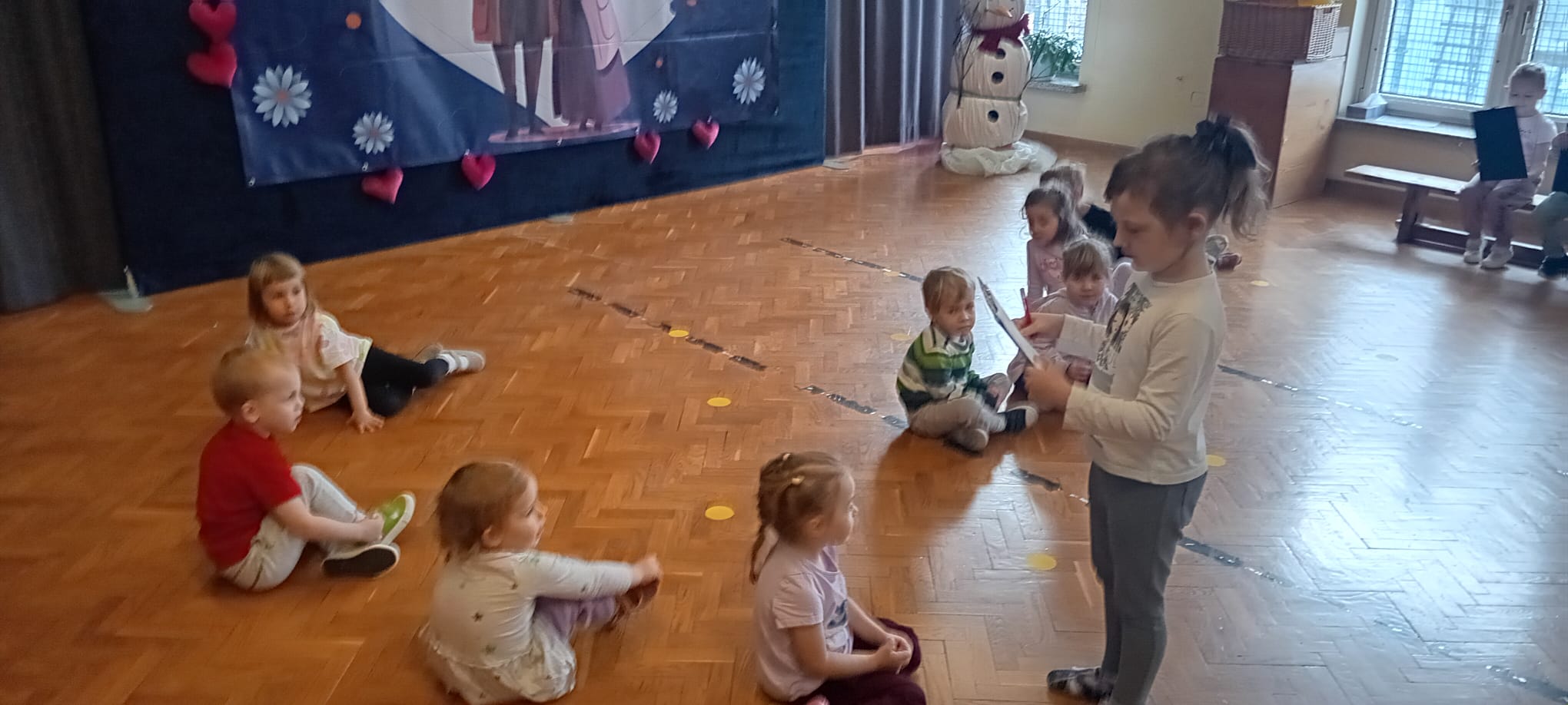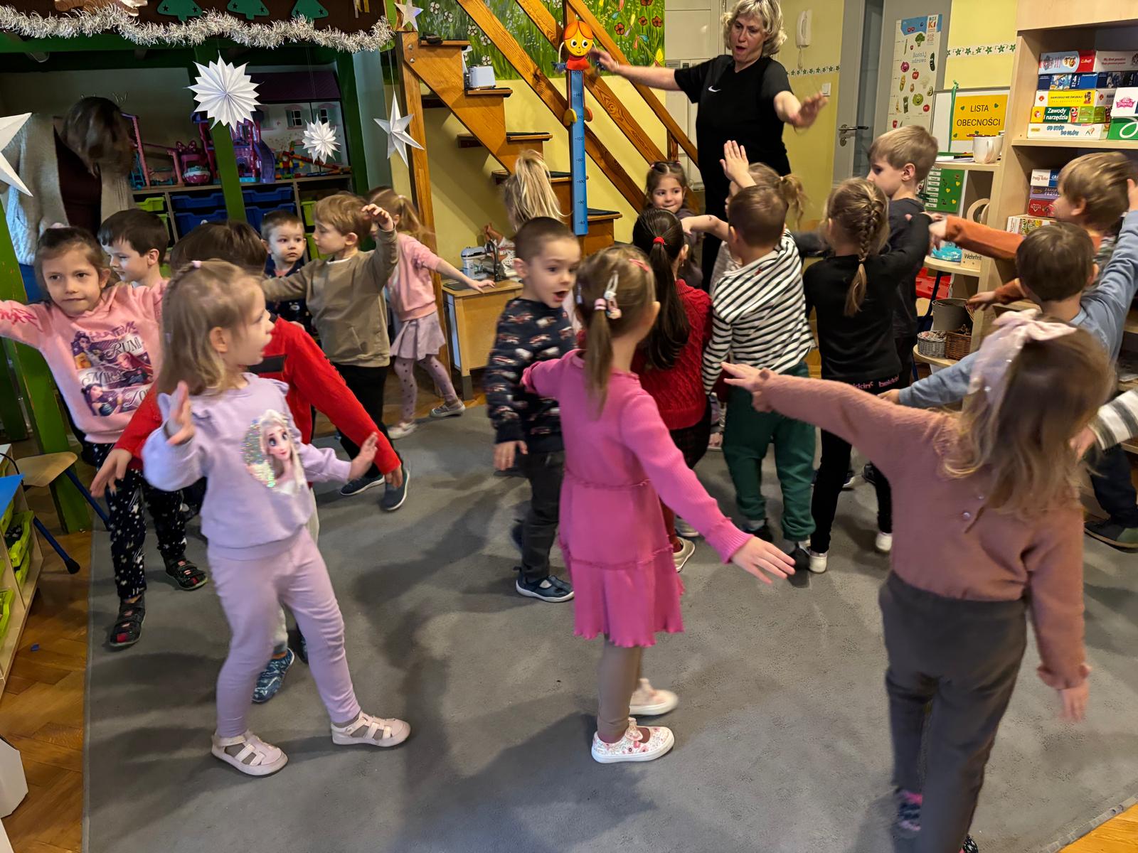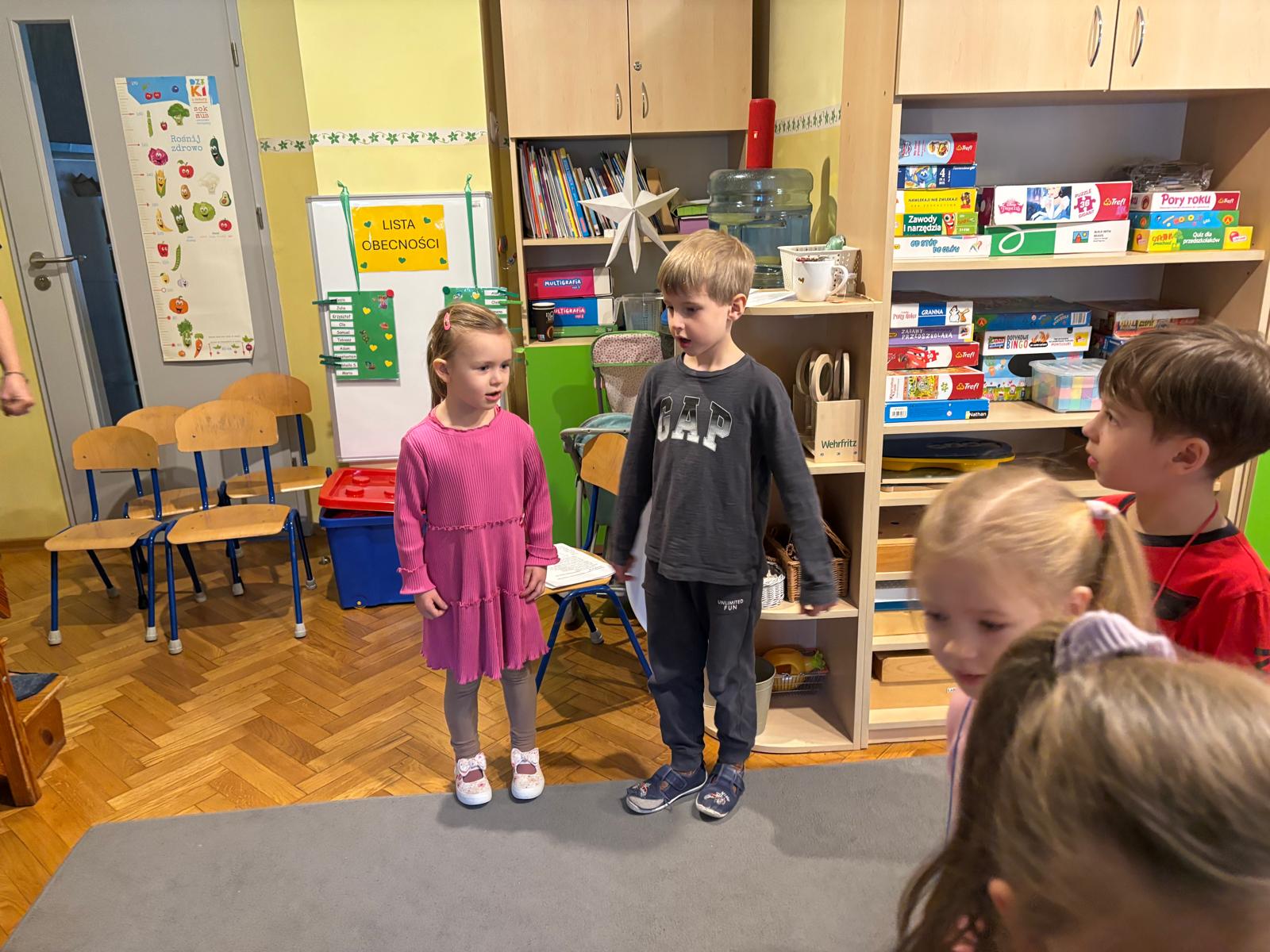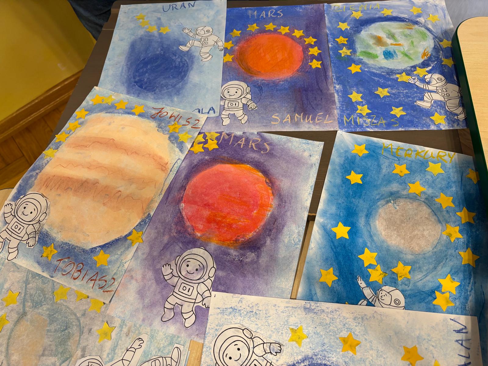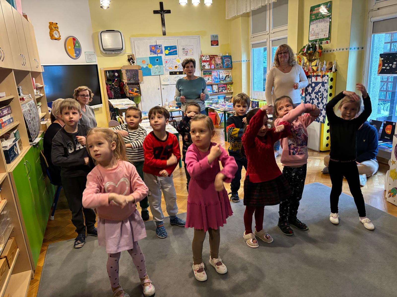 23 stycznia przed południem salę najstarszej grupy wypełnił gwar i śmiech. A to za sprawą wizyty Średniaków ze swoimi Paniami. Powodem ich odwiedzin było zakończenie przez Starszaki trwającego 3 tygodnie projektu badawczego „Kosmos”. Chcąc się pochwalić efektami swojej pracy, zaprosiły na uroczyste zakończenie młodszych kolegów wraz z Paniami, Panią Dyrektor i Panią Logopedę. Na początku Pani Renatka opowiedziała zebranym gościom o tym, co się działo podczas tych minionych trzech tygodniu. A było o czym opowiadać…Starszaki wraz ze swoimi Paniami: były na wycieczce w KosmoParku, oglądały filmy naukowe, robiły rakiety z rolek, lunety i lornetki, witraże, szkicowały, rysowały historie własne związane z kosmosem, kalkowały planety, pokolorowały mnóstwo kolorowanek kosmicznych, wykonały kosmos w słoiku, eksperymentowały, stworzyły makietę układu słonecznego, zbudowały wielką rakietę z kartonu, razem z rodzicami przedstawiły różnymi technikami ulubione elementy kosmiczne, a na koniec przeprowadziły w przedszkolu ankietę sprawdzającą zainteresowania kosmiczne wszystkich dzieci i dorosłych .Uff- było tego trochę! Średniaki wykazały się dużą wiedzą na temat kosmosu podczas krótkiego quizu .Po części teoretycznej nadszedł czas na występ artystyczny Starszaków. Zaprezentowały piosenkę o układzie słonecznym, wierszyk o podróży kosmicznej , piosenkę o wyścigu planet ilustrowaną ruchem oraz zatańczyły taniec rakietowy:) Po oklaskach gości , Pani Ewa zaprosiła wszystkich dużych i małych do wspólnej kosmicznej zabawy. Najpierw tanecznym krokiem uczestnicy odbyli podróż na nieznane planety np. skoczkową, kurzową czy żabkową , a potem dzieci w trójeczkach zamieniały się w przerwie tańcowania w planety : Saturna, Jowisza, Marsa i Ziemię. Śmiechu było co nie miara:) Po krótkim oddechowym odpoczynku Starszaki zaprosiły gości do zwiedzania zgromadzonych eksponatów, by wreszcie na koniec wszyscy poczęstowali się kosmicznymi przekąskami czyli małymi planetkami i gwiazdkowymi pierniczkami- mniam! Było miło i wesoło, a wszyscy pożegnali się bardzo zadowoleni z kosmicznego spotkania:)
