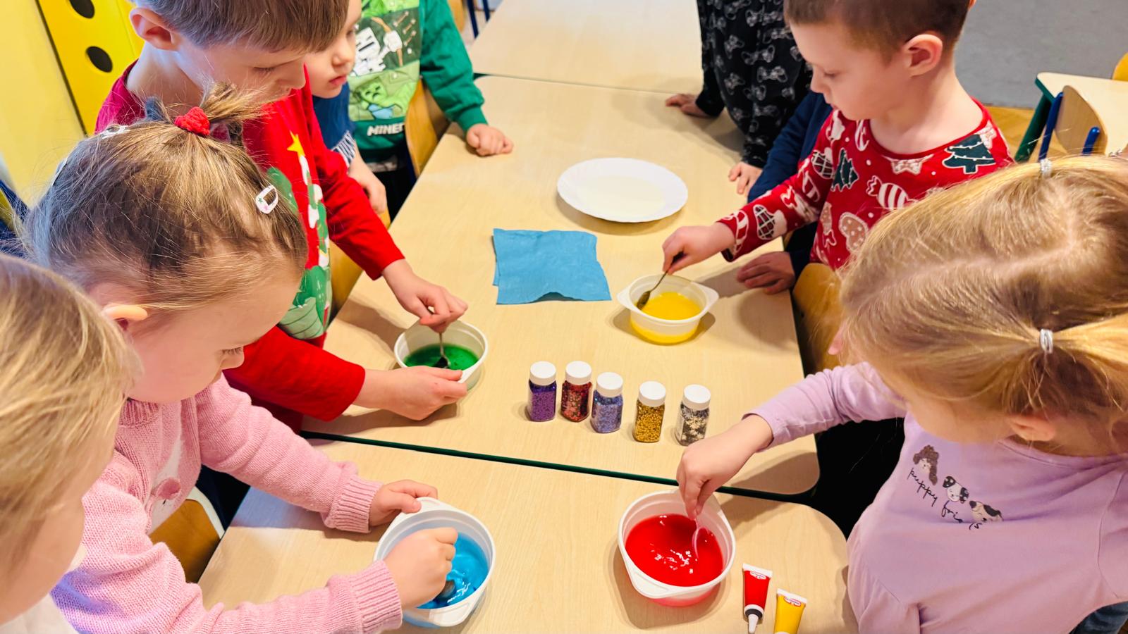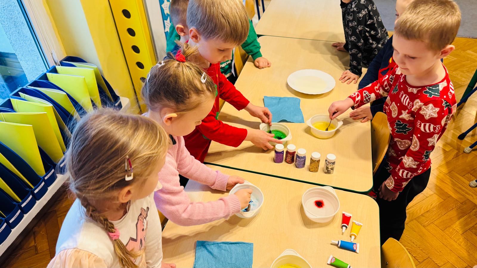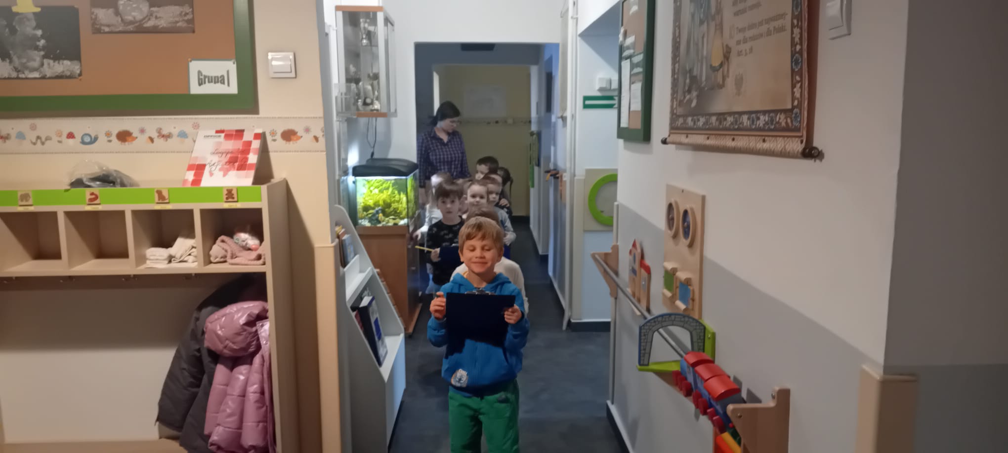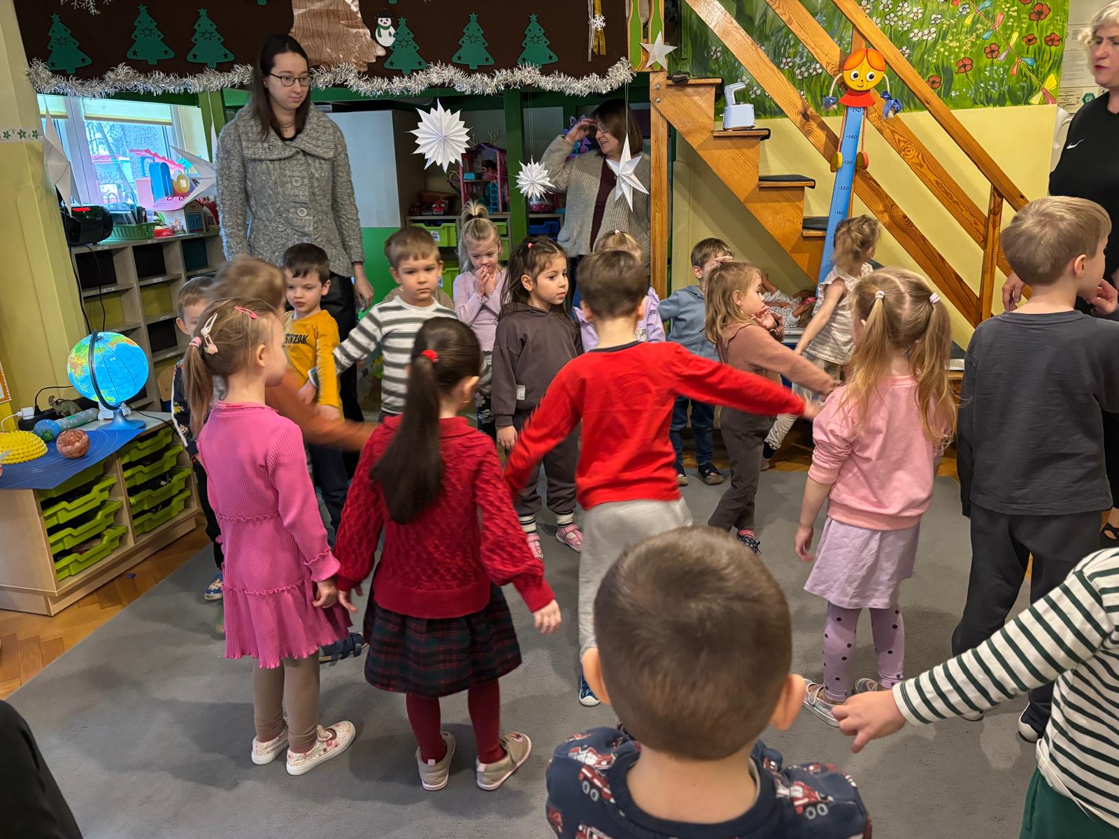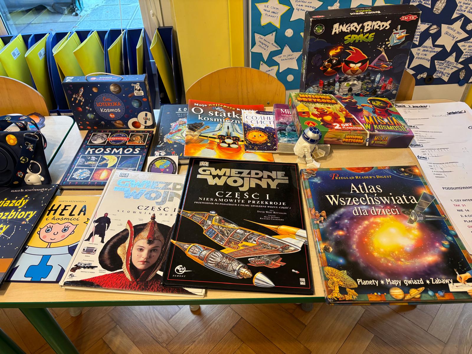 23 stycznia przed południem salę najstarszej grupy wypełnił gwar i śmiech. A to za sprawą wizyty Średniaków ze swoimi Paniami. Powodem ich odwiedzin było zakończenie przez Starszaki trwającego 3 tygodnie projektu badawczego „Kosmos”. Chcąc się pochwalić efektami swojej pracy, zaprosiły na uroczyste zakończenie młodszych kolegów wraz z Paniami, Panią Dyrektor i Panią Logopedę. Na początku Pani Renatka opowiedziała zebranym gościom o tym, co się działo podczas tych minionych trzech tygodniu. A było o czym opowiadać…Starszaki wraz ze swoimi Paniami: były na wycieczce w KosmoParku, oglądały filmy naukowe, robiły rakiety z rolek, lunety i lornetki, witraże, szkicowały, rysowały historie własne związane z kosmosem, kalkowały planety, pokolorowały mnóstwo kolorowanek kosmicznych, wykonały kosmos w słoiku, eksperymentowały, stworzyły makietę układu słonecznego, zbudowały wielką rakietę z kartonu, razem z rodzicami przedstawiły różnymi technikami ulubione elementy kosmiczne, a na koniec przeprowadziły w przedszkolu ankietę sprawdzającą zainteresowania kosmiczne wszystkich dzieci i dorosłych .Uff- było tego trochę! Średniaki wykazały się dużą wiedzą na temat kosmosu podczas krótkiego quizu .Po części teoretycznej nadszedł czas na występ artystyczny Starszaków. Zaprezentowały piosenkę o układzie słonecznym, wierszyk o podróży kosmicznej , piosenkę o wyścigu planet ilustrowaną ruchem oraz zatańczyły taniec rakietowy:) Po oklaskach gości , Pani Ewa zaprosiła wszystkich dużych i małych do wspólnej kosmicznej zabawy. Najpierw tanecznym krokiem uczestnicy odbyli podróż na nieznane planety np. skoczkową, kurzową czy żabkową , a potem dzieci w trójeczkach zamieniały się w przerwie tańcowania w planety : Saturna, Jowisza, Marsa i Ziemię. Śmiechu było co nie miara:) Po krótkim oddechowym odpoczynku Starszaki zaprosiły gości do zwiedzania zgromadzonych eksponatów, by wreszcie na koniec wszyscy poczęstowali się kosmicznymi przekąskami czyli małymi planetkami i gwiazdkowymi pierniczkami- mniam! Było miło i wesoło, a wszyscy pożegnali się bardzo zadowoleni z kosmicznego spotkania:)
