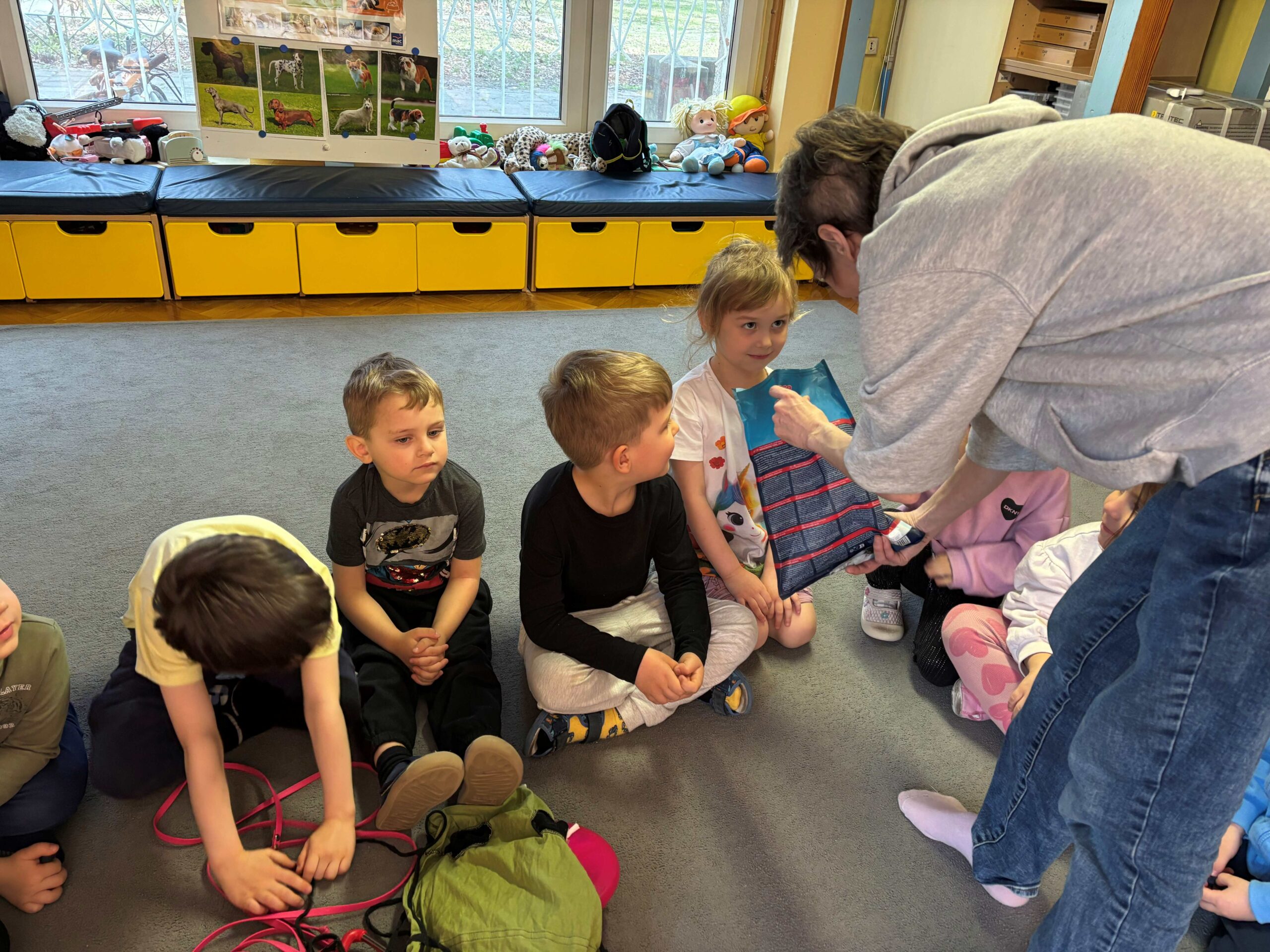 W piątek 10 kwietnia w przedszkolu pojawiła się Pani Ania razem z suczką rasy labrador – Larą. W każdej grupie odbyły się zajęcia z sympatycznym pieskiem. Dzieci dowiedziały się wielu ciekawych rzeczy na temat psów. Oglądały różne akcesoria związane z pielęgnacją i opieką nad zwierzakiem. Starały się odgadnąć, do czego one służą. Najwięcej radości wzbudziło karmienie suczki jej ulubionymi przysmakami. I oczywiście głaskanie Lary. Bardzo dziękujemy Pani Ani za interesujące warsztaty.